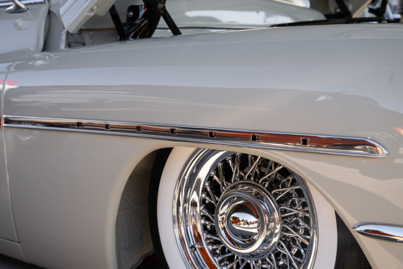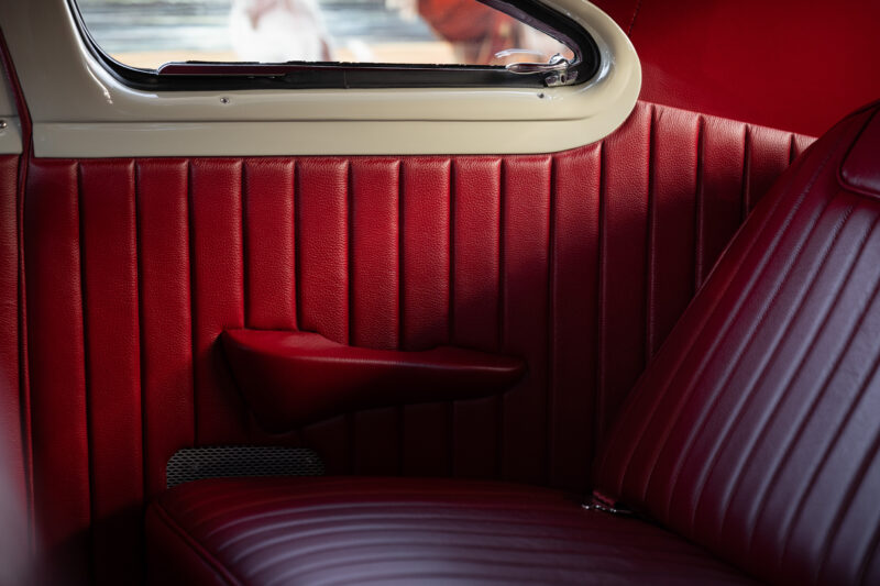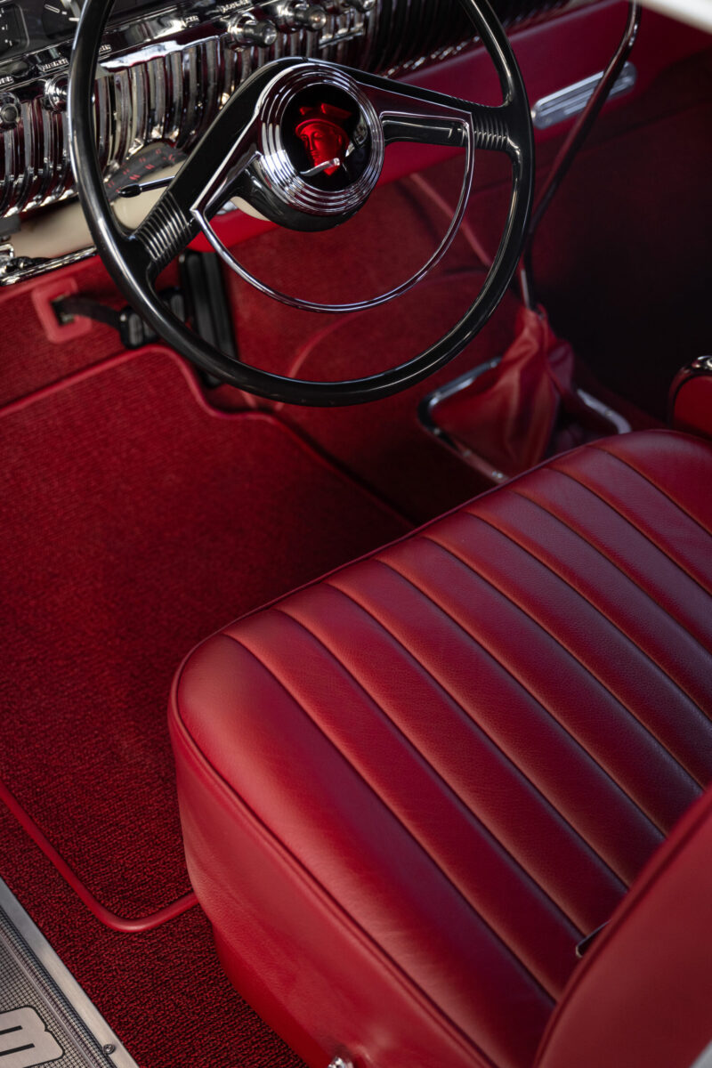 Now it was time to give the interior a new look. To recapture the glory of the ’51, Manley selected Moore & Giles Tribeca Chianti. The deep red creates a vision of total luxury, blending seamlessly with the dashboard, gauges, and even the red Mercury emblem on the steering wheel. All in all, a perfect fusion.
