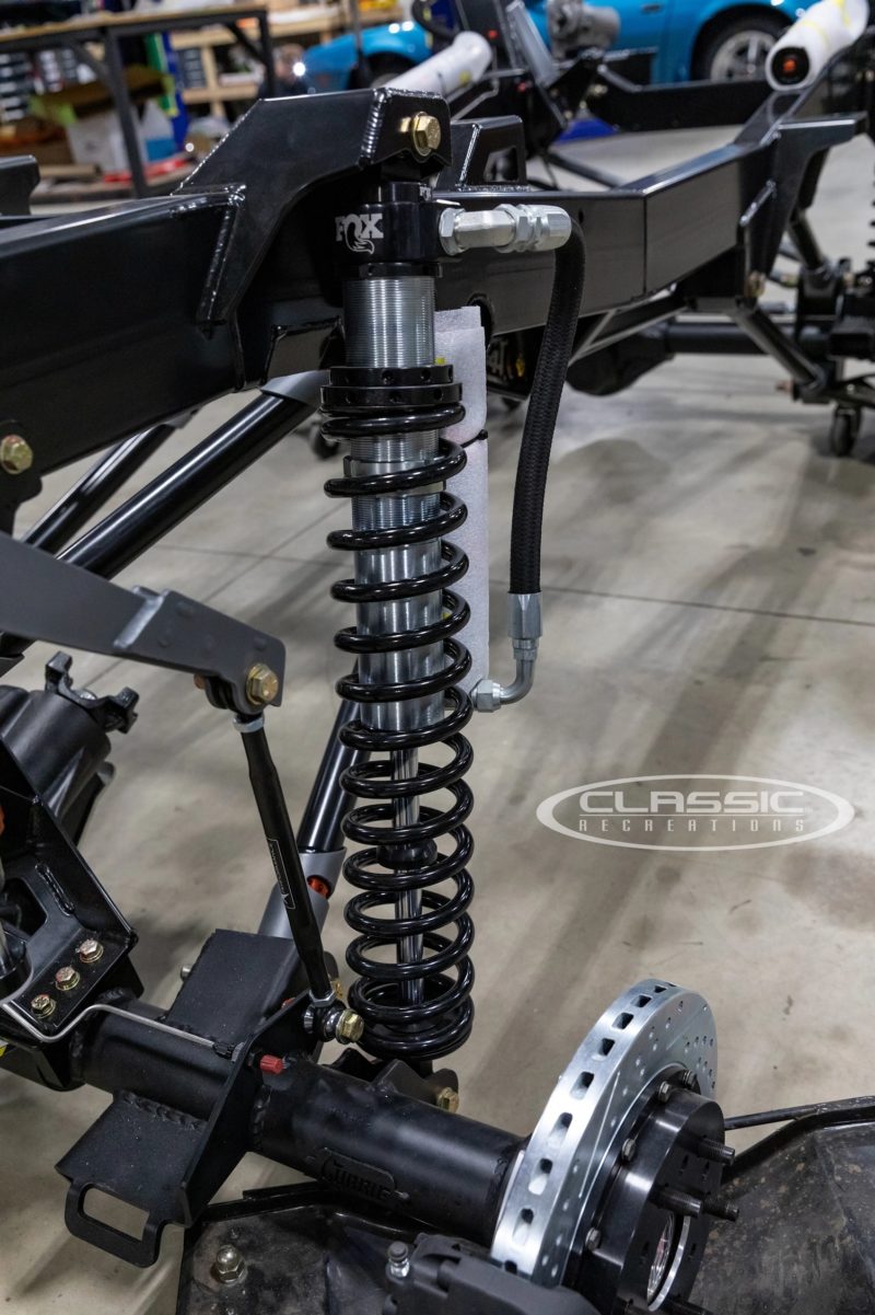 The Classic Recreations Ford Bronco features Fox Racing 2.5 Factory Race Series coilovers tuned with RS-specific valving. It is also equipped with RS Fast Link 1.75-inch front and rear 4-bars with X-axis sealed bearing assemblies, an RS Billet Sway Bar Arm Upgrade, front and rear, and an upgraded Currie Rock Jock High Pinion Dana 44 front and 60 rear axles. To stabilize the suspension, Classic Recreations opted for a Fox ATS Steering Stabilizer Kit and Fox Factory 2.0 Bump Stop Kit.