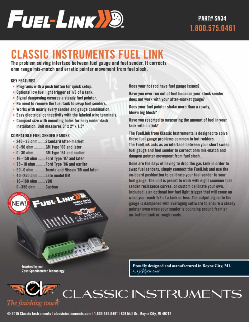 It used to be that you'd have to drop the tank, pull the sending unit and check the resistance to make sure it was compatible with your gauge. Classic Instruments has a better solution with their new Fuel-Link. This compact device acts an interface between your short sweep fuel gauge and the sending unit to correct mis-matched applications.