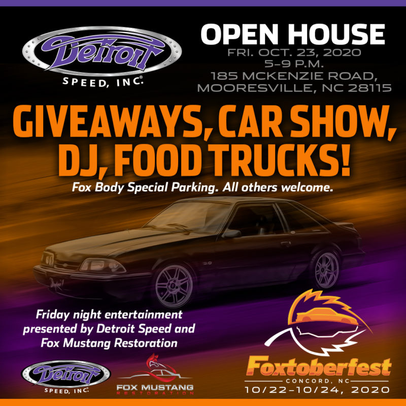 Mooresville, NC (March 4th, 2020) - Open House will return in 2020 with a twist! Detroit Speed will be partnering with Fox Mustang Restoration and Foxtoberfest to host the Friday night entertainment on Friday, October 23, 2020 from 5-9PM EST. There will be designated Fox Body parking, however, all classics and hot rods will be welcome. We will have a DJ, giveaways and new for 2020, we will have food and dessert trucks on site!