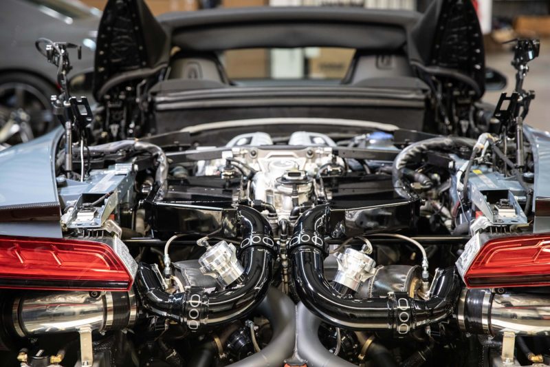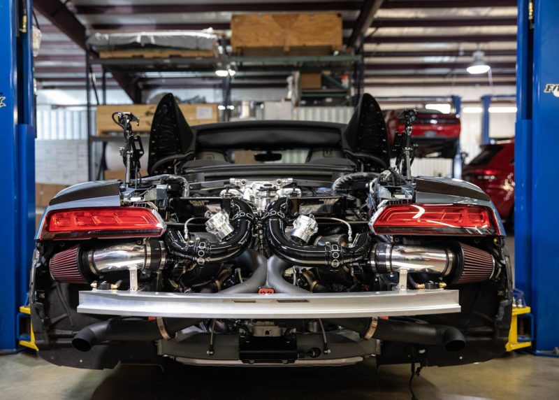 A good example is the Audi R8 V10 Plus. At 562 HP, the naturally aspirated Audi R8 V10 is no slouch. It does zero to sixty in less than four seconds. HPE adds two Precision twin ball turbochargers to take the V10 to a whopping 912 HP, blasting from 0 – 60 mph in 2.6 seconds.