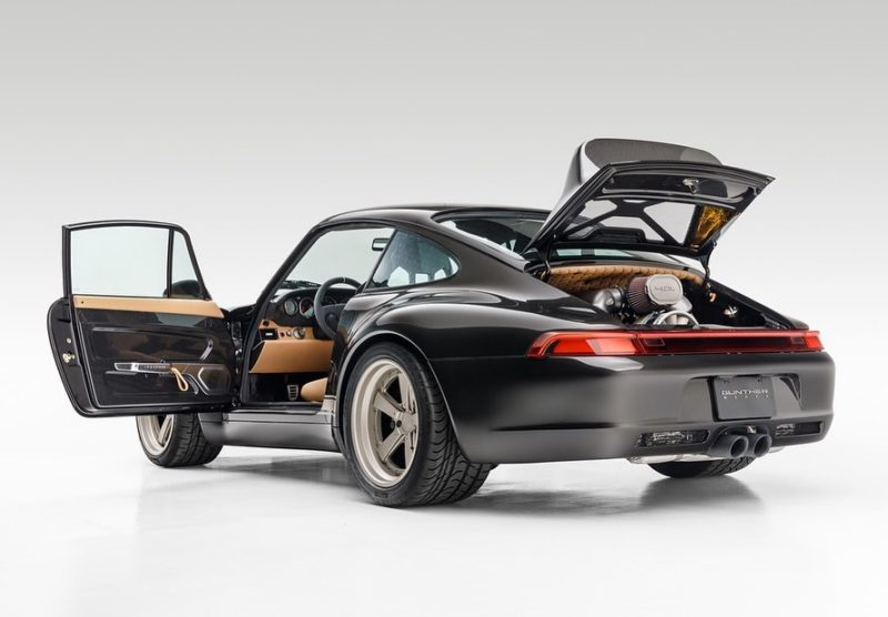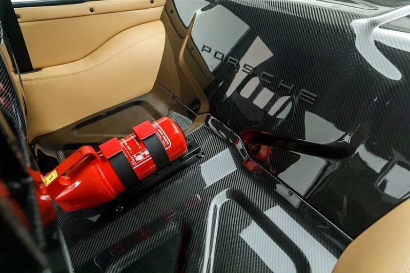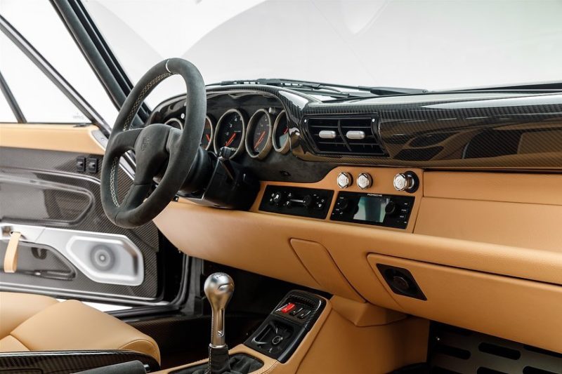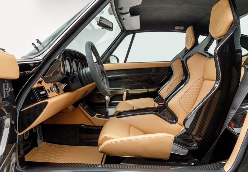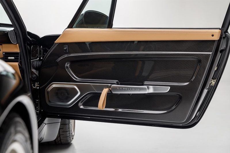 When looked at in natural light setting, carbon fiber has light tones of brown in its color make up. To match that unique blend of colors we created a bespoke black paint formulated to match the carbon fiber tones. A metallic pearlescent paint, incorporating gold flakes, was created to match the color of carbon in natural light but which looks black in the shade, we have christened it “Carbon Noire”.The front hood, roof & ducktail are left in the exposed carbon fiber of the original panels with the rest of the car in the Carbon Noire created especially for this car. Where the carbon meets the Noire, on the roof for example, it has been hand blended by our artisans. Exposed carbon fiber details are also visible in the snorkels on the front bumper, where you will also find our new optional aluminum honeycomb mesh grill in black finish. Similar to the mesh used on the new factory GT cars, this is the first commission to have this new option.