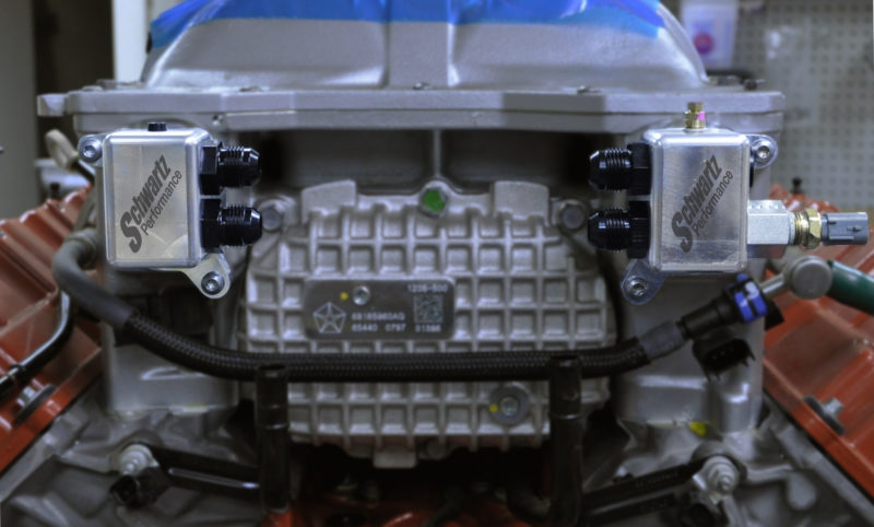 With several Hellcat swaps to their credit, the team at Schwartz Performance decided to resolve this issue with their new Low Profile Intercooler Manifolds. Schwartz designed a very shallow housing that can mount to either side of the engine and directs the coolant through a pair of -10 AN fittings. This design, which is over an inch leaner than the obtuse factory units, allows the intercooler hoses to be routed on either side of the engine so best suit your application. The Billet Manifolds retain outlets for the factory temp sensor and bleeder valve for original functionality.