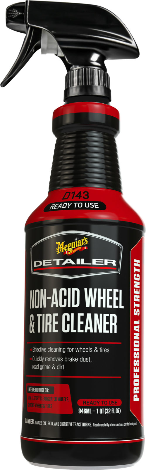 Meguiar’s® Non-Acid Wheel & Tire Cleaner is a fast and effective, non-acid based cleaner to swiftly remove brake dust, road grime, grease and dirt from factory OEM clear coated, painted and chrome wheels. Simply spray on, lightly agitate and hose off and get wheels and tires quickly cleaned and looking “like-new”.