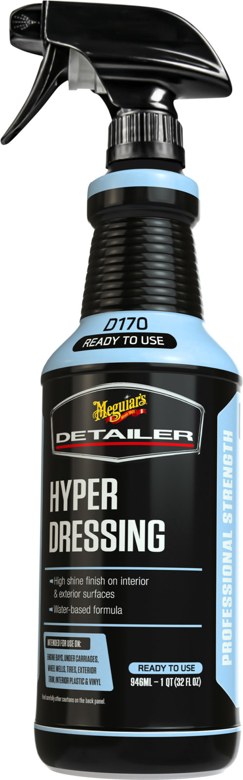 Meguiar’s® Hyper Dressing is an extremely versatile, water-based formula that delivers a rich, high shine on both interior and exterior non-painted rubber, plastic and vinyl surfaces. This premium, pro-grade product is the perfect choice on a variety of surfaces including dashboards, door panels, tires, trim, wheel wells and more! Simply spray on, wipe off and you’re done!