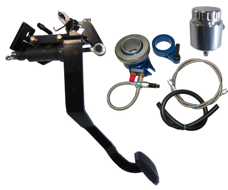 The new HYDRAMAX kit includes a master cylinder, clutch pedal, lines and a billet HYDRAMAX hydraulic slave cylinder bearing. The conical slave cylinder is pre-bled, dual sealed and comes with shims to adjust the distance to the clutch fingers for any type of clutch set-up. Included is a billet reservoir to finish out the install. These kits work with any TREMEC transmission including the T5, TKO/TKX and T-56 Magnum 6-speed.