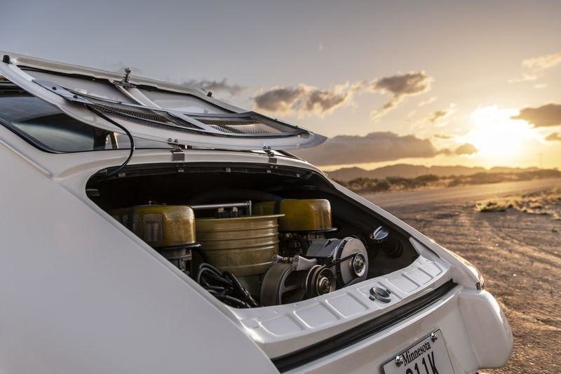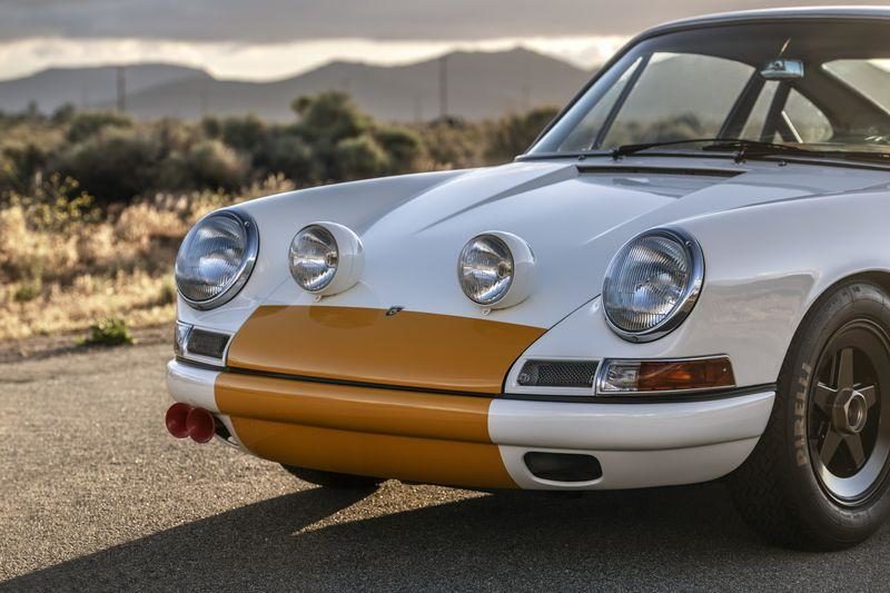 The 911K acknowledges its motorsports brethren with distinct cues such as the amber fiberglass dashcap, Porsche Light Ivory paint with signal-yellow accent and hand-painted Mobil Pegasus for that authentic touch.