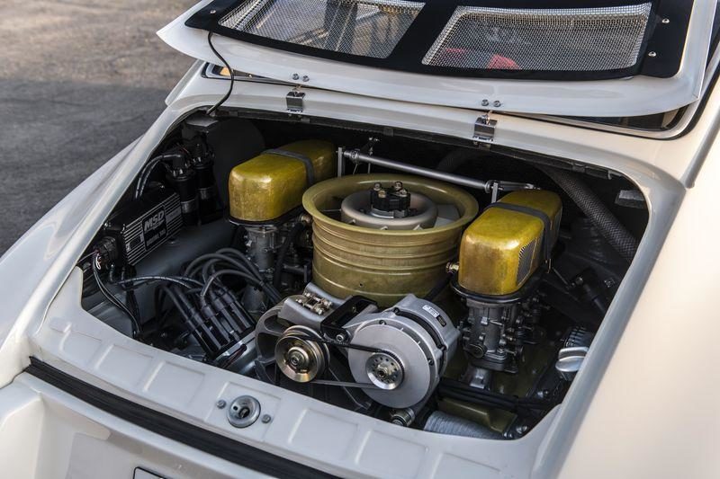 Power for the 911K comes from a later 2.5-liter twin-plug 911 engine. The hot-rodded six-cylinder powerplant produces 190 horsepower with the help of an MSD brain, Weber 40 IDA 3C carburetors, and 908-style cookie-cutter megaphones. Other details include a 935 flat cooling fan and shroud, hand-laid amber fiberglass airboxes, and a full-flow oil system with remote filter and cooler. A Fuel Safe fuel cell with through-fender competition filler feeds the engine.