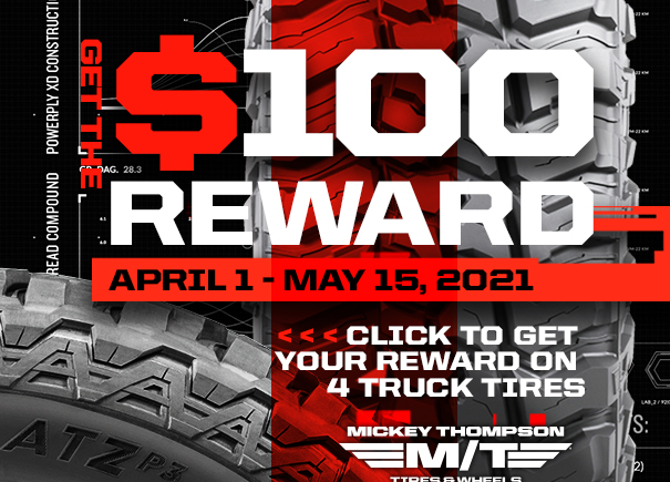 The reward applies to the purchase of four new Mickey Thompson Baja ATZ P3, Baja MTZ P3, Baja Boss® M/T or Baja Boss® A/T tires between April 1-May 15, 2021. Available only in the U.S., the rewards program offers consumers a $100 rebate in the form of a prepaid card.