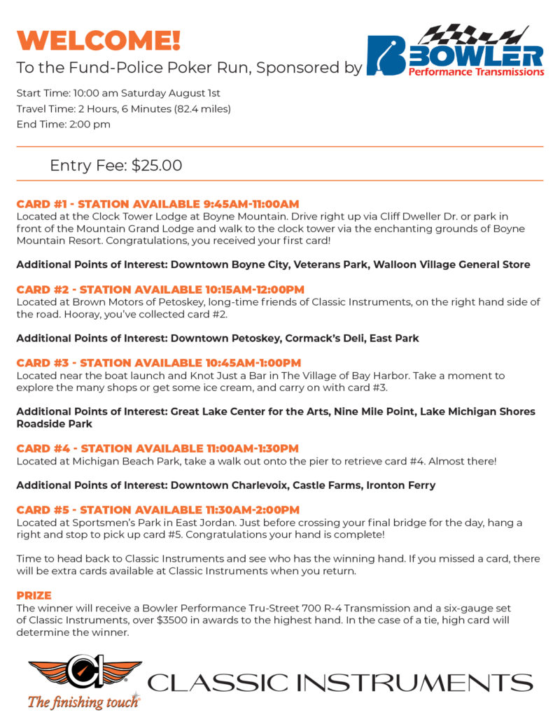 The 20th Annual Classic Instruments/NSRA Appreciation Day is a GO! Classic Instruments added a Poker Run to help move the crowds around and Raise Money For the Police in the 1st Annual FUND-POLICE Poker Run Sponsored by Bowler Transmission. Come on out and have some fun while supporting a great cause.