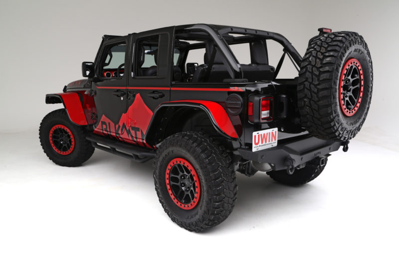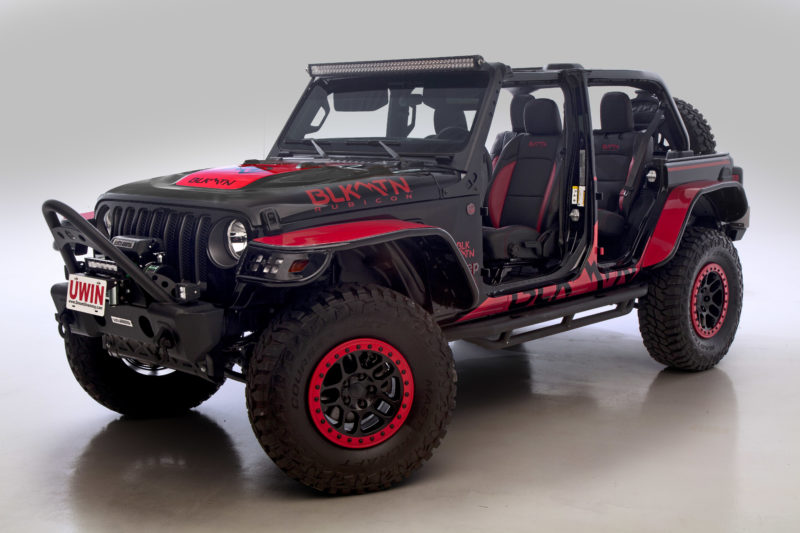 Notable features include a Jeep Rubicon hood, three-piece hardtop, seating for five, black leather/red stitching upholstery, and BLKMTN LED light bars, Mopar beadlock wheels, 8,000-lb winch, 4-inch lift kit, trailer tow and a whole lot more.