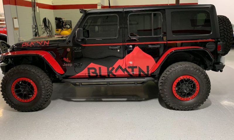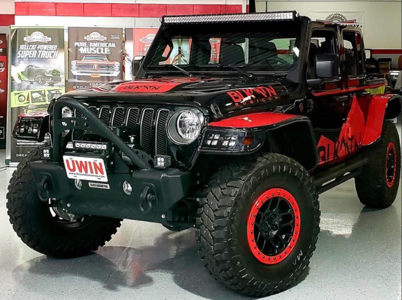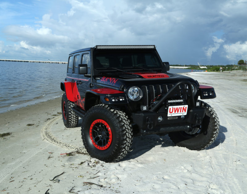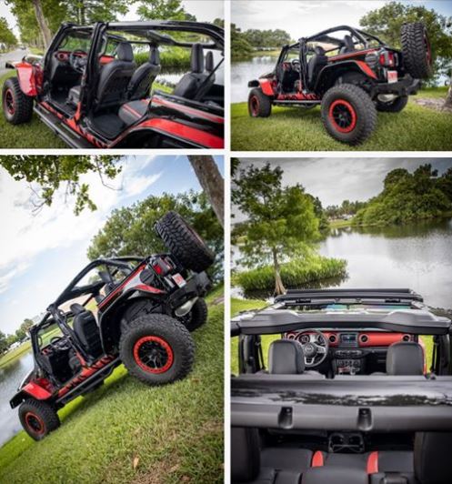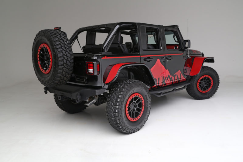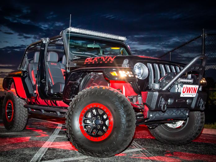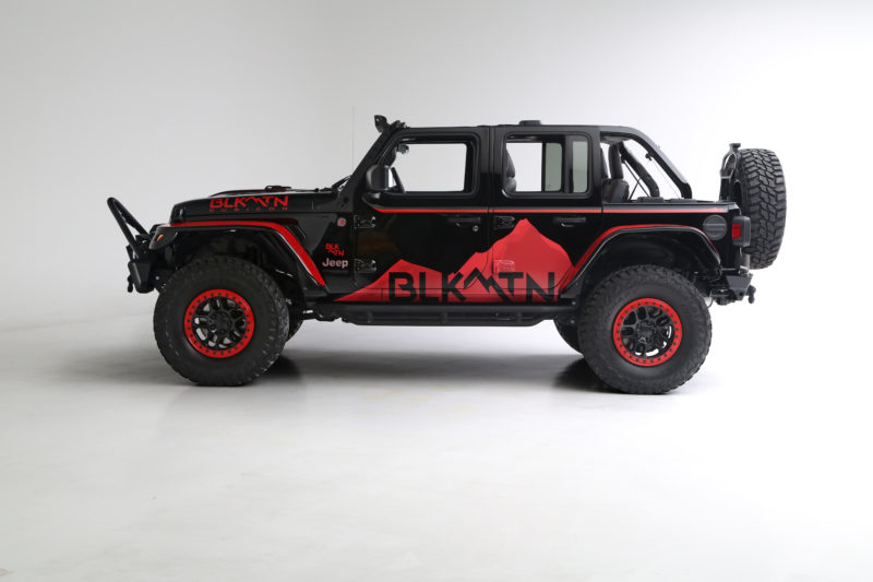 Notable features include a Jeep Rubicon hood, three-piece hardtop, seating for five, black leather/red stitching upholstery, premium low-back bucket seats, Stinger front recovery bumper with a fog light and D-ring mounts, three tube side bars, rear recovery bumper, BLKMTN LED light bars, Mopar beadlock wheels, 8,000-lb winch, 4-inch lift kit, trailer tow, Superchips handheld tuning and a whole lot more.