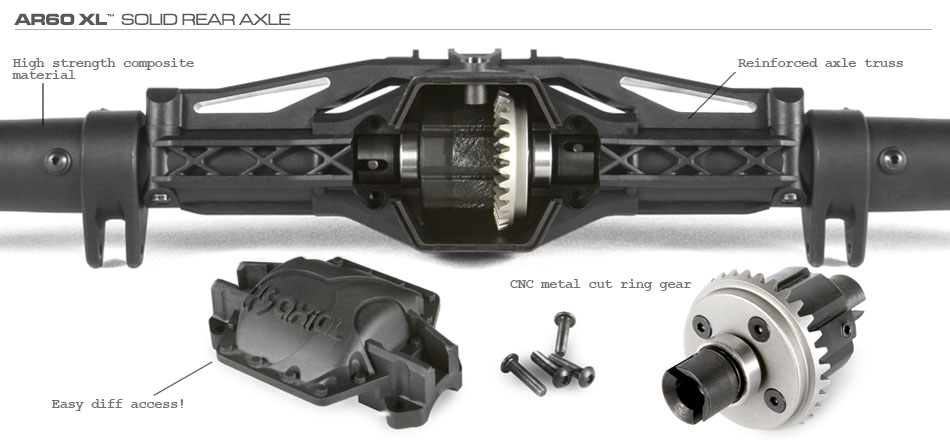 The AR60 XL™ solid rear axle is constructed from high strength composite material which has a low flex rate but is not as brittle as standard glass filled nylon. An added reinforced axle truss strengthens the rear axle by reducing flex and by distributing the force of potentially damaging impacts. The combination of our axles and a true 4-link suspension gives you optimal performance for any terrain with the look of a real 1:1 vehicle. Maintenance is easy - simply remove four screws to access the rear differential.