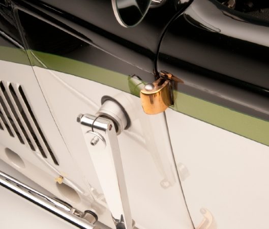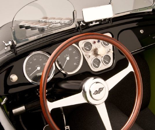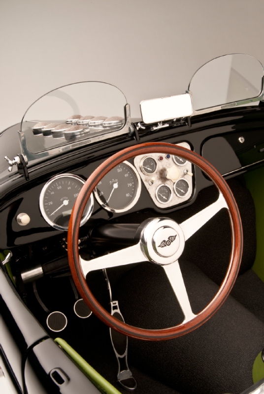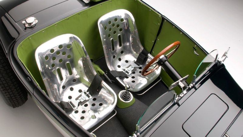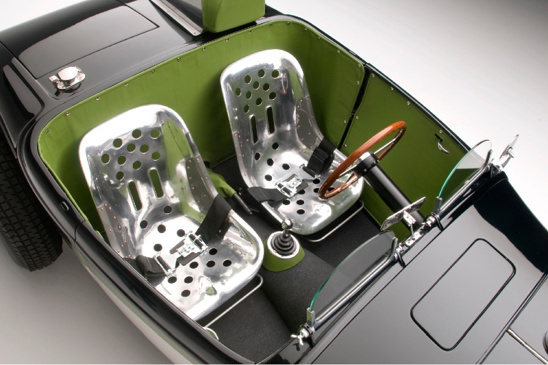 Replica Porsche 356 GT aluminum seats, polished helmet fairing, Brooklands aeroscreens, and the Spartan interior lends to the race car vibe that belies the glamorous overall style.