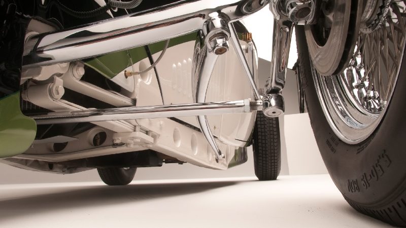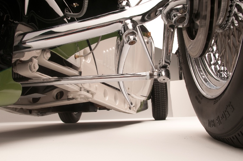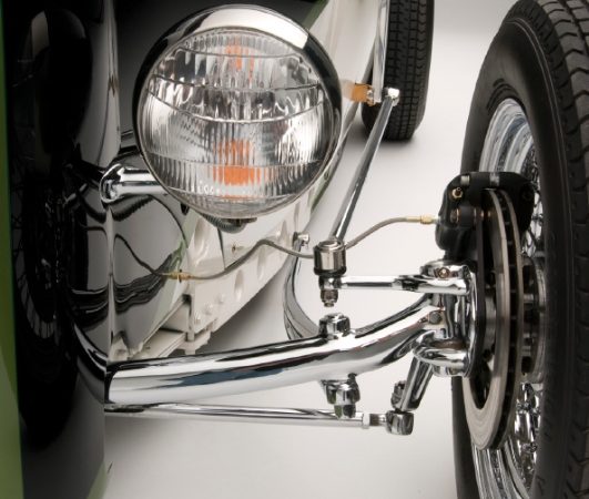 The ’32 Ford body blends in well with a Miller-style nose and custom hood. The lightened frame is kicked-up and tapered and punctuated in the front by totally unique twin quarter-elliptical springs. The front suspension totally enclosed inside the nose, sits on chrome radius artwork of axles and steering rods.