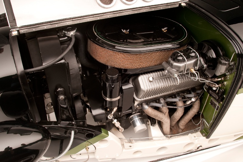 The small block Ford V8 is bored and stroked to 347 cubic inches. A Tremec 5-speed transmission runs through a Moser differential to the beautiful 20-inch, 72-spoke wire wheels.