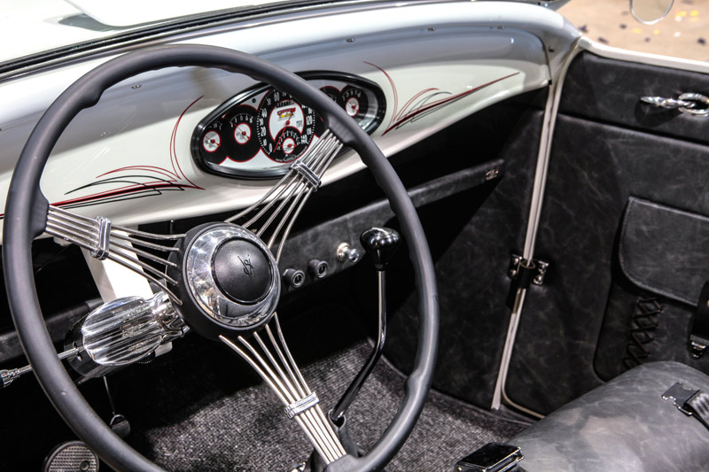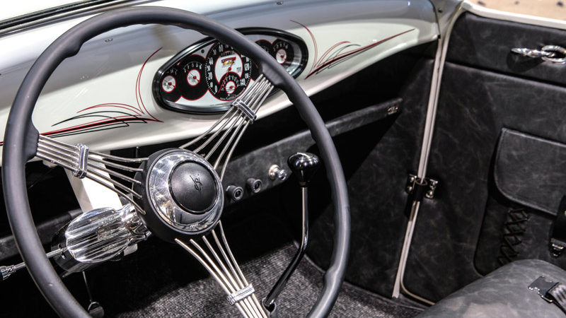 Mike Goldman Customs of Meridian, Mississippi will steward the build. The Brookville Roadster-bodied ’32 Ford hi-boy roadster will ride on a TCI Chassis with a 4” dropped axle and 4-link rear. Get-up and go will be provided by an Edelbrock Performer 310 Triple Deuce crate engine. It will be cloaked in PPG white with red & black graphics, and has a black, chopped canvas top and white steel wheels. It’s gonna look hot!