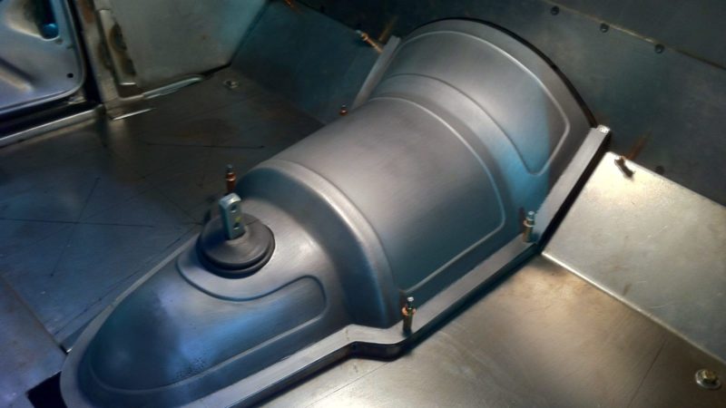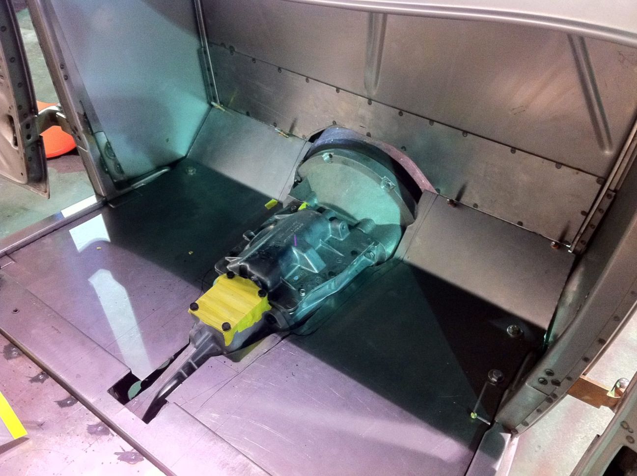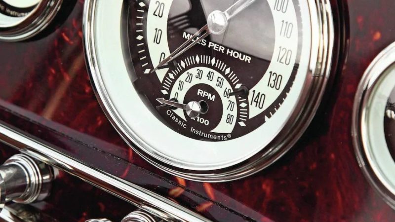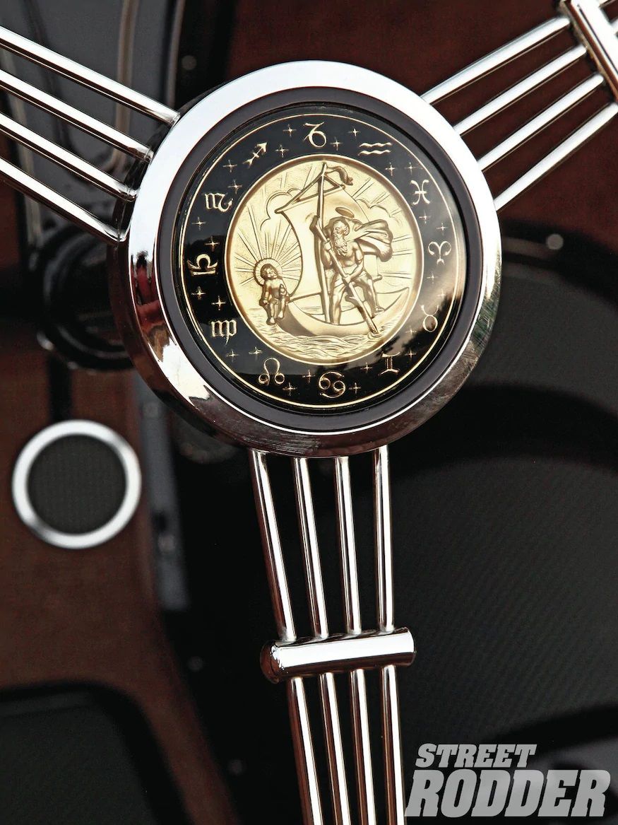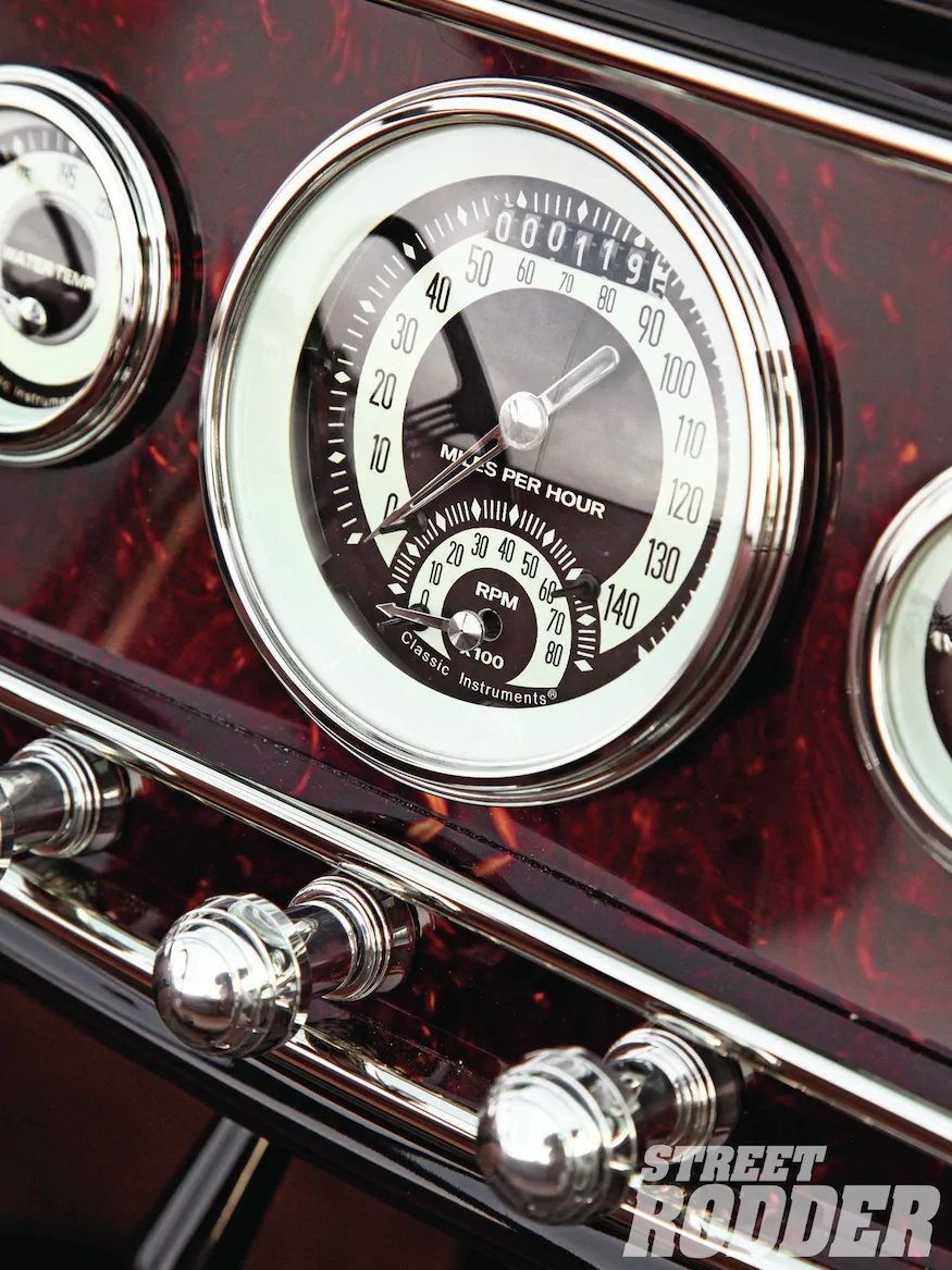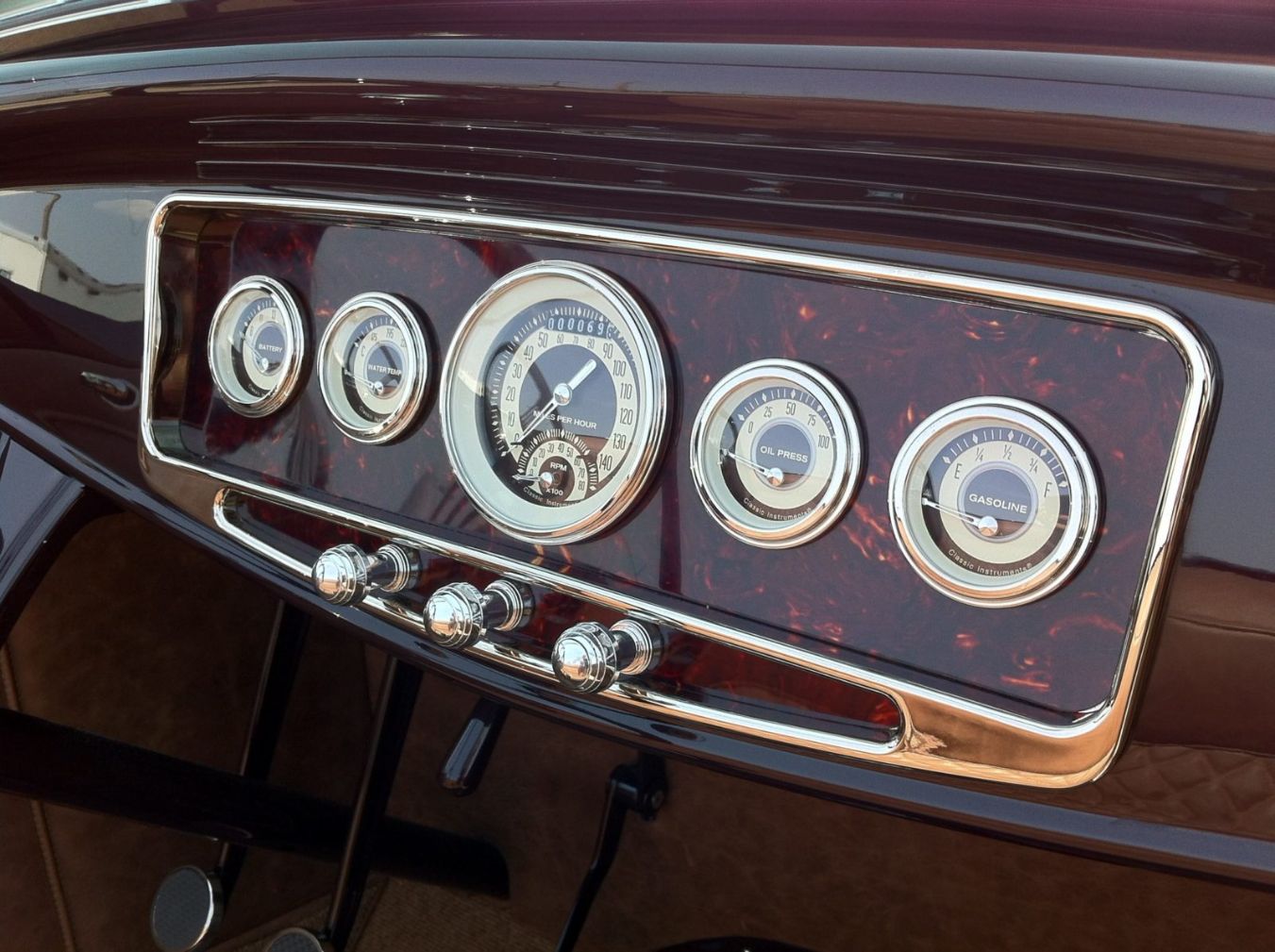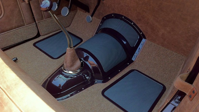 William and his good friend Billy Parker did the motor assembly and dialed it in to run like a top on his run in stand. Once the motor was at the shop we mated it to the Tremec T5 and painted the whole assembly flat brown. The hopped up flathead is monitored by the Classic Instruments gauges in the Goolsby Customs Traditionalist auburn style insert that was machined by William Shores.