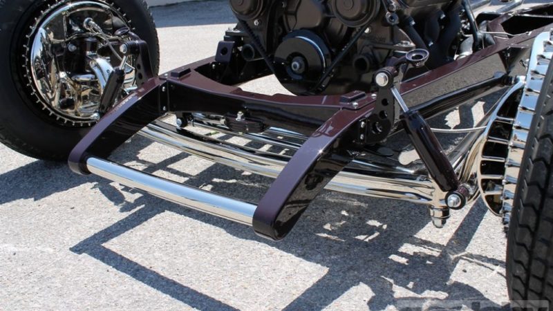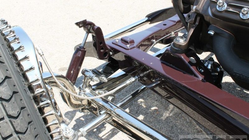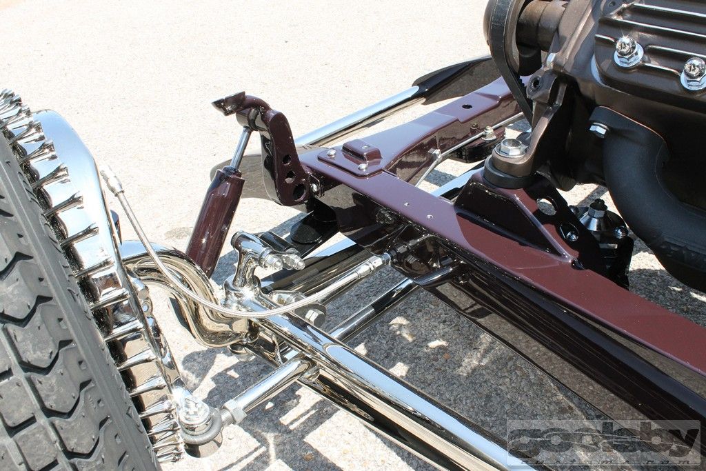 Power comes from a stroked ’53 model flathead with three strombergs on a Navarro intake and heads from Mike at H&H Flatheads.