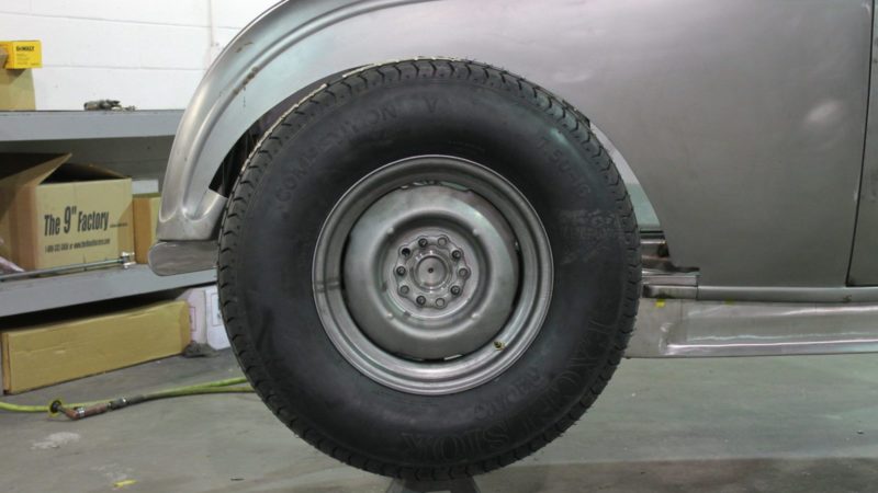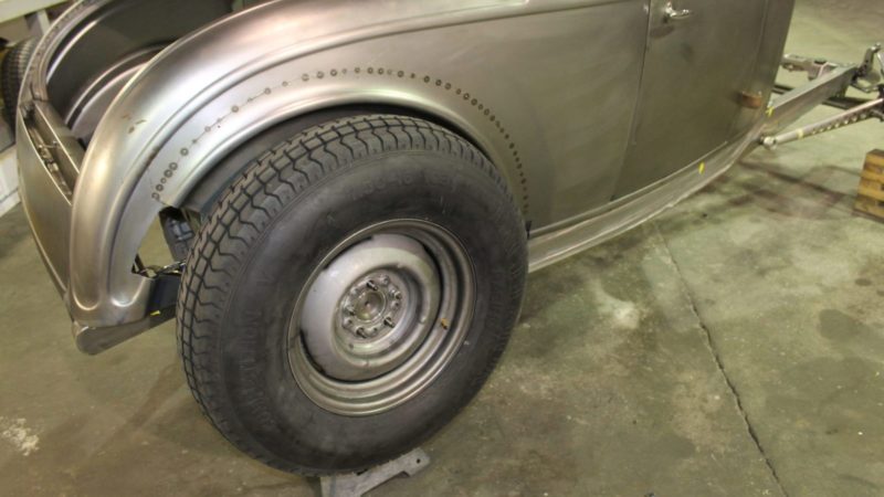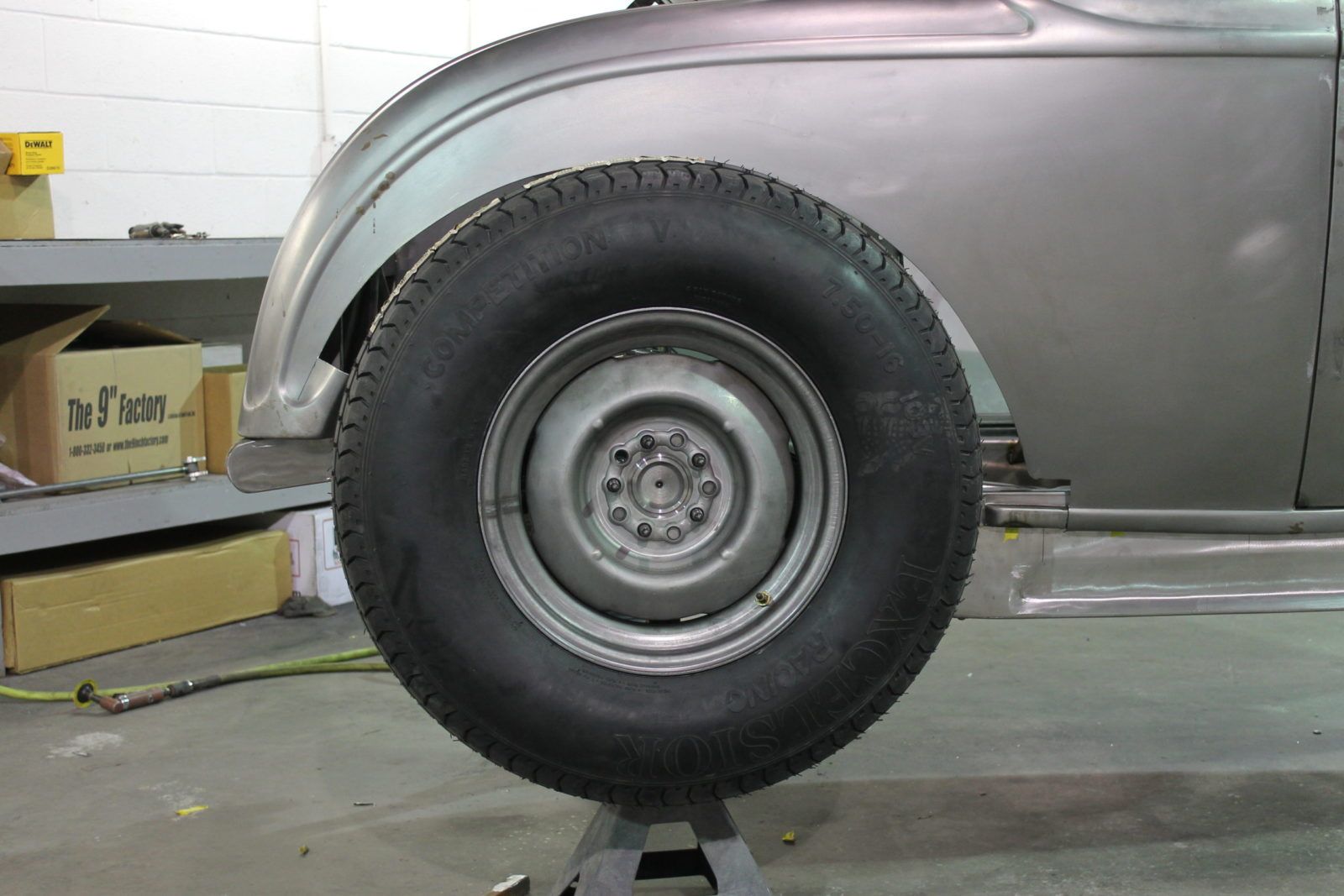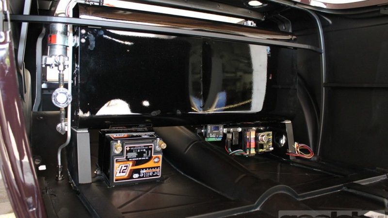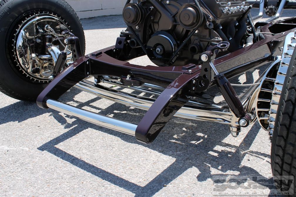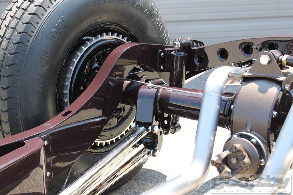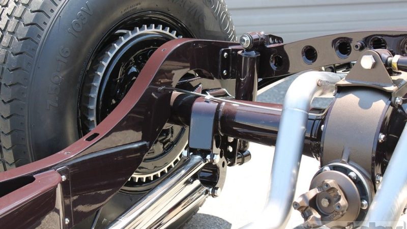 We started with a Brookville body and then called our buddies at the Roadster Shop and got them to build us a new traditionalist chassis complete with original style C-channel cross members and riveted hardware and mounts. The chassis is completed with a Winters V8 quick change rear end, 5″ dropped axle, and Perfection hot rod parts machined wishbones. For us to get that perfect stance the Goolsby Customs crew raised the rear wheel arches up 2″ and re radiused them to fit those Excelsior tires.