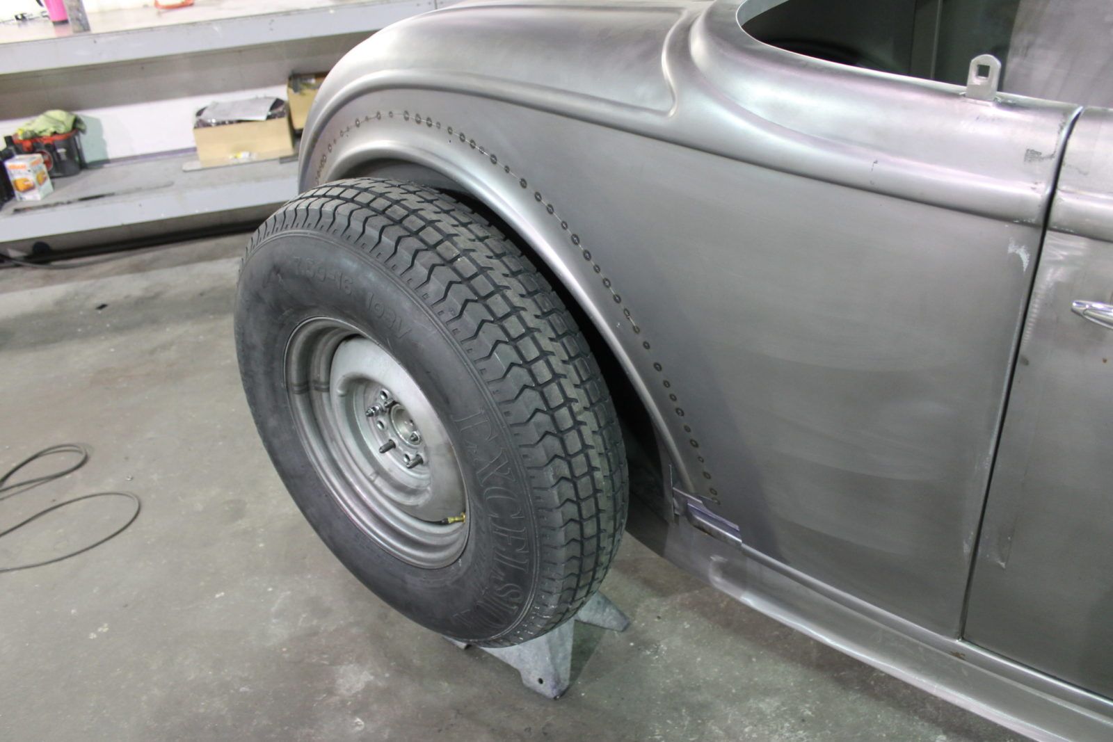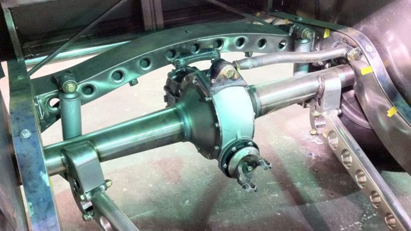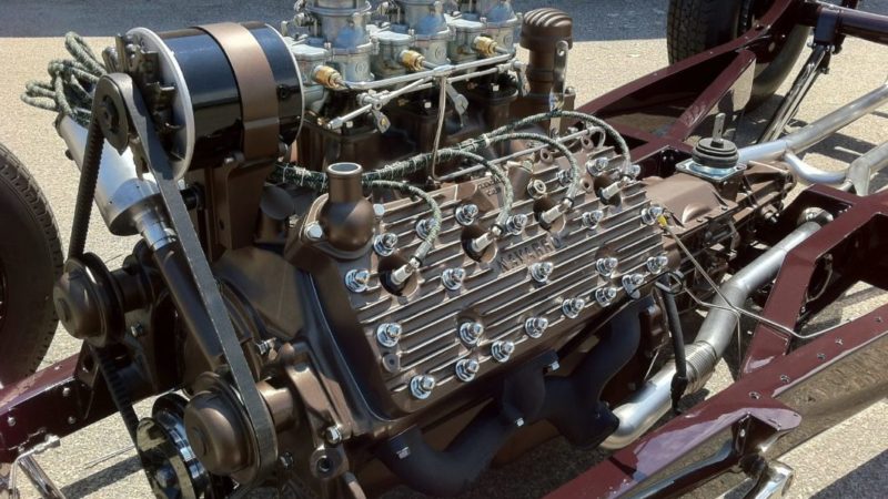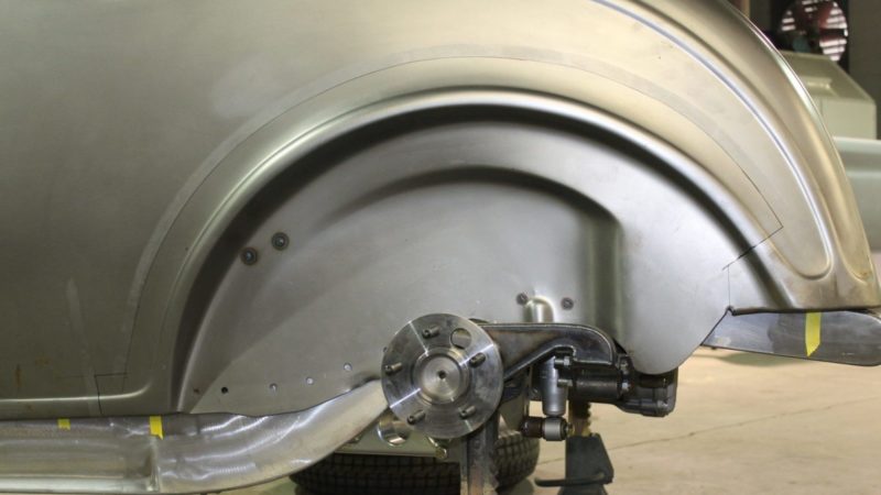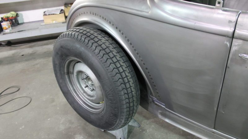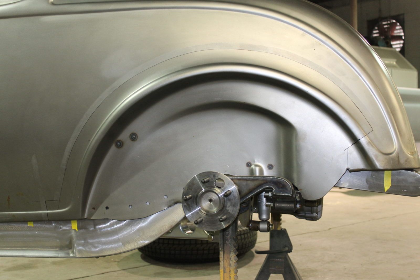 We started with a Brookville body and then called our buddies at the Roadster Shop and got them to build us a new traditionalist chassis complete with original style C-channel cross members and riveted hardware and mounts. The chassis is completed with a Winters V8 quick change rear end, 5″ dropped axle, and Perfection hot rod parts machined wishbones. For us to get that perfect stance the Goolsby Customs crew raised the rear wheel arches up 2″ and re radiused them to fit those Excelsior tires.