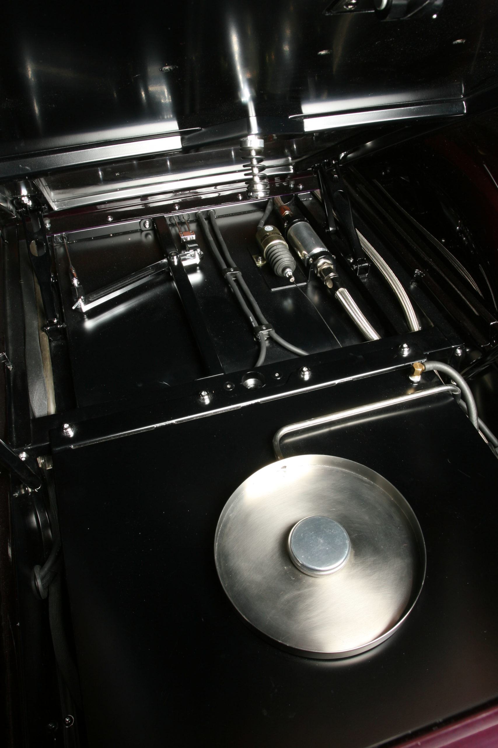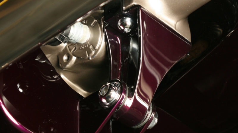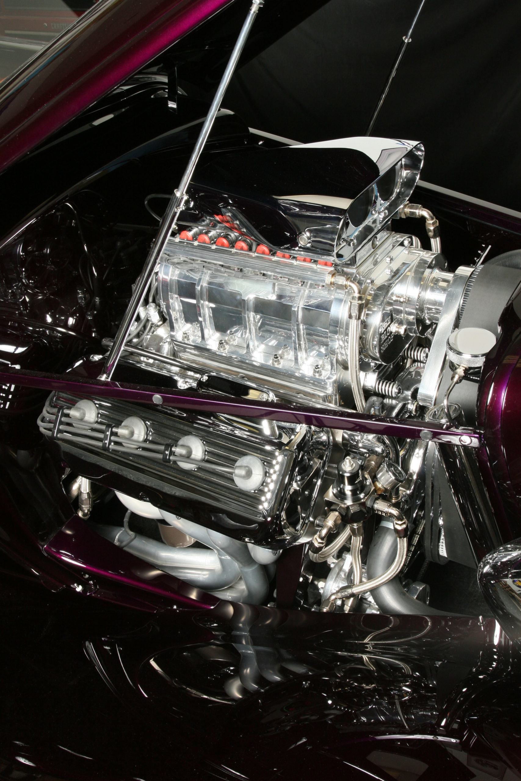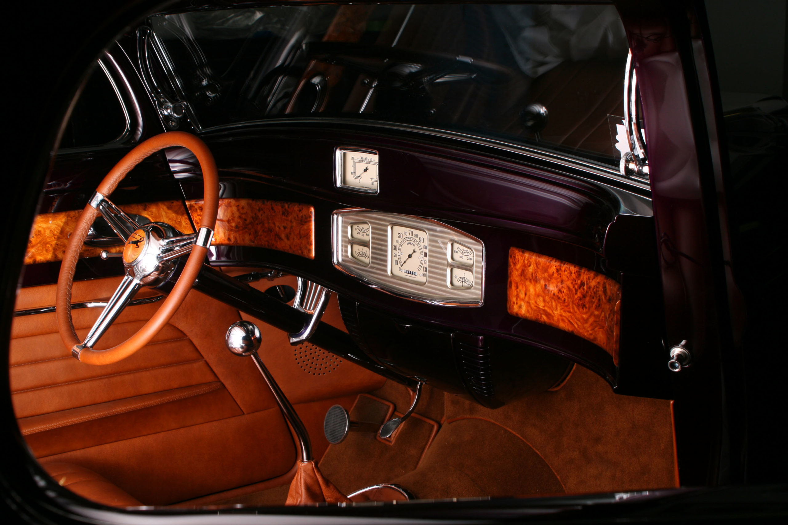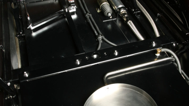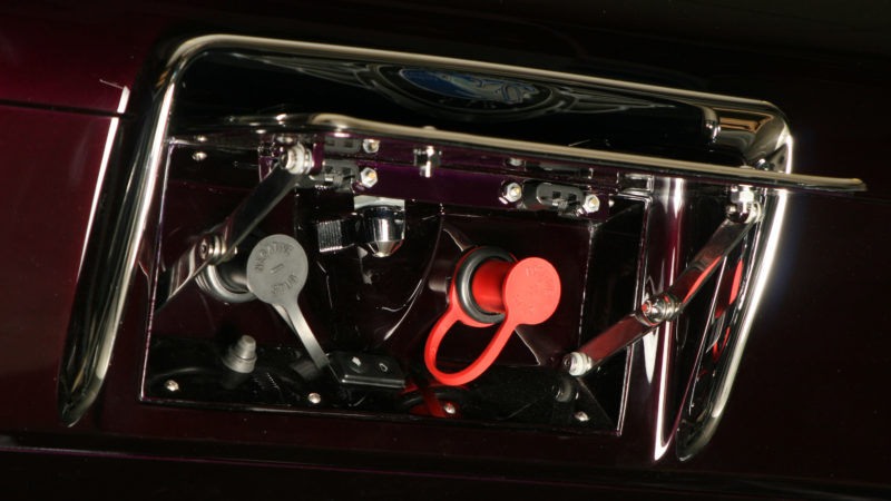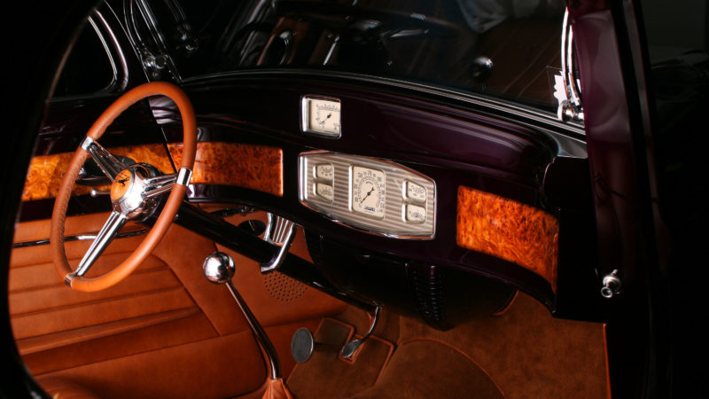 This 1933 Dodge had been a long labor of love for the renowned craftsmen at Steve’s Auto Restorations. Strictly adhering to the designs of Chris Ito, Steve’s metal shapers formed over 95% of the body from steel. All of the chrome trim was hand formed including the front bumper which is formed from seven separate pieces, metal finished and chromed to perfection. The blown Chrysler 392 Hemi lurking under the hood adds an irreverent touch of “hot rod” to the overall sophisticated design. What was once a work horse is now a rolling metal tapestry of elegance and flawless design execution.