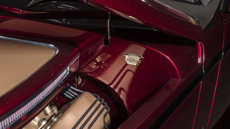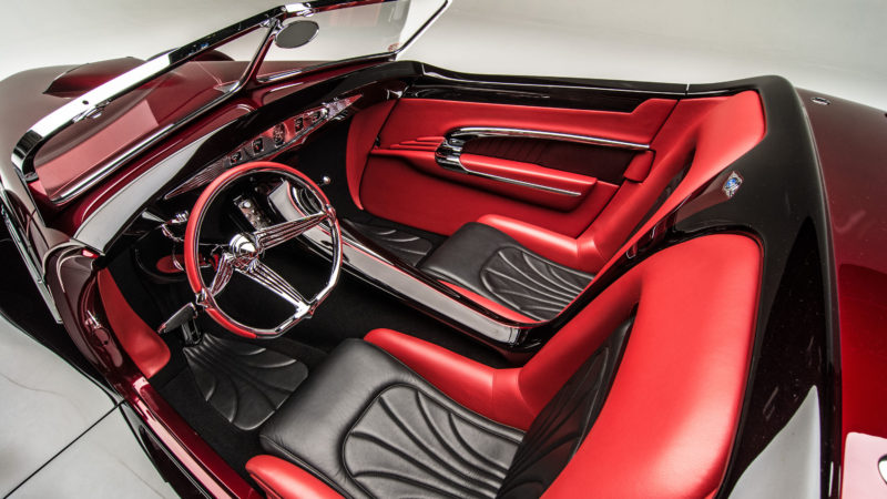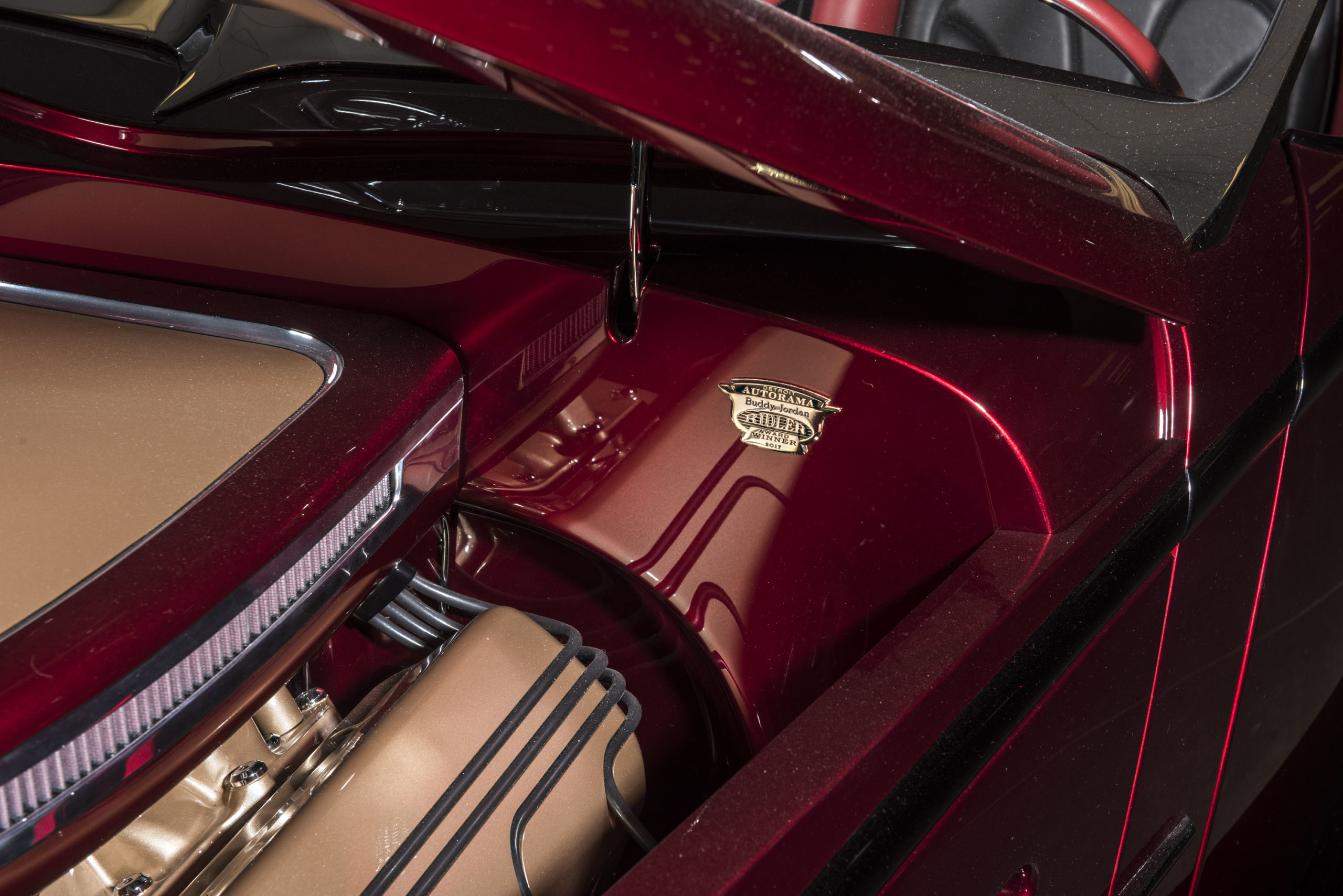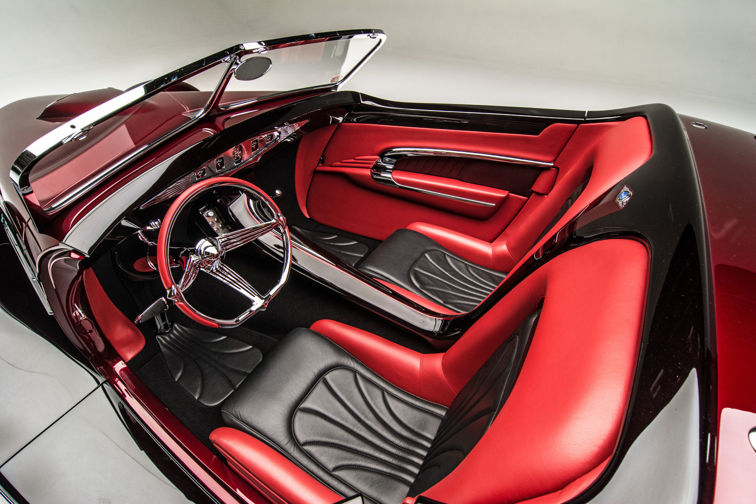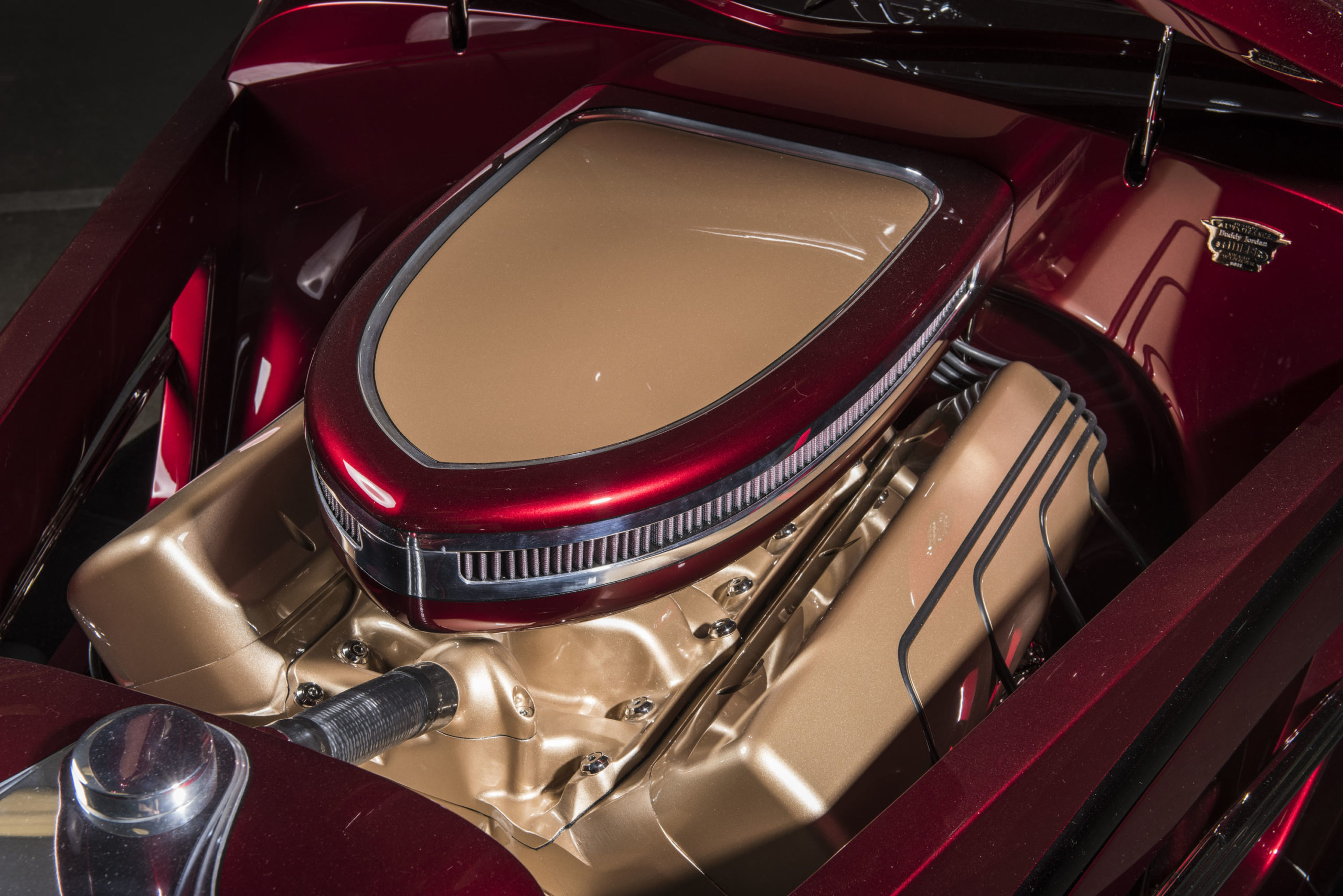 This rolling example of coach built artistry was hand crafted by the talented crew at Steve’s Auto Restorations specifically to compete in the 2017 Detroit Autorama. Appropriately christened as the Renaissance Roadster, this creation was never a car to begin with. It was created from a designer’s rendering by pen and pencil and the computer. Approximately 95% of the car is hand built. All body, fender and hardtop sheet metal is built “in house” out of hand formed aluminum. The chassis was built “in house” out of sheet steel and round tubing. All of the chrome plated trim was hand built either out of brass, steel or aluminum. Gauges were upgraded by Classic Instruments in a 1930 Nash gauge cluster provided by S.A.R. Chris Ito designed the outer profile and shapes of the car while in house designer, David Brost, did the remaining design work on the interior trim and steering column/steering wheel, engine compartment components, directional wheels and matching backing plates, and all of the chassis and suspension components. The wheels and hubcaps, backing plates, driveshaft, rear propeller shafts, “A” arms, uprights, third member cover, steering column, steering wheel, hood side trim, air cleaner base and top, and valve covers have all been designed on the computer and CNC machined as “one-off” parts. The headlights are “one-off” units as well as the rear bumper/taillight assembly. The engine is an aluminum 427 cubic inch block with a “one only” aluminum intake manifold and fabricated fuel injection in machined aluminum “look like” carburetors.