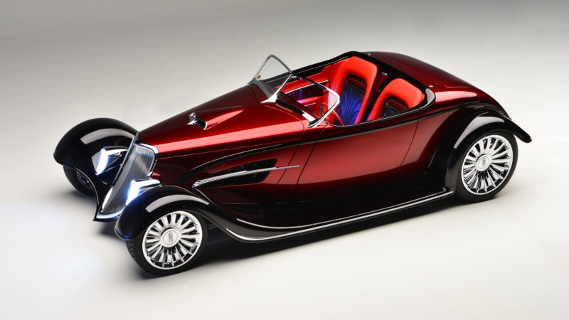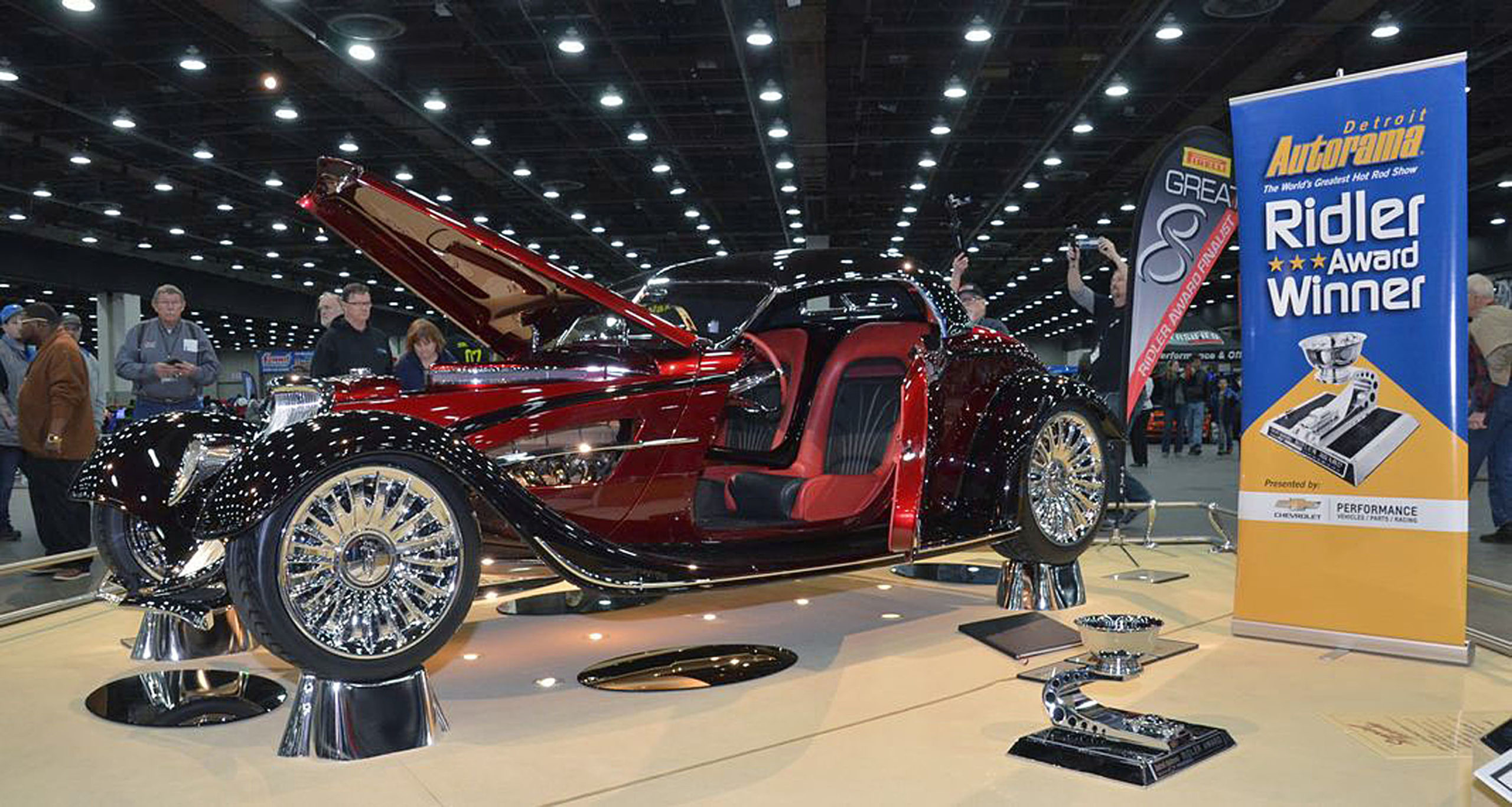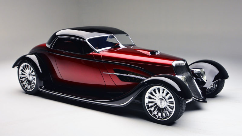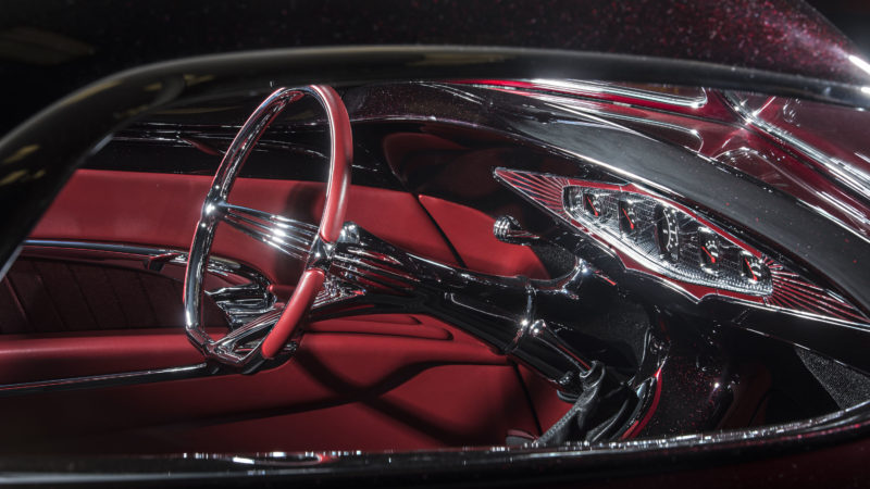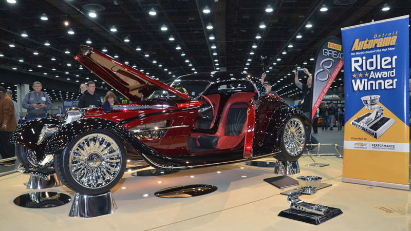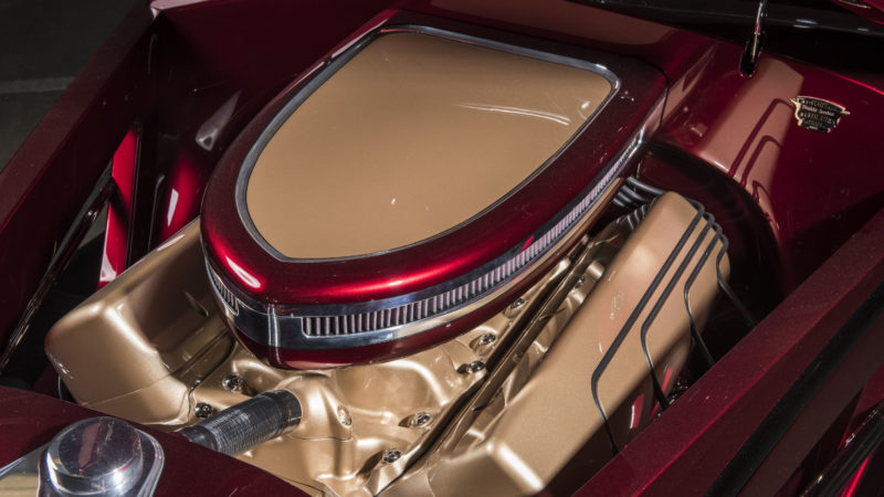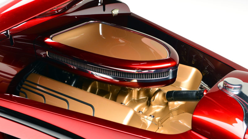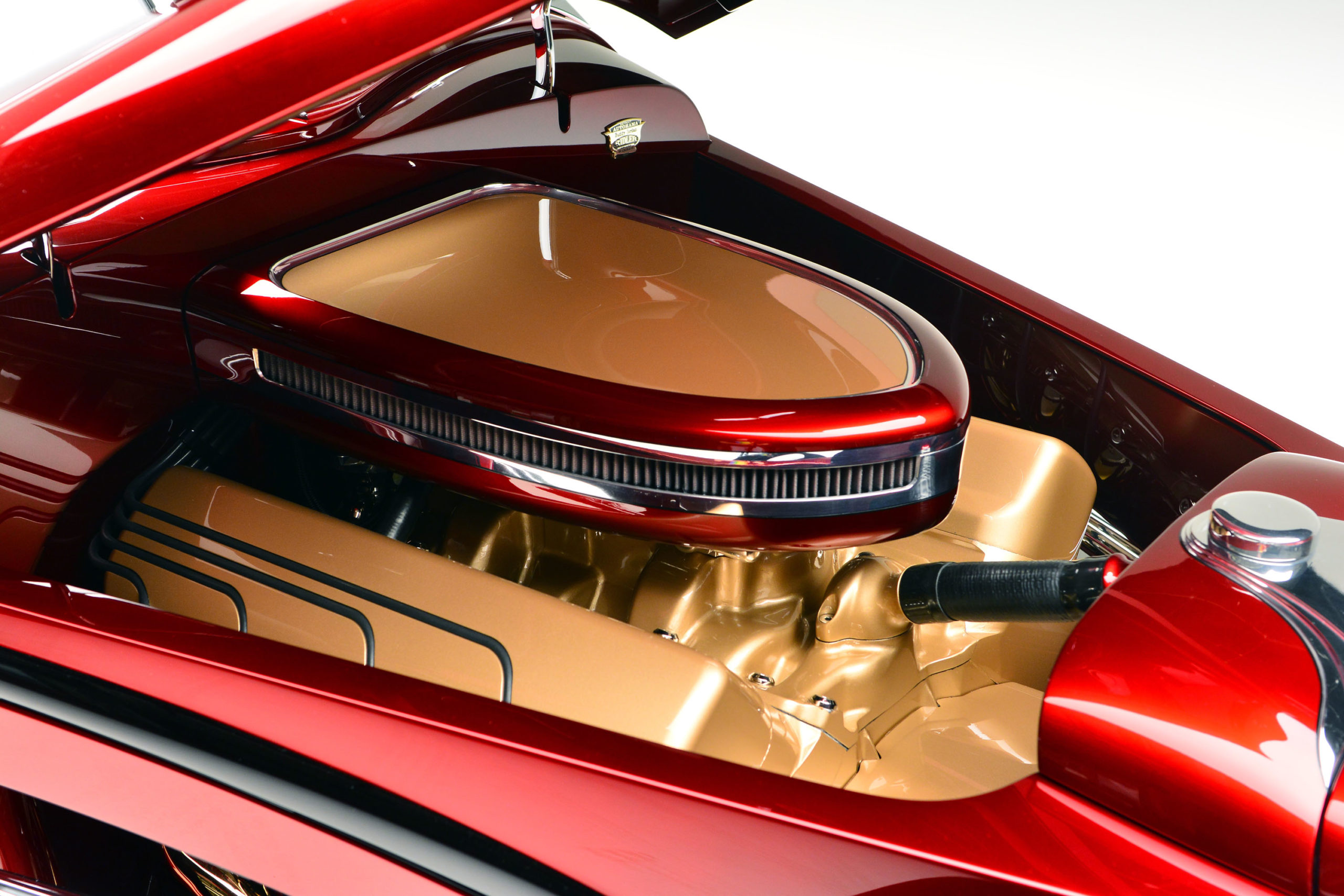 This rolling example of coach built artistry was hand crafted by the talented crew at Steve’s Auto Restorations specifically to compete in the 2017 Detroit Autorama. Appropriately christened as the Renaissance Roadster, this creation was never a car to begin with. It was created from a designer’s rendering by pen and pencil and the computer. Approximately 95% of the car is hand built. All body, fender and hardtop sheet metal is built “in house” out of hand formed aluminum. The chassis was built “in house” out of sheet steel and round tubing. All of the chrome plated trim was hand built either out of brass, steel or aluminum. Gauges were upgraded by Classic Instruments in a 1930 Nash gauge cluster provided by S.A.R. Chris Ito designed the outer profile and shapes of the car while in house designer, David Brost, did the remaining design work on the interior trim and steering column/steering wheel, engine compartment components, directional wheels and matching backing plates, and all of the chassis and suspension components. The wheels and hubcaps, backing plates, driveshaft, rear propeller shafts, “A” arms, uprights, third member cover, steering column, steering wheel, hood side trim, air cleaner base and top, and valve covers have all been designed on the computer and CNC machined as “one-off” parts. The headlights are “one-off” units as well as the rear bumper/taillight assembly. The engine is an aluminum 427 cubic inch block with a “one only” aluminum intake manifold and fabricated fuel injection in machined aluminum “look like” carburetors.