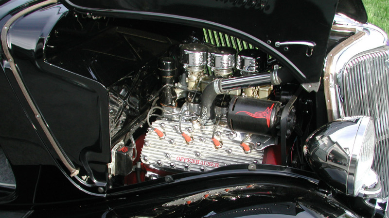 - Offenhauser intake manifold w/ (3) Progressive linked Stromberg 97 Carburetors