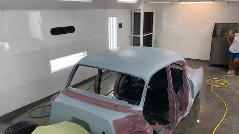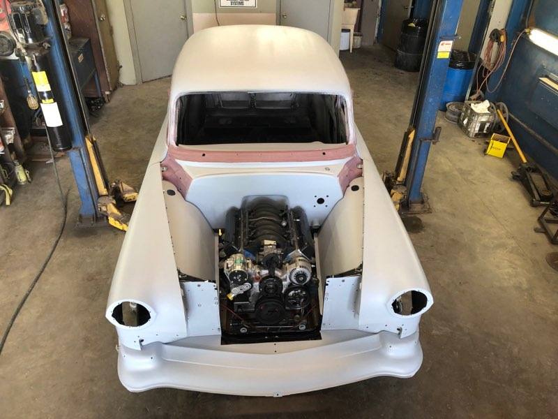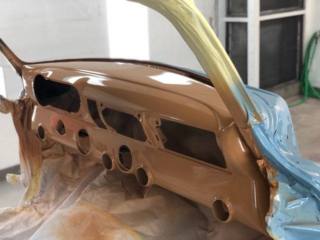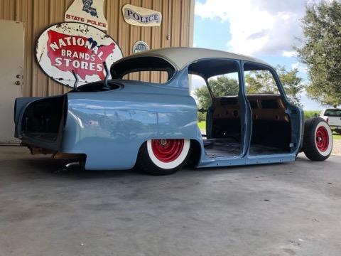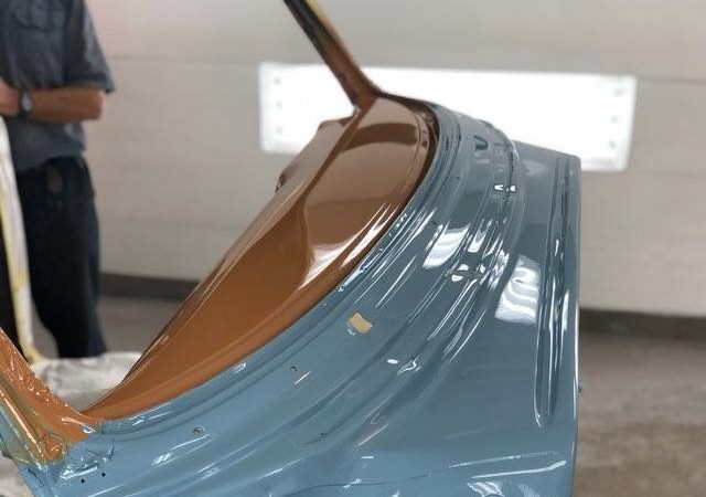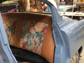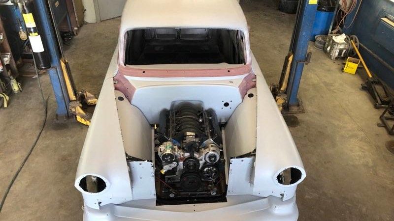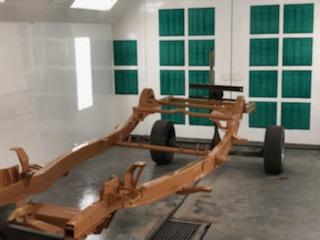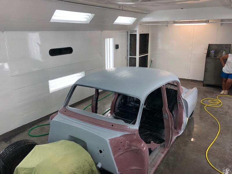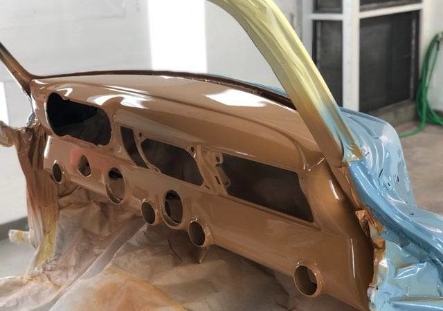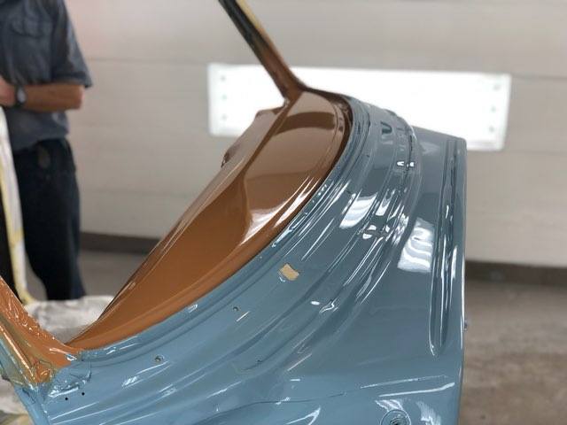 The car will be painted Denim Blue with a Cream-colored top. All seals, weather stripping and windows will be replaced not only for esthetics, but also for a quiet ride much like a modern-day vehicle. The chrome moldings, bumpers, and grill has been reworked and polished. The undercarriage will be coated with Lizard Skin to reduce heat ad protect the body of the car.
