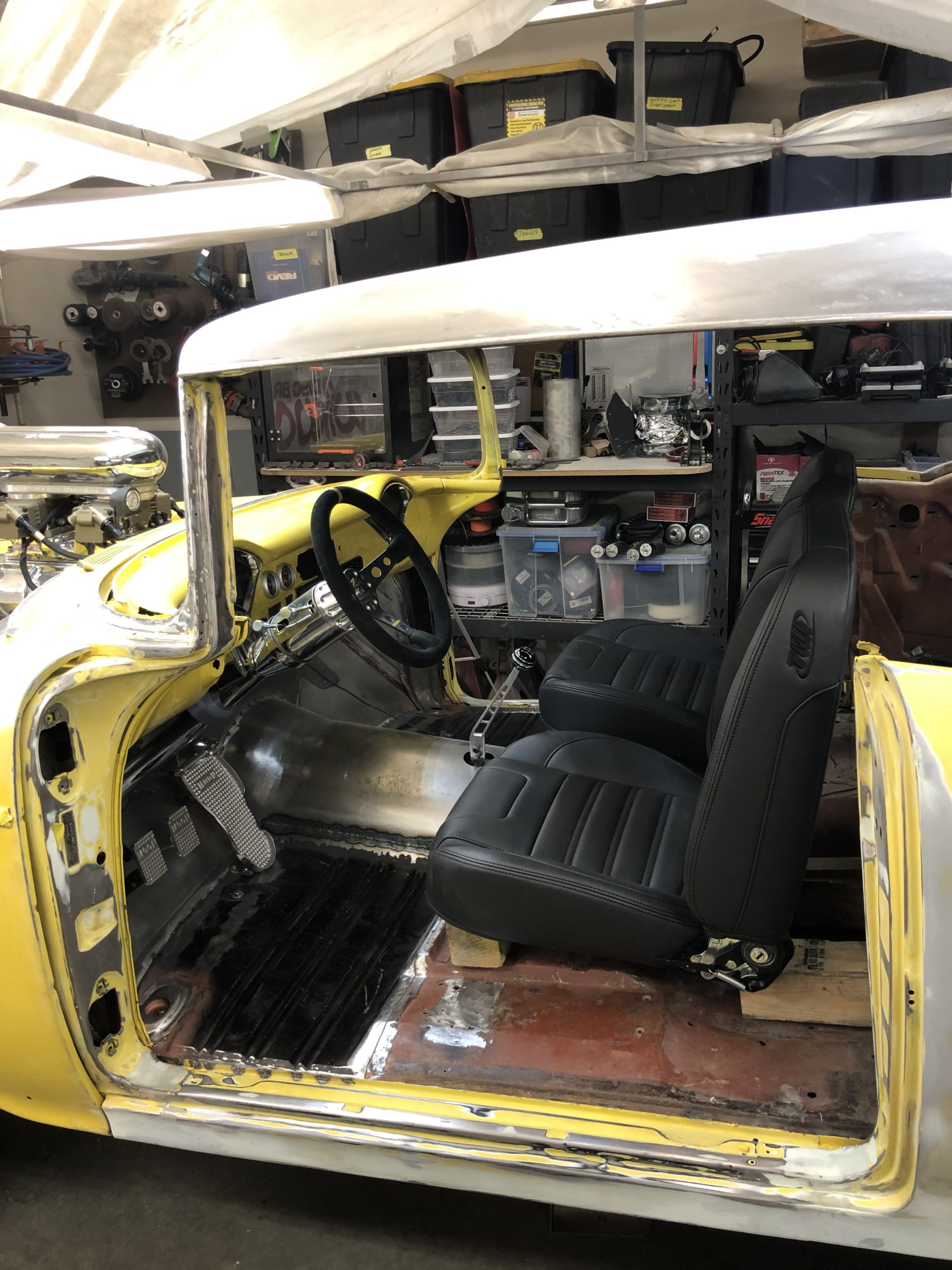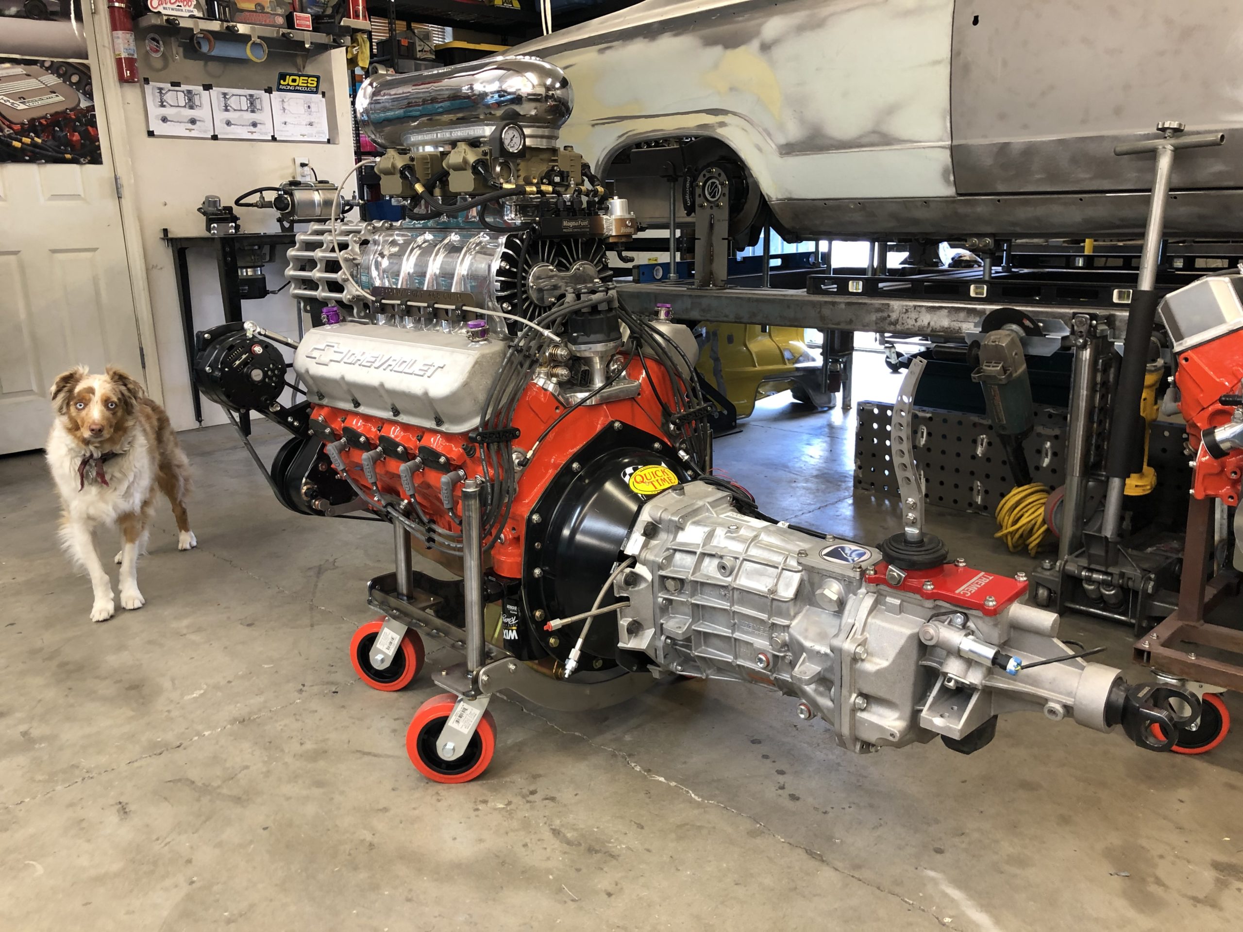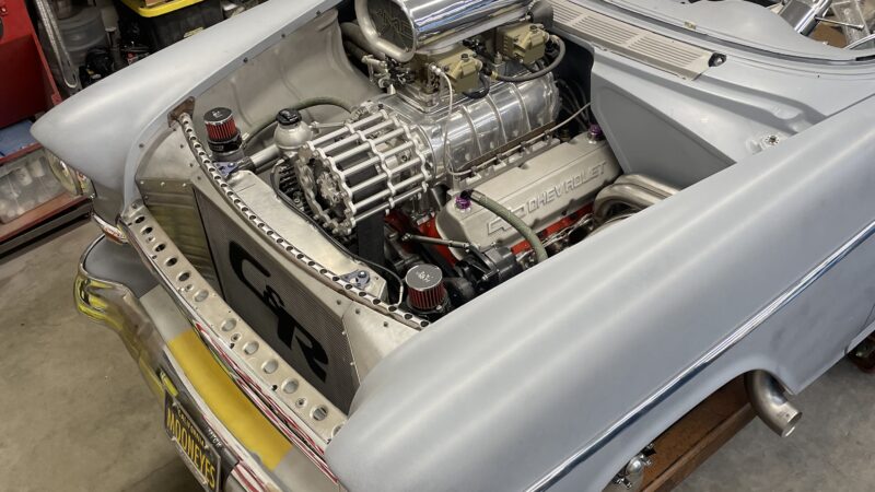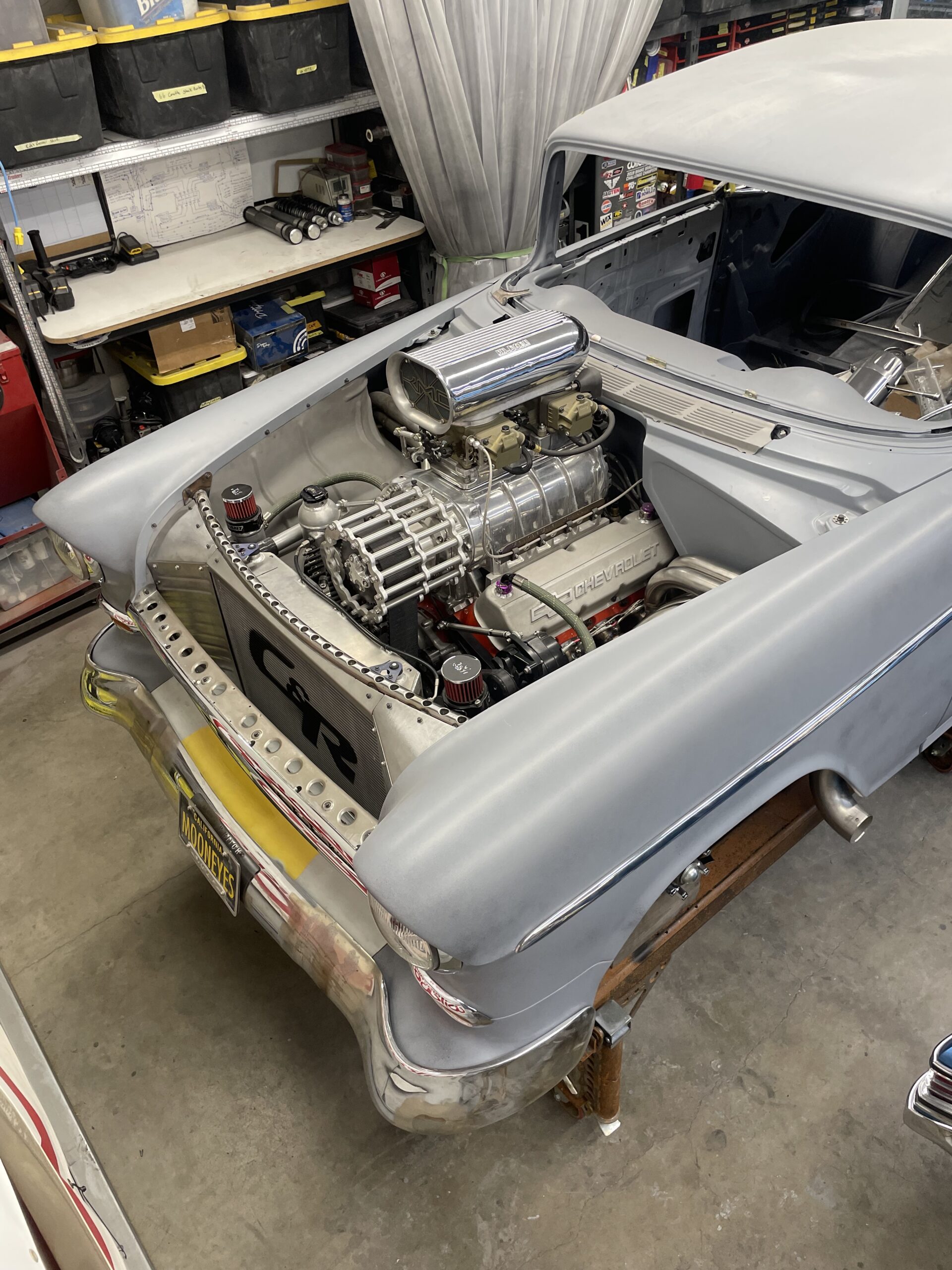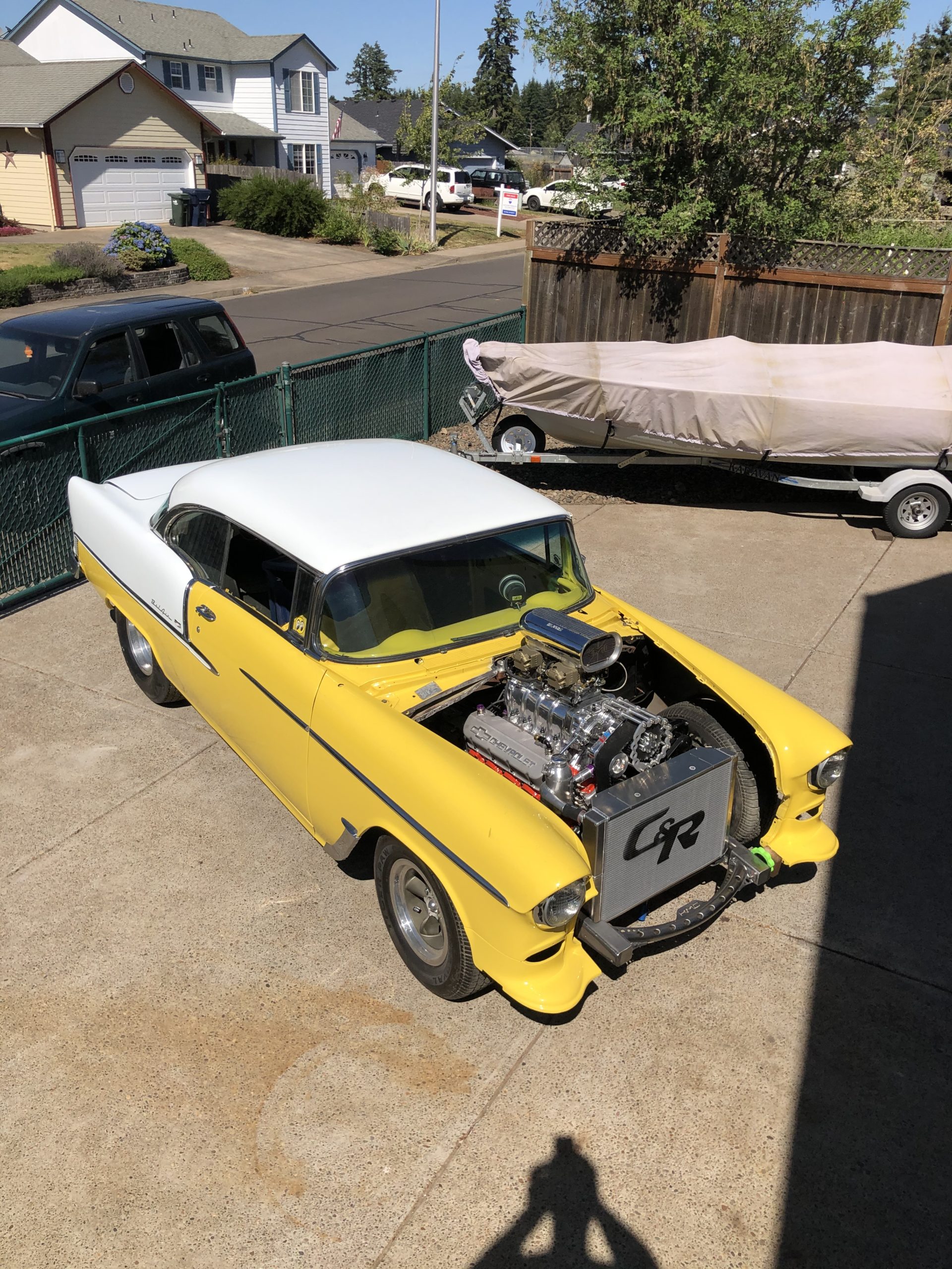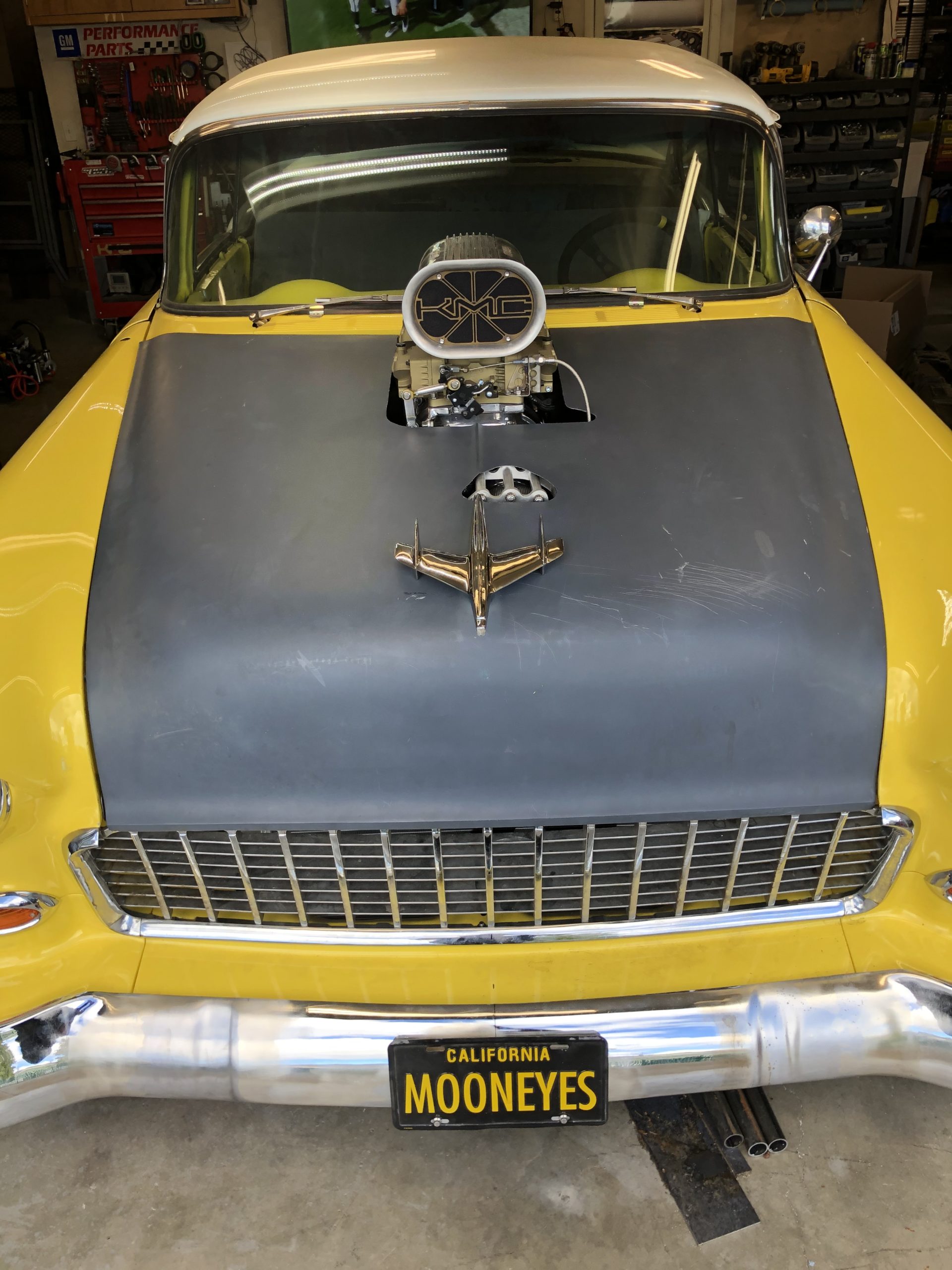 The "Banana Boat" 55' Belair is a long term build coming full circle in 2025. Dr. Joe, my client (and former dentist of 25+ years), has owned and hot-rodded this heavy Chevy for decades now through various stages of build construction and life. Originally, this was a driver quality weekend warrior imported from So-Cal with Joe circa the early 90's. My Father, Cris, helped Joe install a back-half frame section 20+ years ago with wheel tubs, a Ford 9" rear, and custom 18" wide rear semi-slicks to go drag racing. After that performance upgrades the car went to a body shop on dental trade for the yellow-white two-tone paint and subsequently sat disassembled for 20 years afterwards due to a busy life schedule. Fast forward to present day and we are midway through the fabrication stage getting this ride back on track with some radical modifications. The vehicle features a Scott's Hotrods tri-five front clip, heavily customized for this application. A massive 468 cu.in. Big Block plant will motivate this behemoth with a big-bore 6-71 positive displacement blower and dual Holley EFI Terminator Stealth throttle bodies atop. The power finds the rear axle via a Bowler Performance Prepped Tremec T56 Super Magnum 6 speed manual trans, Tilton hydraulic throw out bearing, and Mcloud RST dual disc clutch. Cooling is handled by, possibly the largest ever fit, C&R Custom spec crossflow radiator with dual 11" SPAL brushless fans, and a custom external oil cooler. Fuel is supplied from the custom spec stainless ricks tank,massive Holley EFI Pump, and a full sweep of XRP Race-Crimp plumbing. From the Fully de-cast and smoothed block and heads to the Cnc billet-tig welded-nostalgia hilborn injection scoop mashup, and everything between the bumpers this classic is sure to turn heads and features all the micro-details you can expect from a Kyle Kuhnhausen build. All I know is it's sure to cause a spectacle ripping through six gears to 7,000rpm with that big blower whining, and those 18" wide tires torturing the pavement to submission, I can't wait.