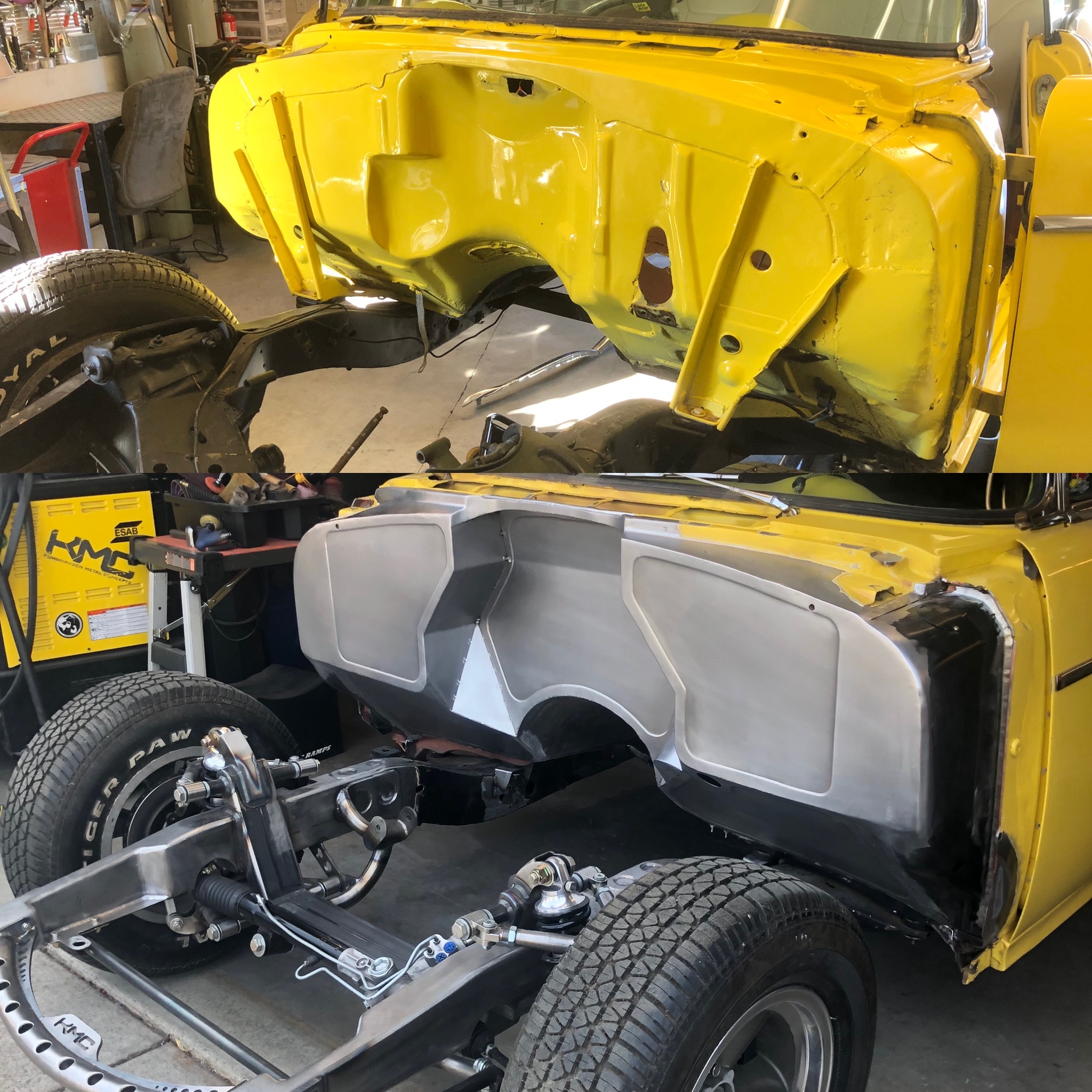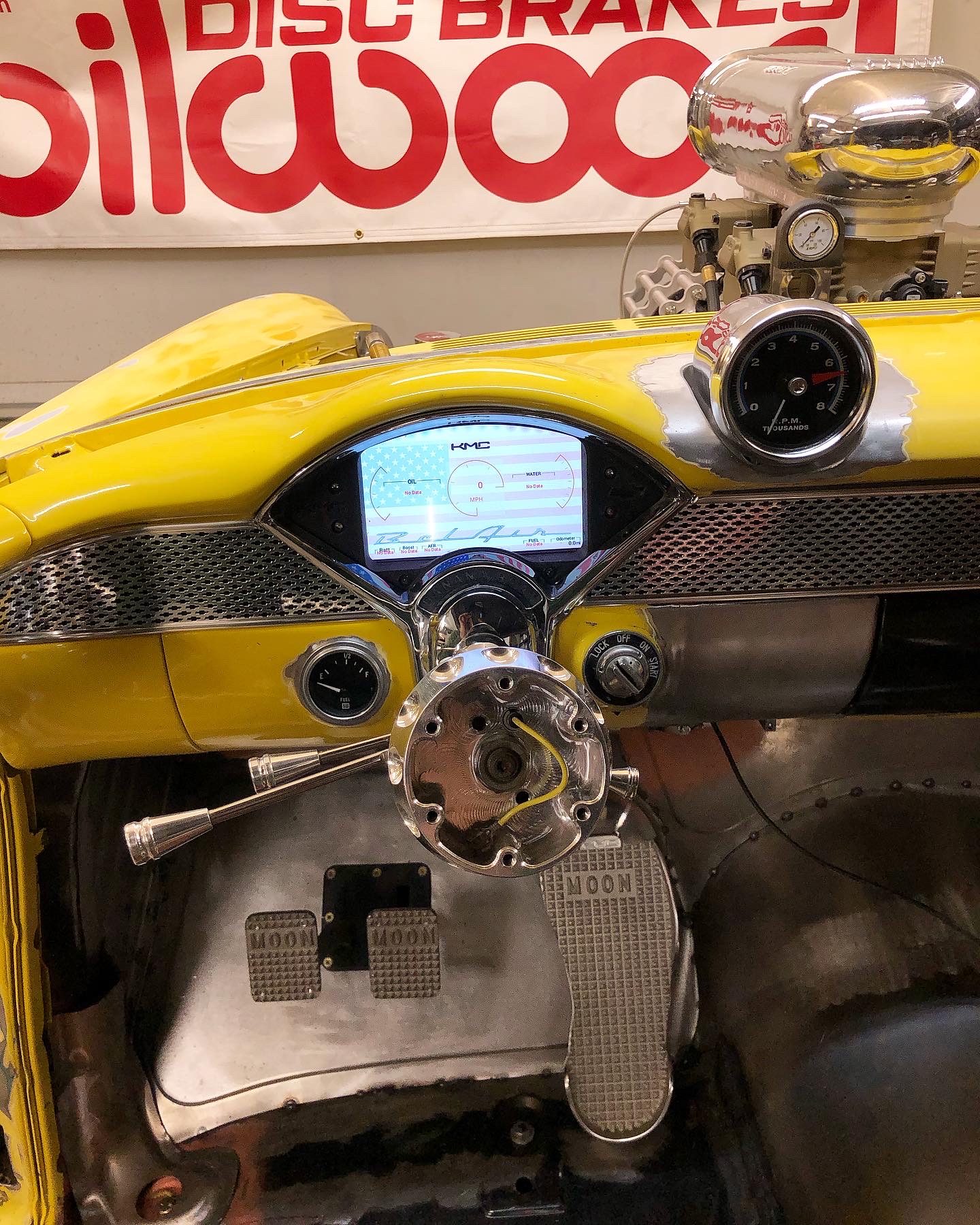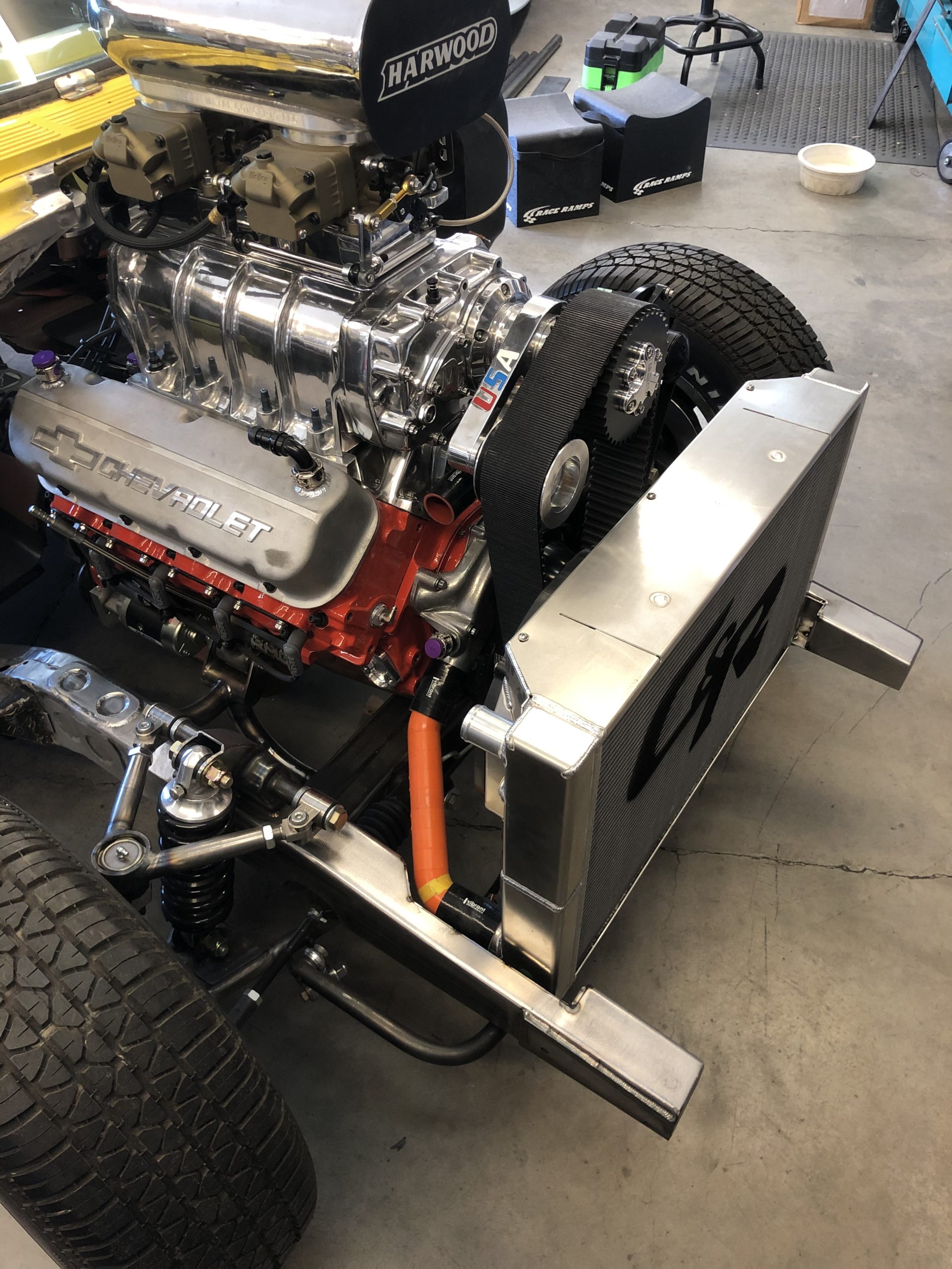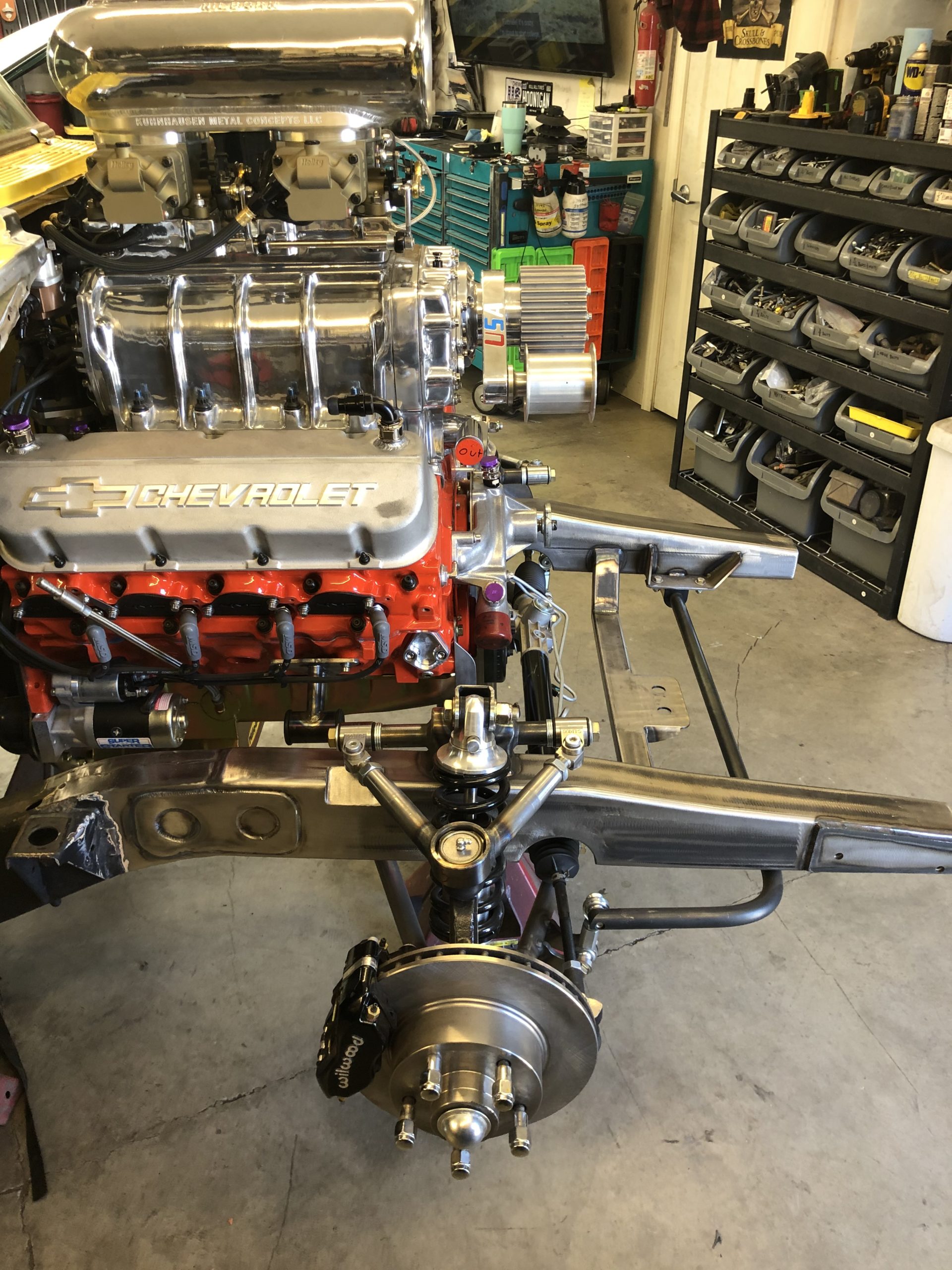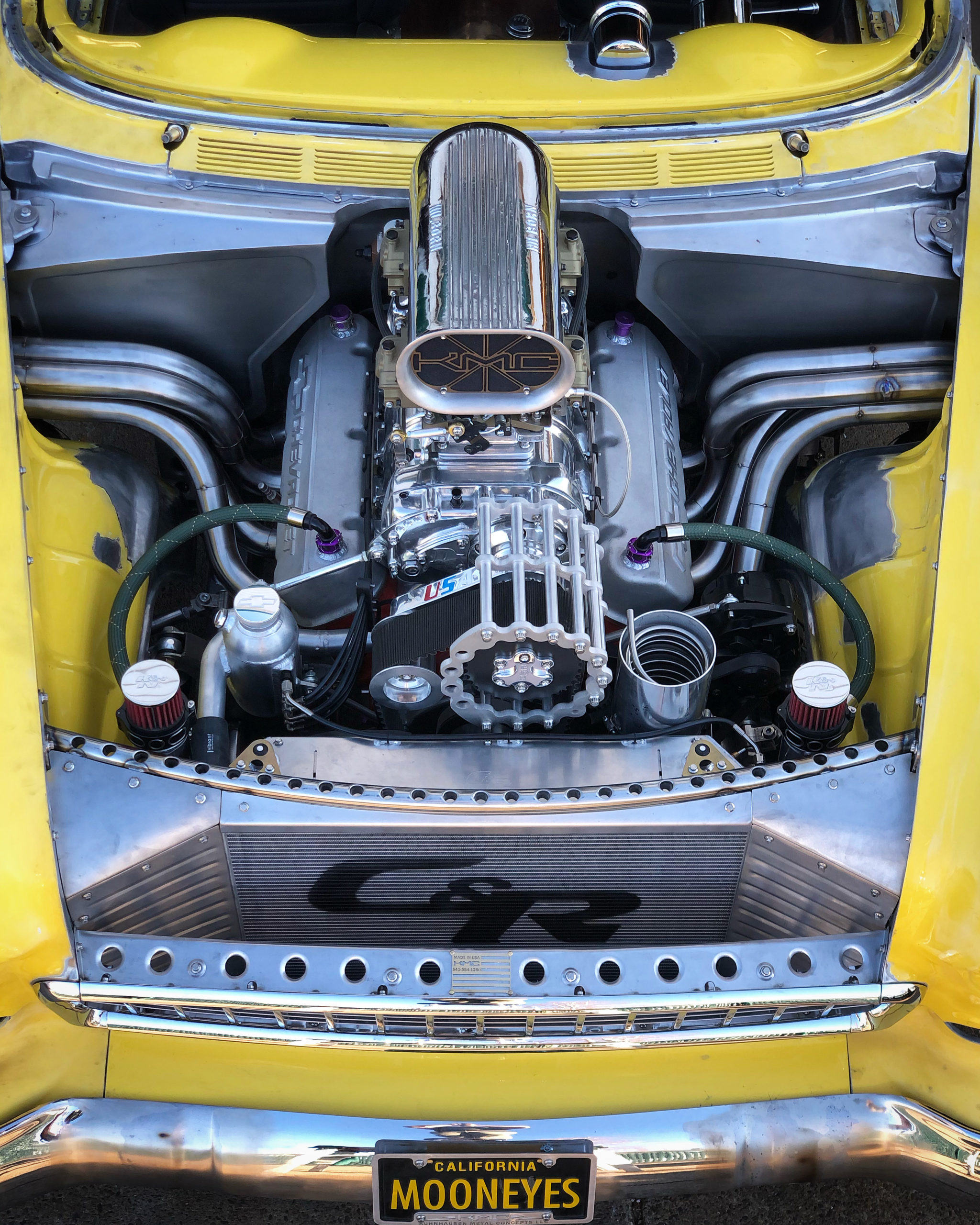 The "Banana Boat" 55' Belair is a long term build coming full circle in 2025. Dr. Joe, my client (and former dentist of 25+ years), has owned and hot-rodded this heavy Chevy for decades now through various stages of build construction and life. Originally, this was a driver quality weekend warrior imported from So-Cal with Joe circa the early 90's. My Father, Cris, helped Joe install a back-half frame section 20+ years ago with wheel tubs, a Ford 9" rear, and custom 18" wide rear semi-slicks to go drag racing. After that performance upgrades the car went to a body shop on dental trade for the yellow-white two-tone paint and subsequently sat disassembled for 20 years afterwards due to a busy life schedule. Fast forward to present day and we are midway through the fabrication stage getting this ride back on track with some radical modifications. The vehicle features a Scott's Hotrods tri-five front clip, heavily customized for this application. A massive 468 cu.in. Big Block plant will motivate this behemoth with a big-bore 6-71 positive displacement blower and dual Holley EFI Terminator Stealth throttle bodies atop. The power finds the rear axle via a Bowler Performance Prepped Tremec T56 Super Magnum 6 speed manual trans, Tilton hydraulic throw out bearing, and Mcloud RST dual disc clutch. Cooling is handled by, possibly the largest ever fit, C&R Custom spec crossflow radiator with dual 11" SPAL brushless fans, and a custom external oil cooler. Fuel is supplied from the custom spec stainless ricks tank,massive Holley EFI Pump, and a full sweep of XRP Race-Crimp plumbing. From the Fully de-cast and smoothed block and heads to the Cnc billet-tig welded-nostalgia hilborn injection scoop mashup, and everything between the bumpers this classic is sure to turn heads and features all the micro-details you can expect from a Kyle Kuhnhausen build. All I know is it's sure to cause a spectacle ripping through six gears to 7,000rpm with that big blower whining, and those 18" wide tires torturing the pavement to submission, I can't wait.