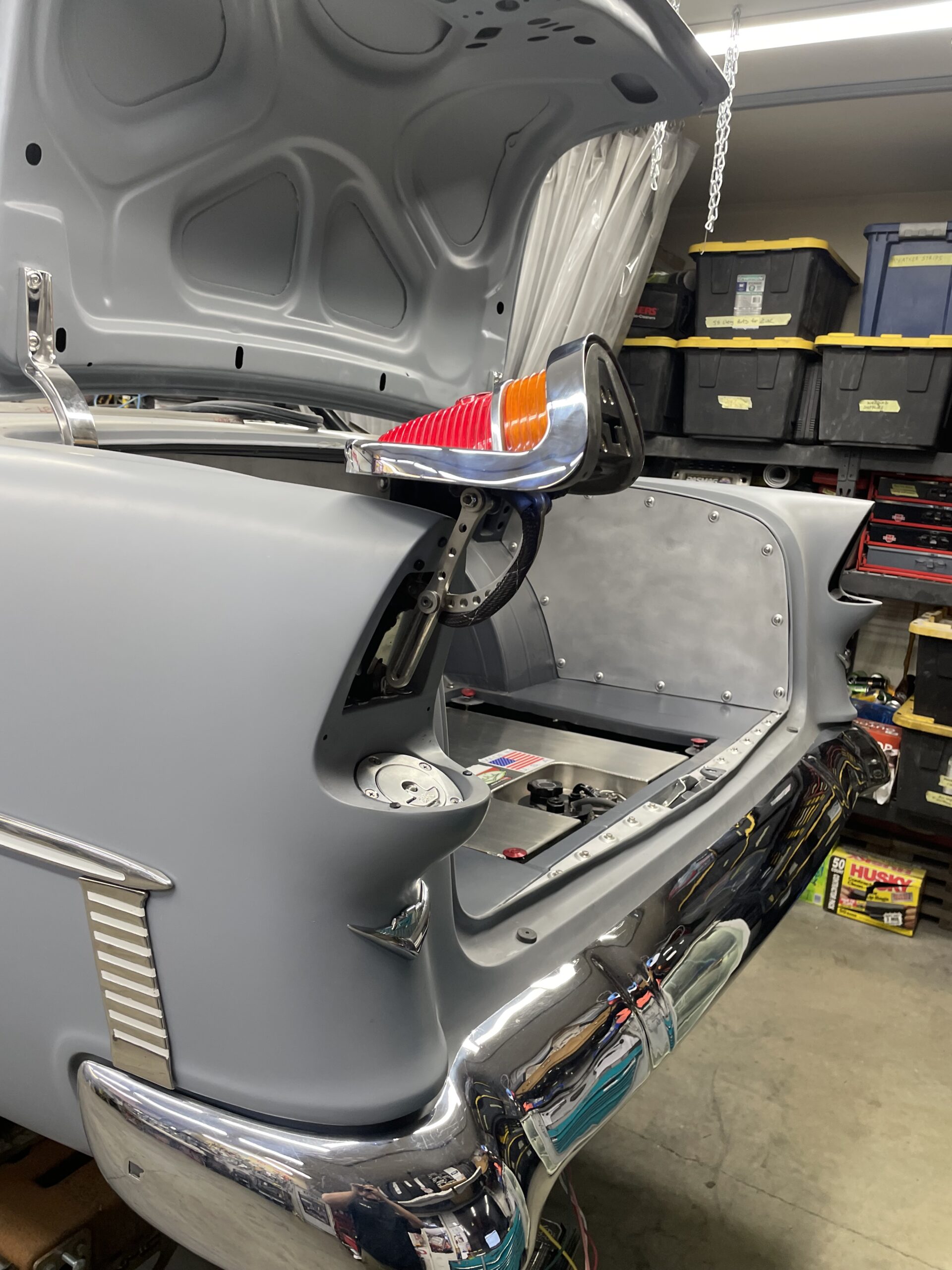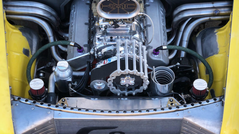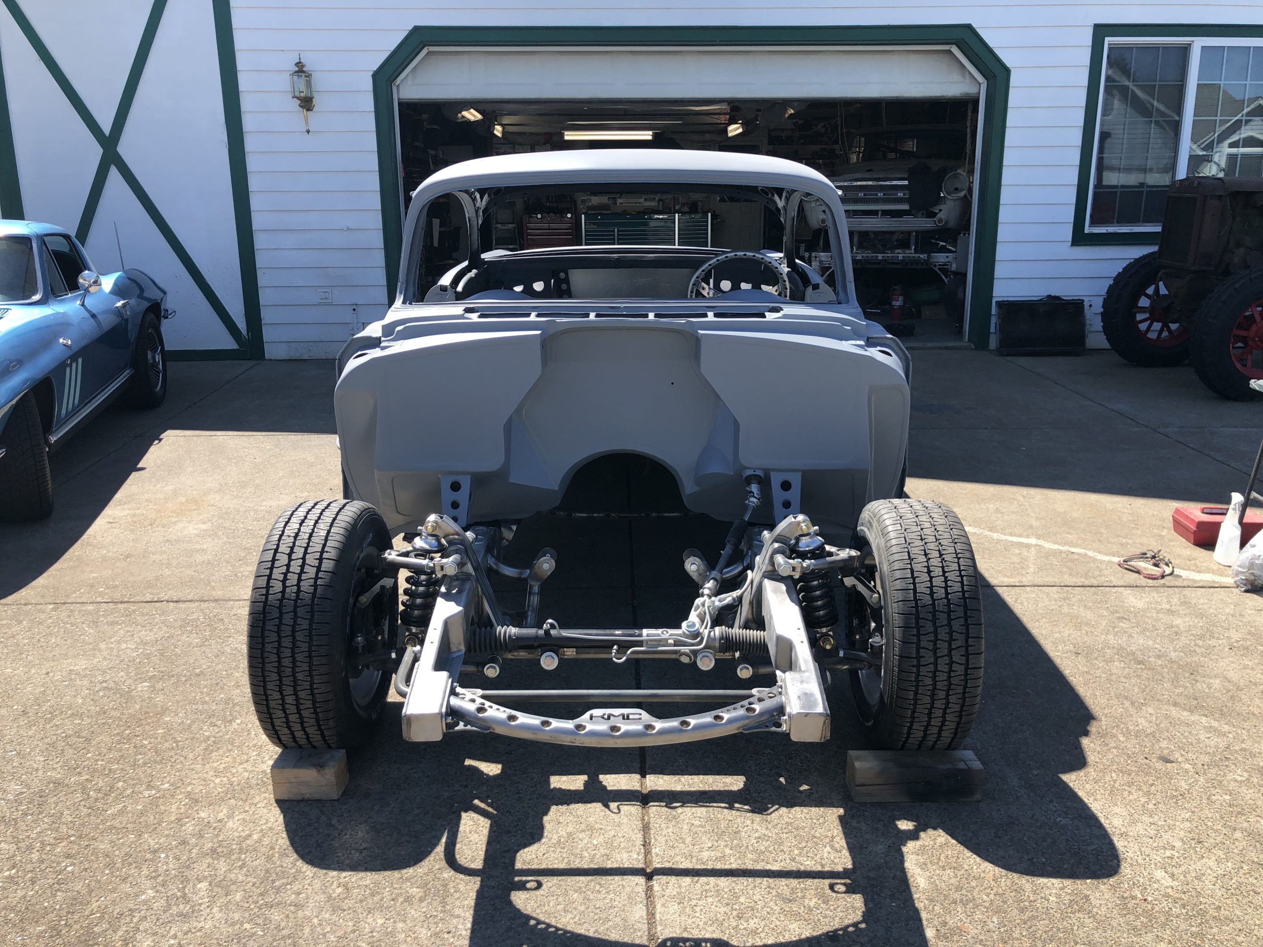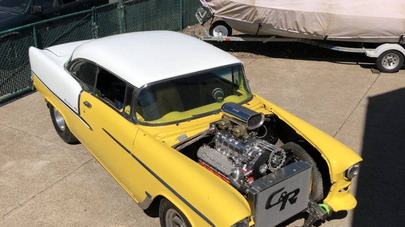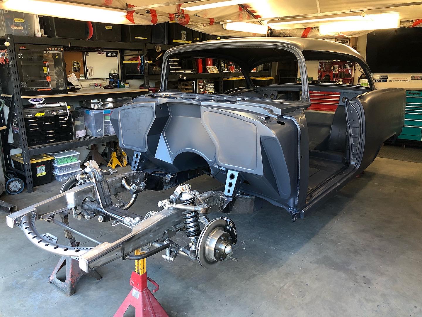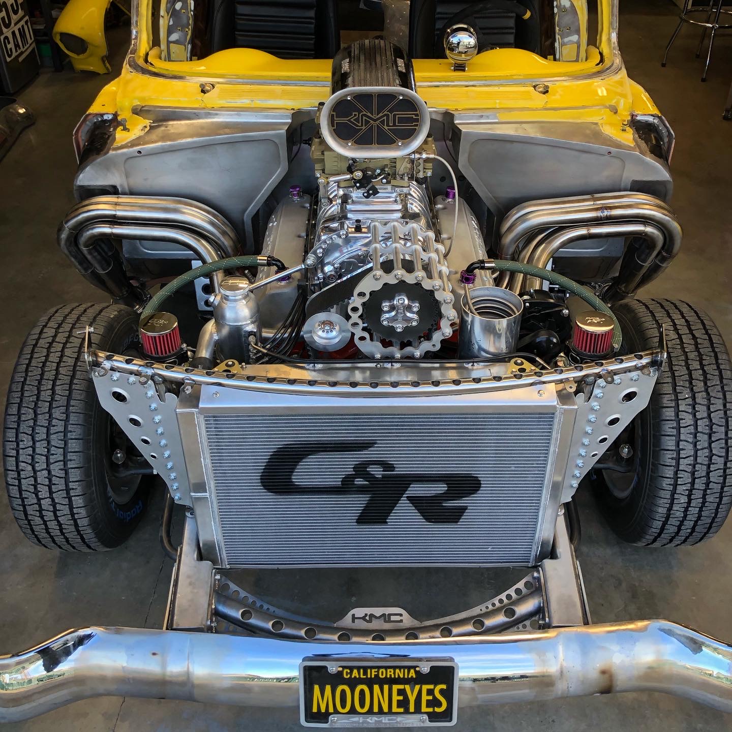 The "Banana Boat" 55' Belair is a long term build coming full circle in 2025. Dr. Joe, my client (and former dentist of 25+ years), has owned and hot-rodded this heavy Chevy for decades now through various stages of build construction and life. Originally, this was a driver quality weekend warrior imported from So-Cal with Joe circa the early 90's. My Father, Cris, helped Joe install a back-half frame section 20+ years ago with wheel tubs, a Ford 9" rear, and custom 18" wide rear semi-slicks to go drag racing. After that performance upgrades the car went to a body shop on dental trade for the yellow-white two-tone paint and subsequently sat disassembled for 20 years afterwards due to a busy life schedule. Fast forward to present day and we are midway through the fabrication stage getting this ride back on track with some radical modifications. The vehicle features a Scott's Hotrods tri-five front clip, heavily customized for this application. A massive 468 cu.in. Big Block plant will motivate this behemoth with a big-bore 6-71 positive displacement blower and dual Holley EFI Terminator Stealth throttle bodies atop. The power finds the rear axle via a Bowler Performance Prepped Tremec T56 Super Magnum 6 speed manual trans, Tilton hydraulic throw out bearing, and Mcloud RST dual disc clutch. Cooling is handled by, possibly the largest ever fit, C&R Custom spec crossflow radiator with dual 11" SPAL brushless fans, and a custom external oil cooler. Fuel is supplied from the custom spec stainless ricks tank,massive Holley EFI Pump, and a full sweep of XRP Race-Crimp plumbing. From the Fully de-cast and smoothed block and heads to the Cnc billet-tig welded-nostalgia hilborn injection scoop mashup, and everything between the bumpers this classic is sure to turn heads and features all the micro-details you can expect from a Kyle Kuhnhausen build. All I know is it's sure to cause a spectacle ripping through six gears to 7,000rpm with that big blower whining, and those 18" wide tires torturing the pavement to submission, I can't wait.