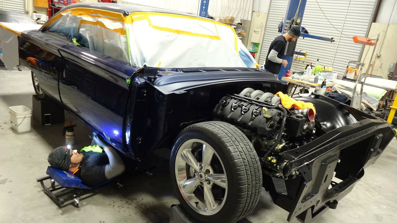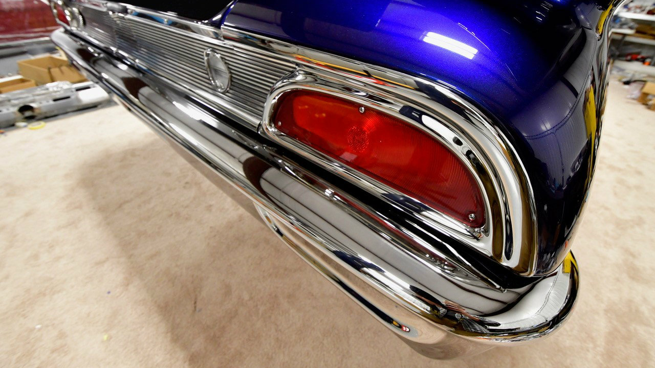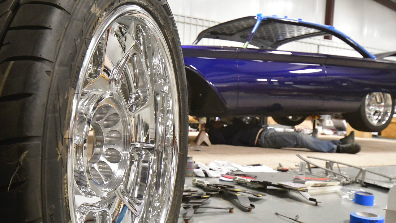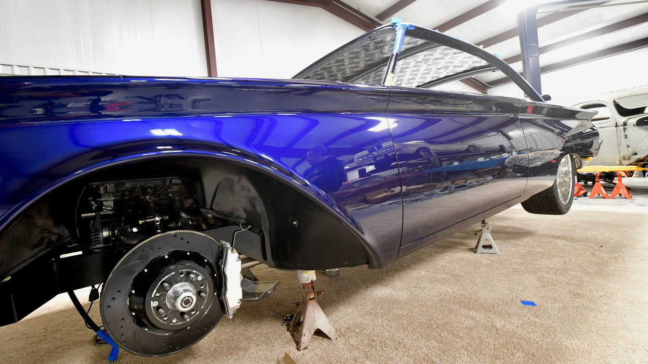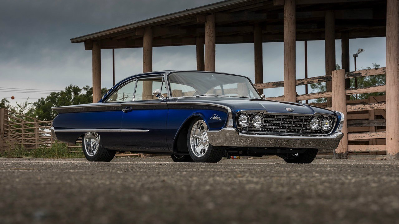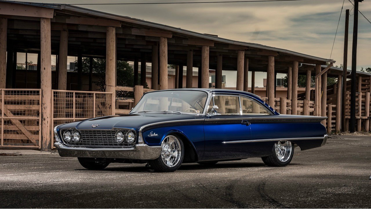 Base Vehicle • 1960 Ford Starliner • Eric Brockmeyer: exterior and interior renderings Powertrain • Ford Racing: Coyote 5.0 crate engine w/MMR billet valve covers • Walton Customs: 1-3/4” headers and stainless steel exhaust (oval tube) with Borla mufflers • Lokar: shifter modified for ‘Select Shift’ function – Walton Customs • American Autowire: Highway 22 Harness Chassis • Roadster Shop: Spec Series chassis featuring Independent front suspension / Afco coil-over shocks / 4-bar rear suspension / 3.89 True-Trac 9” Ford differential • Wilwood Brakes: four wheel disc system 14” 6P front & 14” 4P rear Wheels & Tires • Billet Specialties Legacy: 18 x 8 front & 20 x 10 rear • Nitto 555 G2: 245/40-18 front & 295/40-20 rear Exterior • PAINTHOUSE: all bodywork, fitment, paint & polishing • PAINTHOUSE: custom-created color “Bluecherding Pearl” (PPG) • Hammerfab: hand built engine bay panels • Jon Wright’s CustomChrome: all chrome, potmetal and stainless steel trim • Walton Customs: smoothed, narrowed & tucked bumpers; extended rocker panels Interior • Cato’s Custom Upholstery: interior creation featuring modified 2010 Mustang seats, a 15” ’55 Tbird steering wheel, a ’65 Tbird center console and square weave carpet • Relicate: custom-dyed two-tone leather • Vintage Air climate control system and Dakota Digital gauges