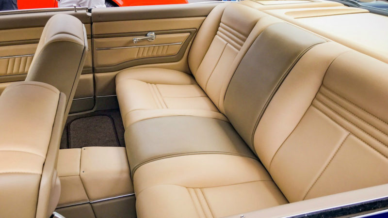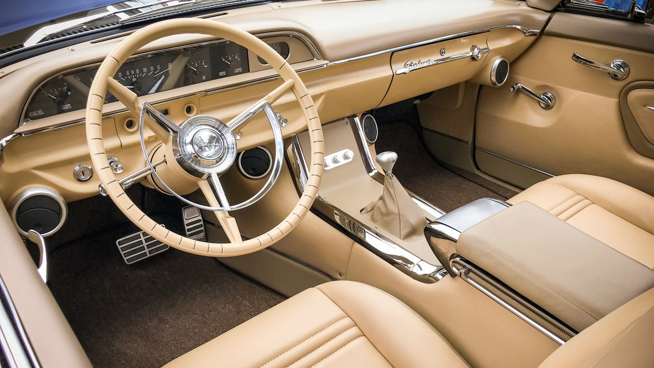 - Cato’s Custom Upholstery - Interior creation featuring modified 2010 Mustang seats, a 15” ’55 Tbird steering wheel, a ’65 Tbird center console and square weave carpet