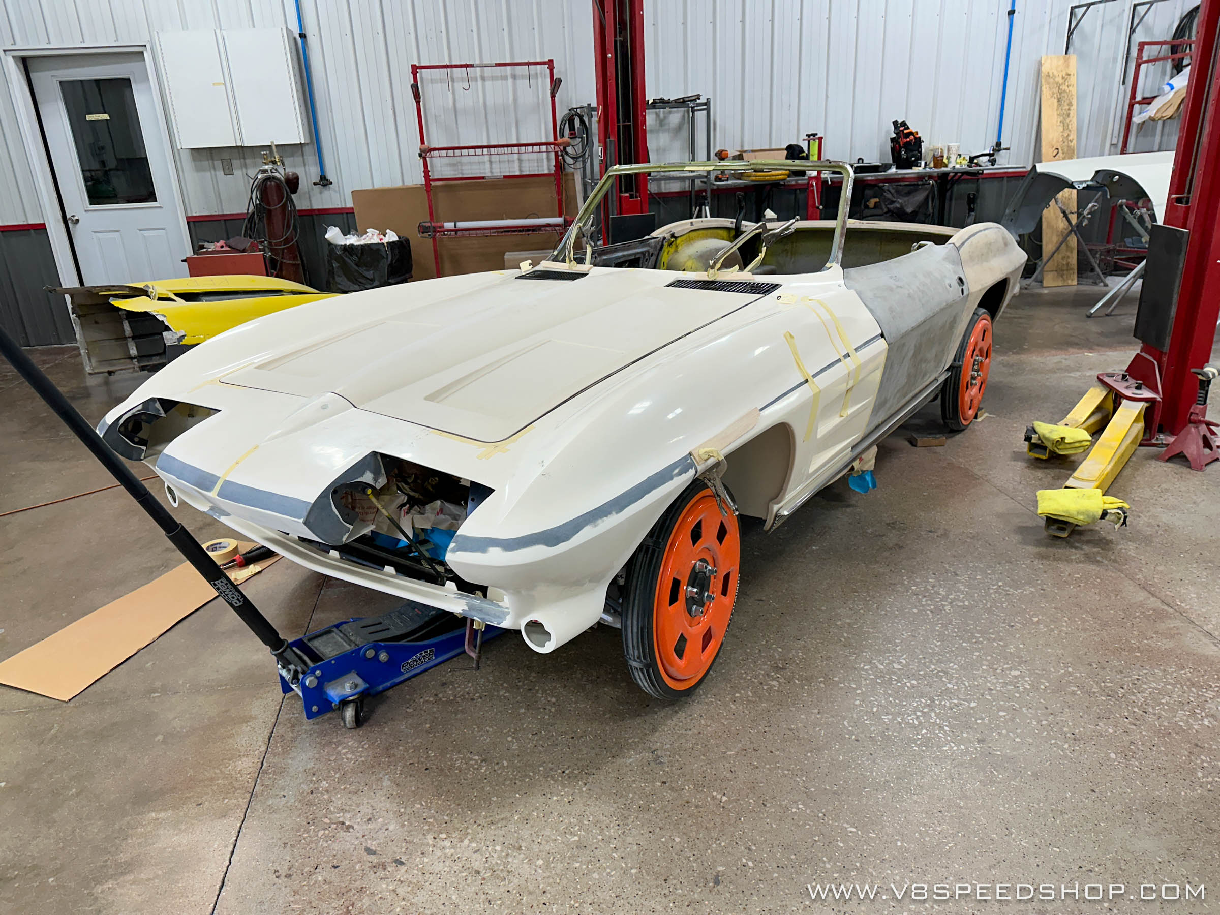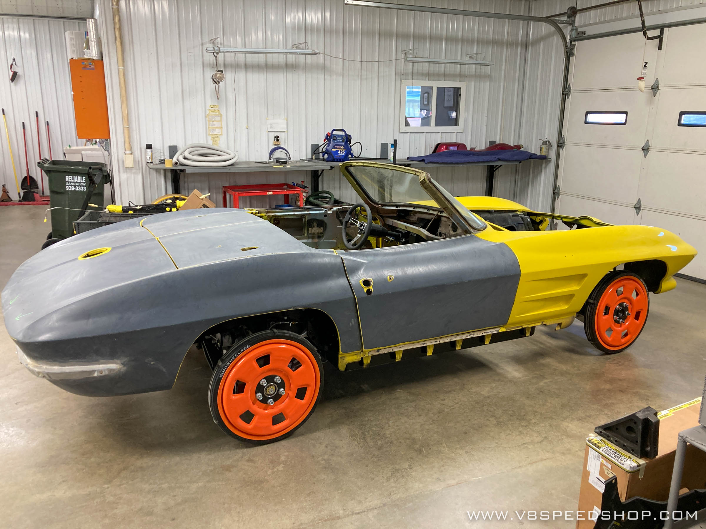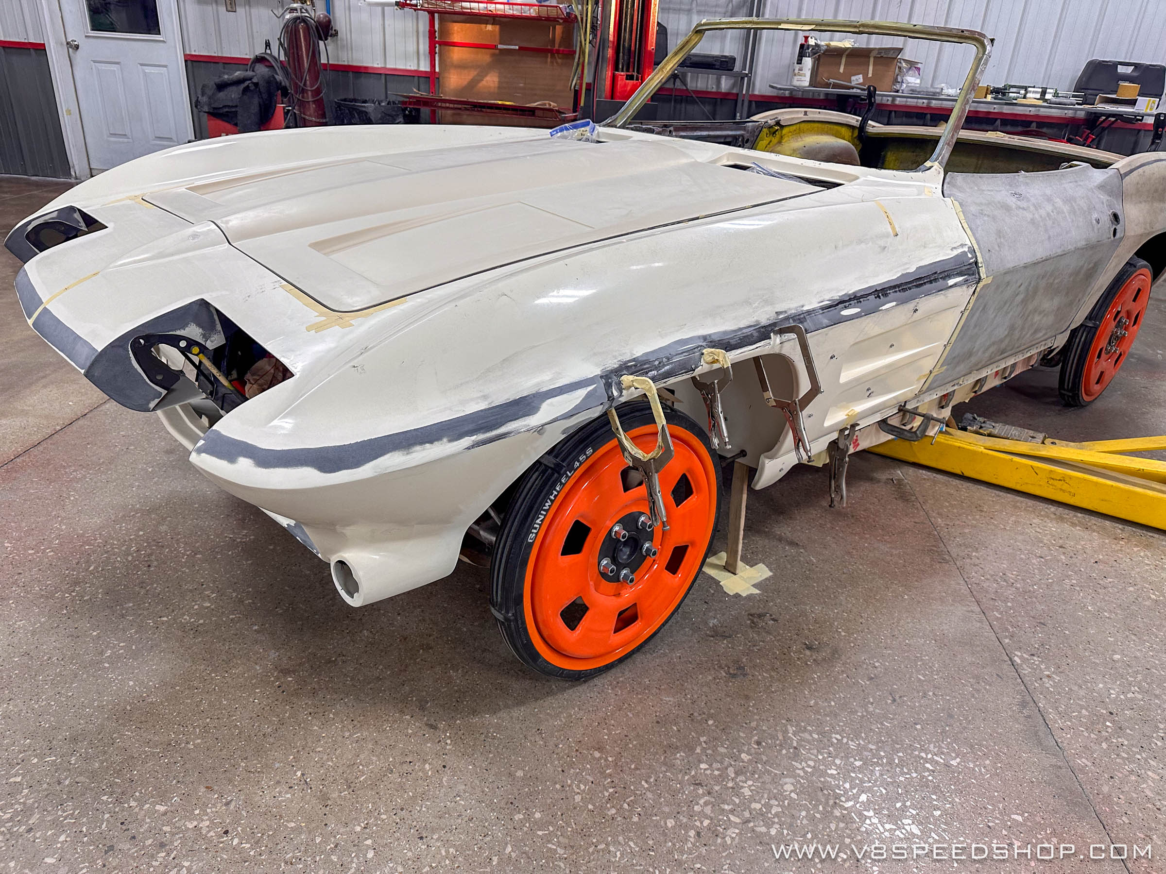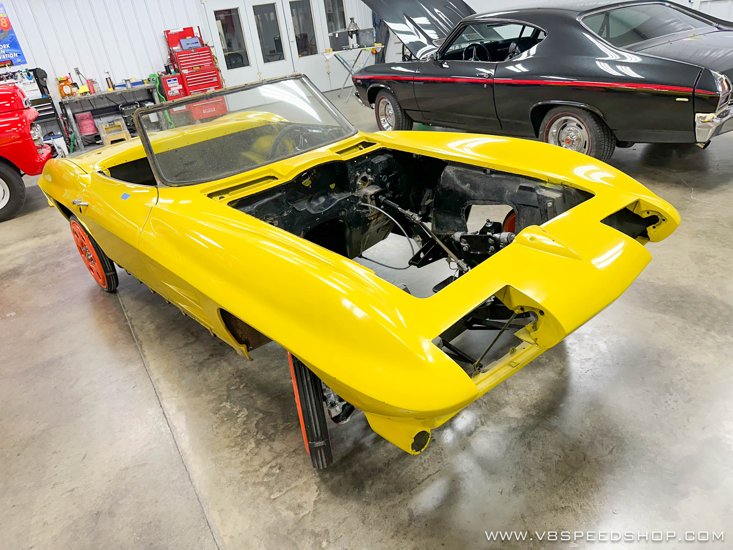 This iconic 1963 Corvette rolled into the V8 Speed and Resto Shop with a the fiberglass body needing some TLC. It’s riding on a custom chassis, and the owner enlisted our team to repair the cracked and damaged original fiberglass body with a new front section, perform other required bodywork, and give it a great looking new paint job.