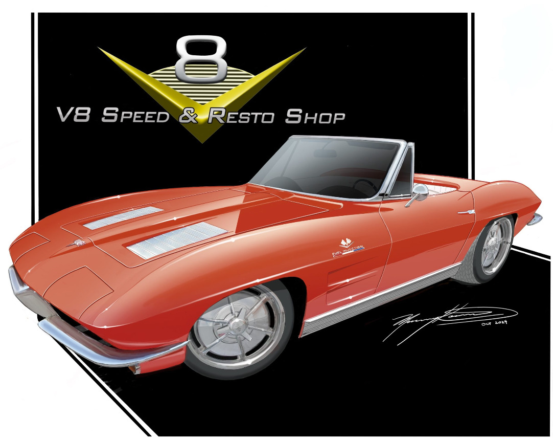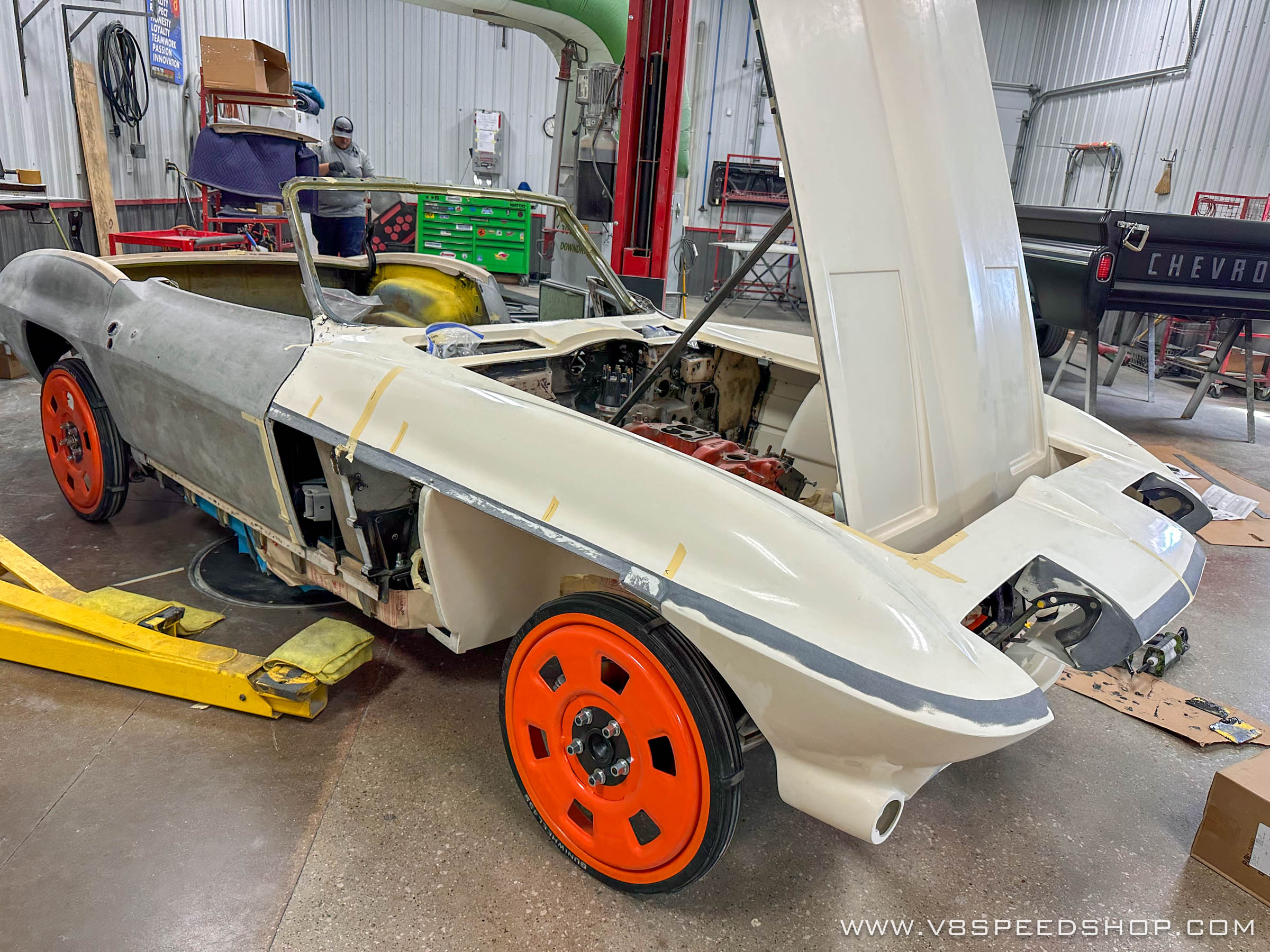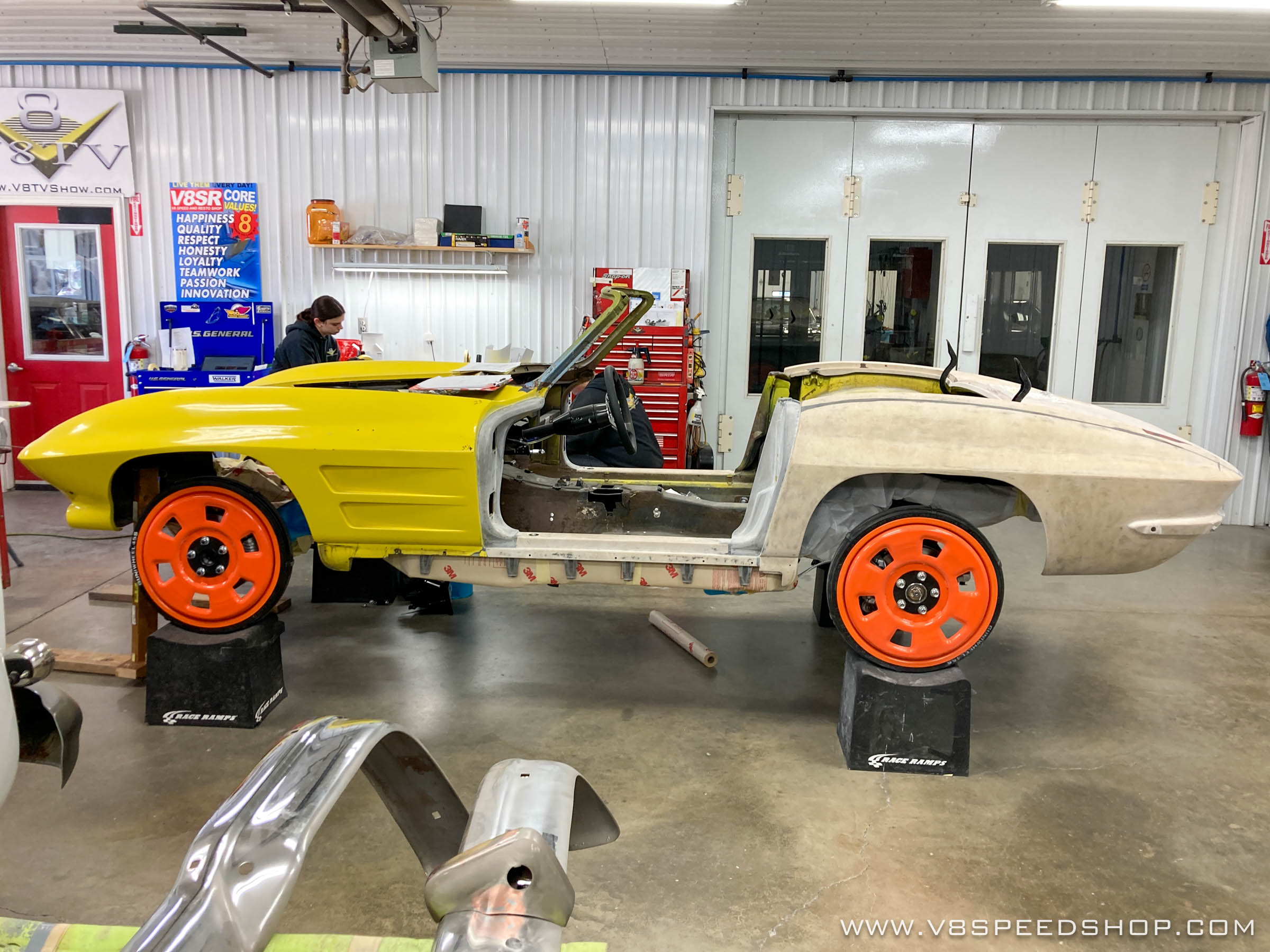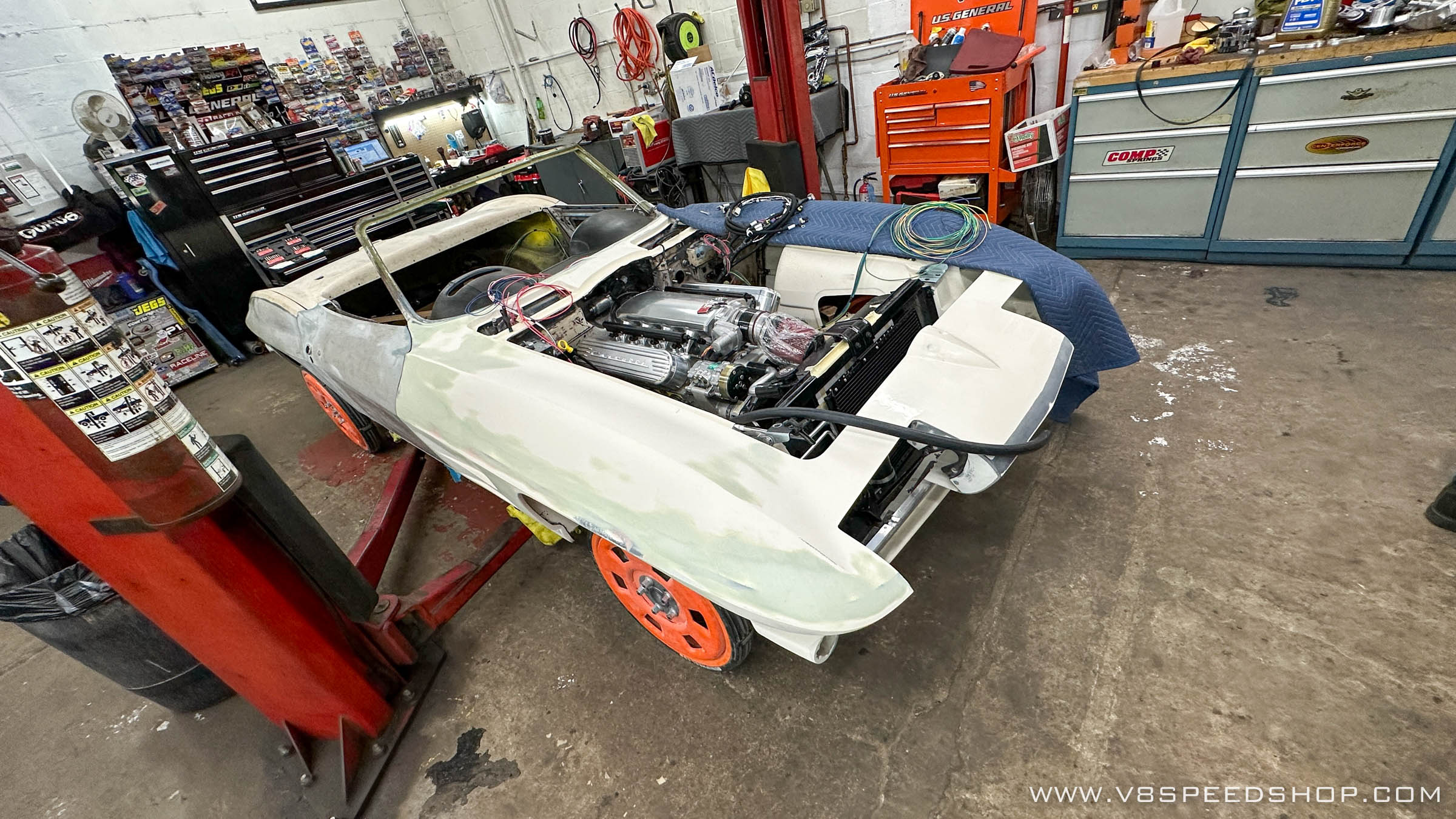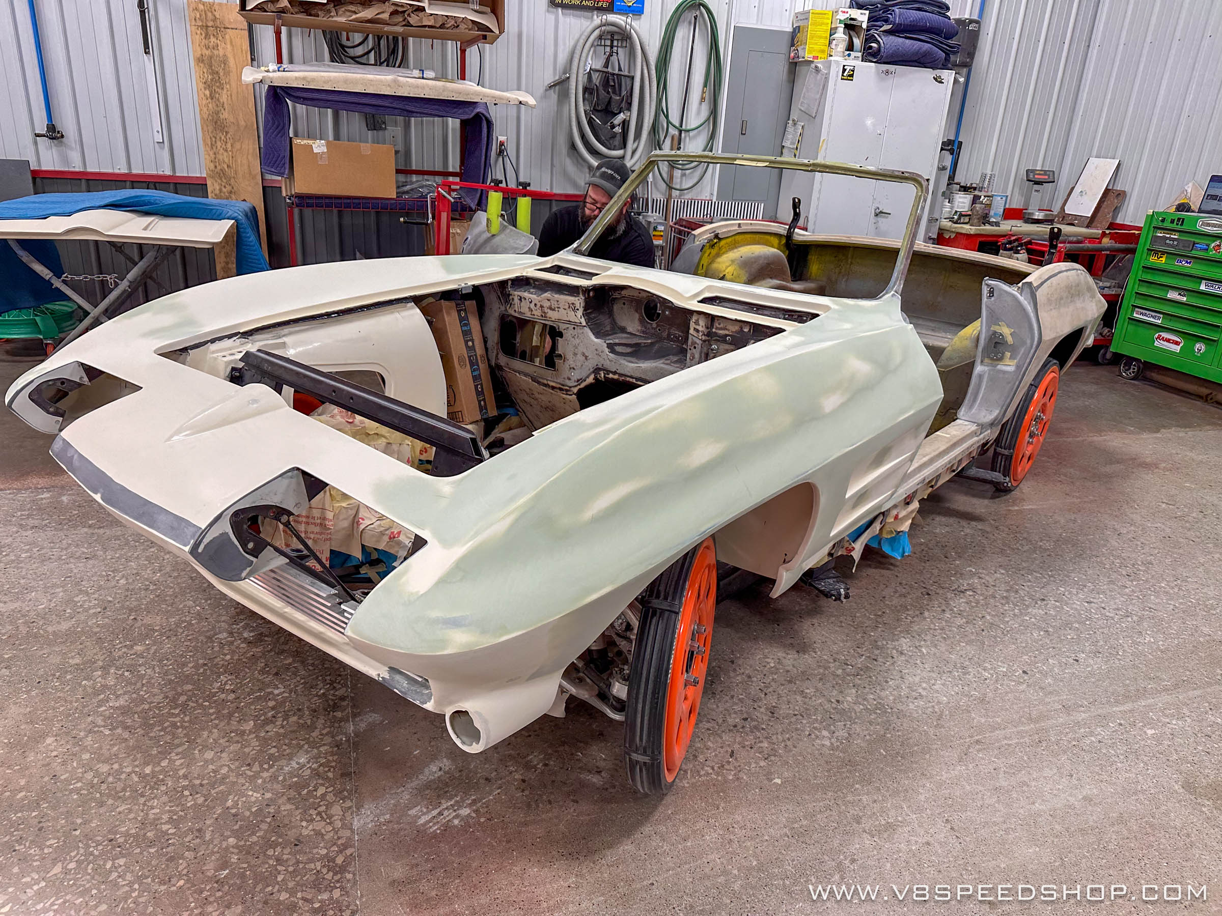 This iconic 1963 Corvette rolled into the V8 Speed and Resto Shop with a the fiberglass body needing some TLC. It’s riding on a custom chassis, and the owner enlisted our team to repair the cracked and damaged original fiberglass body with a new front section, perform other required bodywork, and give it a great looking new paint job.