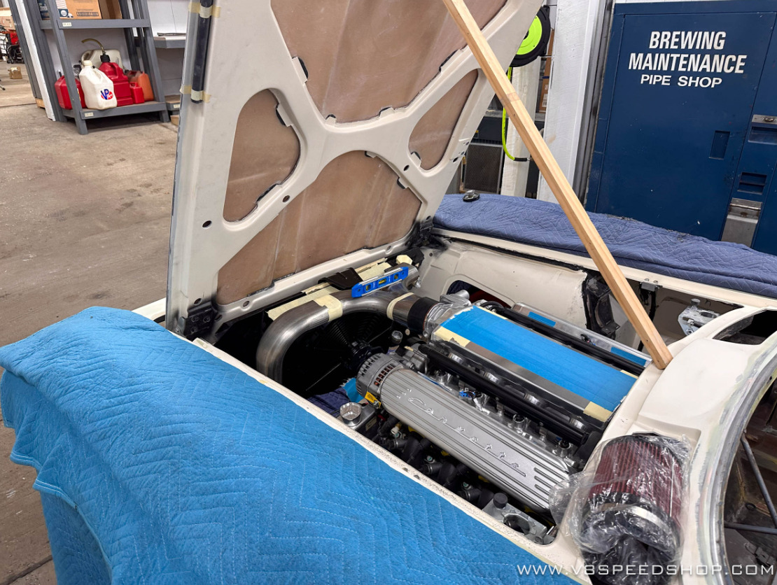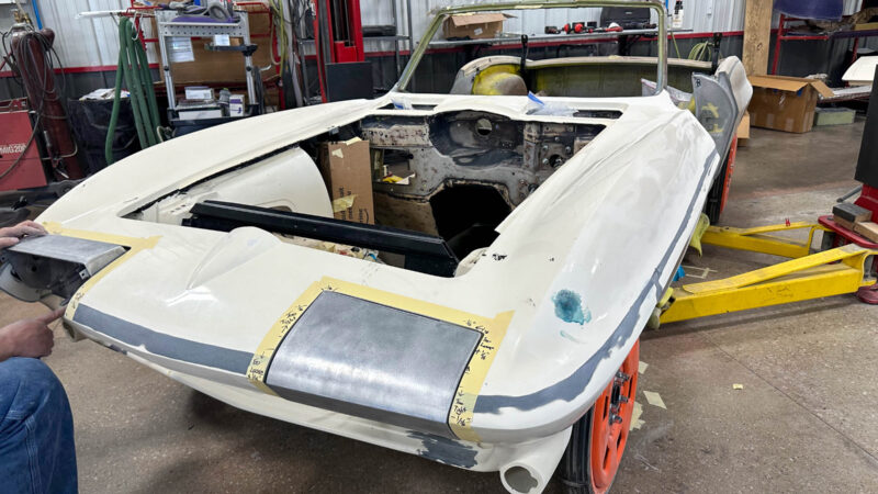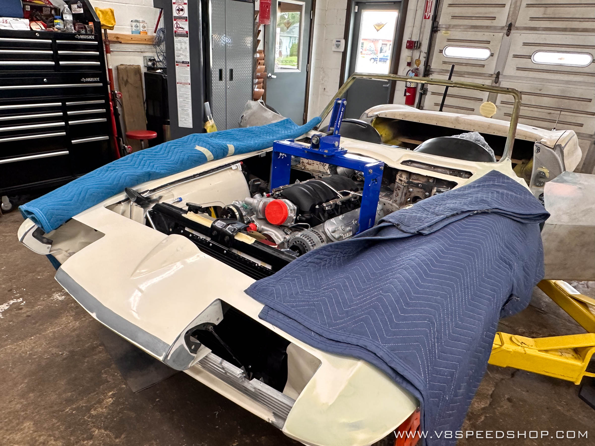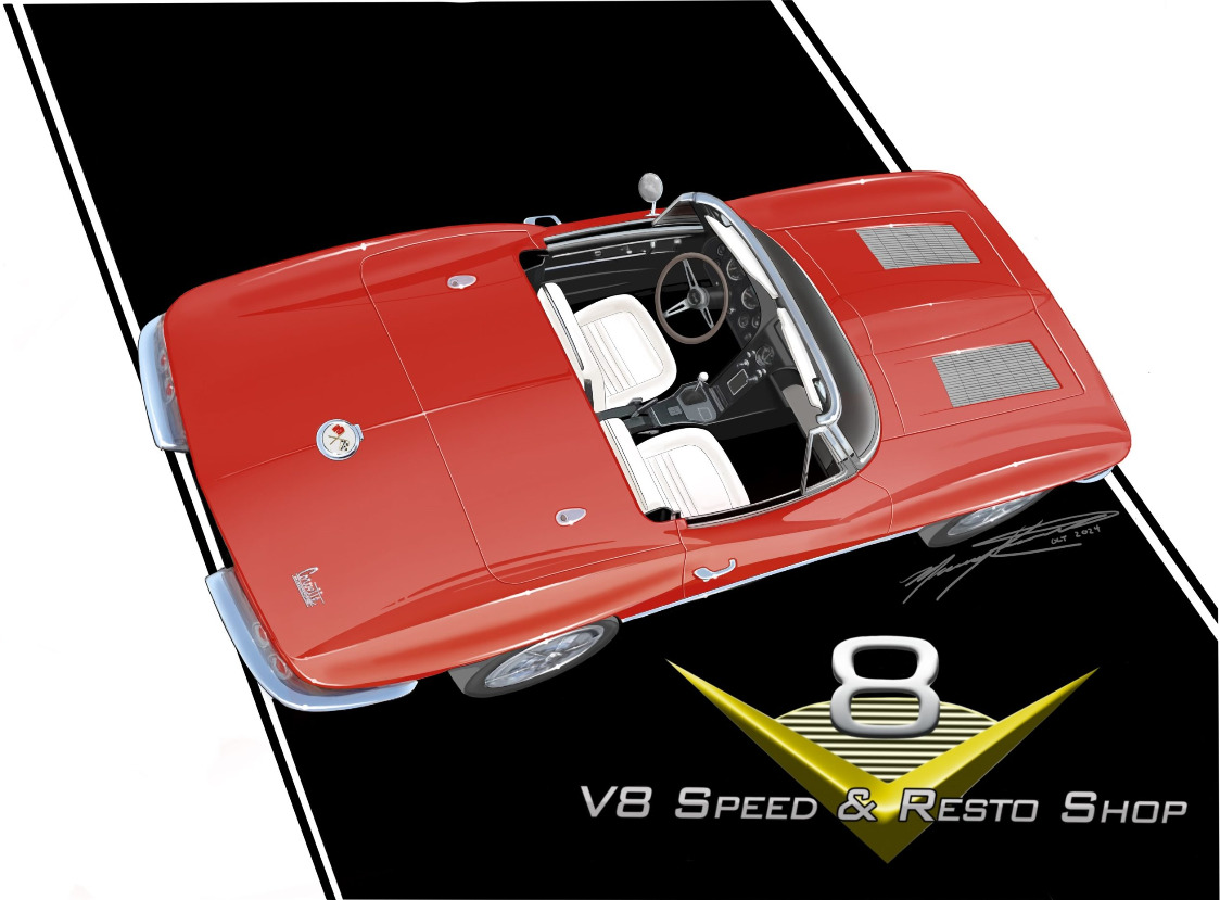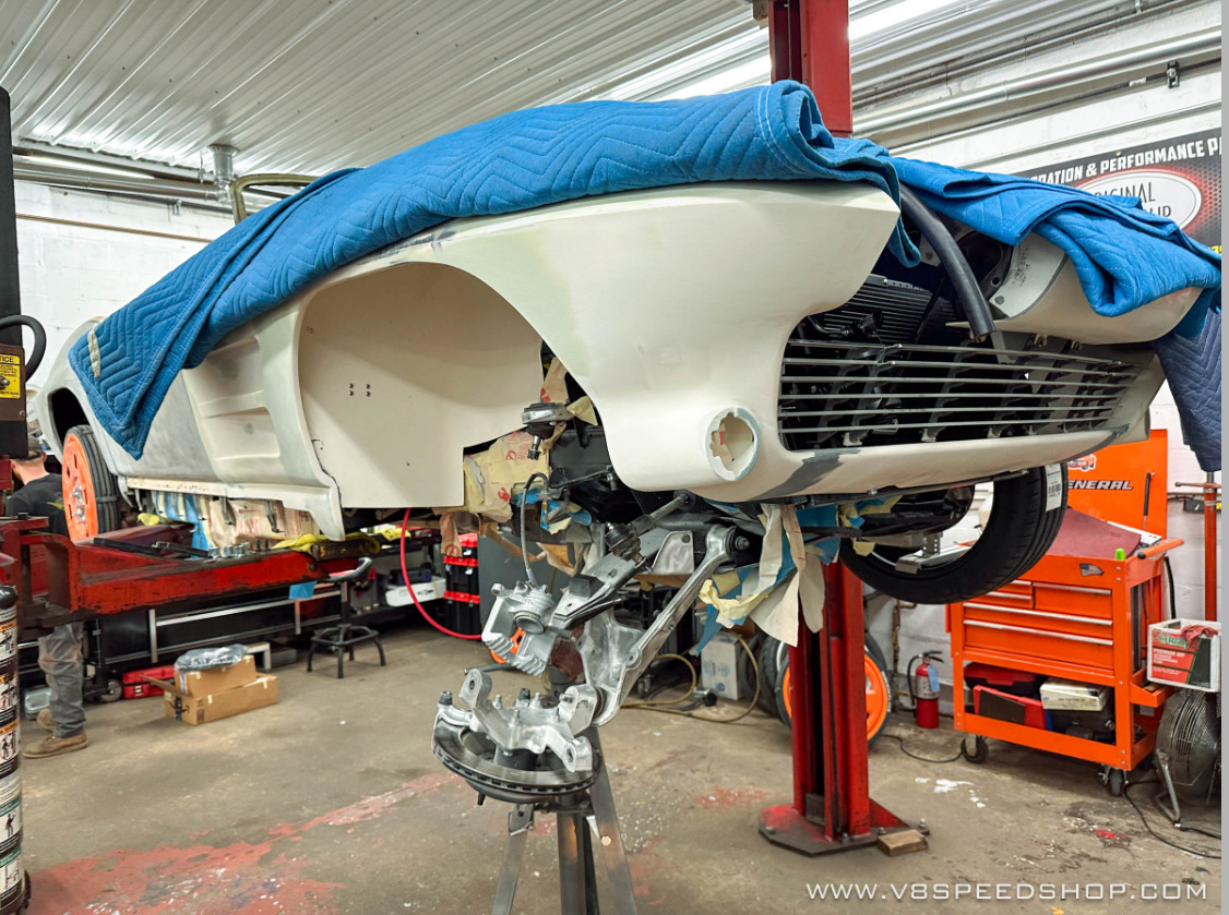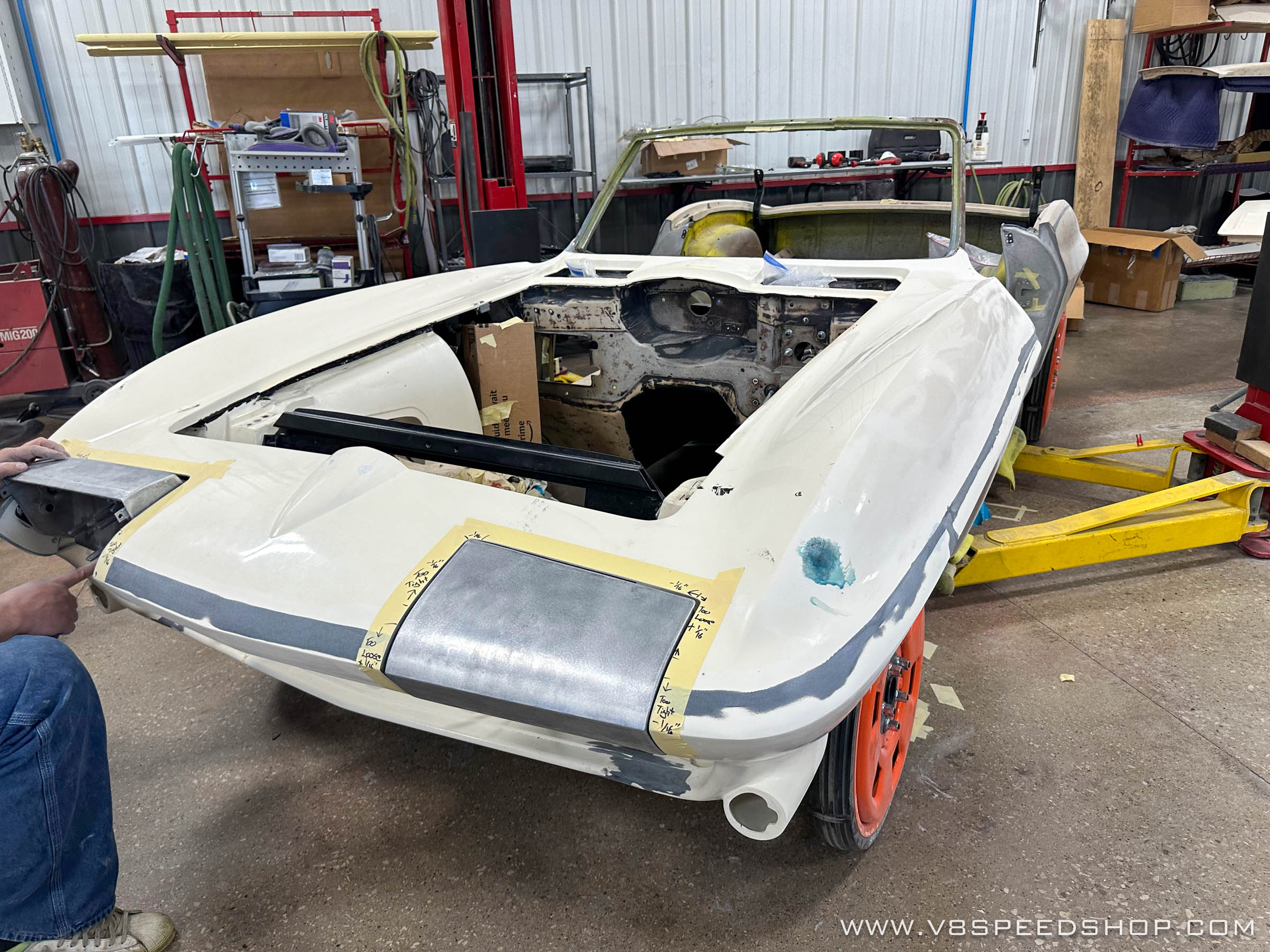 This iconic 1963 Corvette rolled into the V8 Speed and Resto Shop with a the fiberglass body needing some TLC. It’s riding on a custom chassis, and the owner enlisted our team to repair the cracked and damaged original fiberglass body with a new front section, perform other required bodywork, and give it a great looking new paint job.