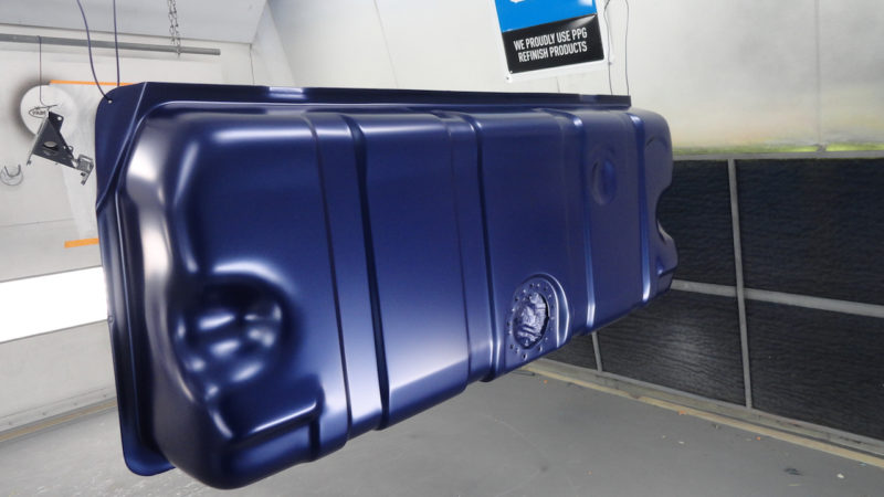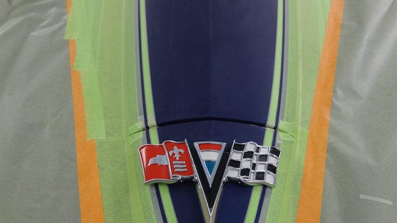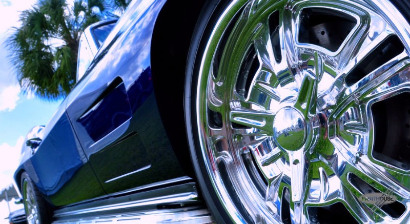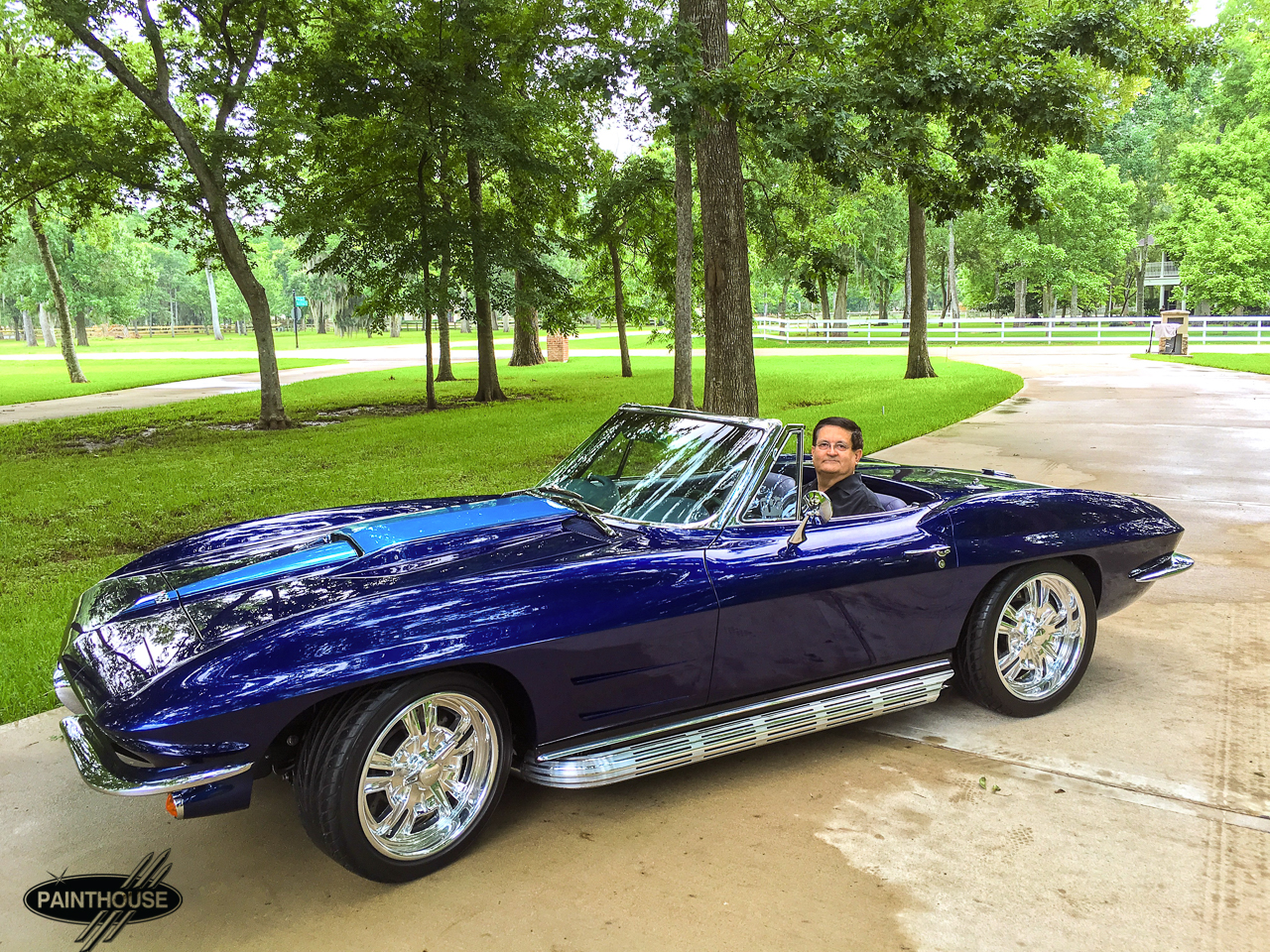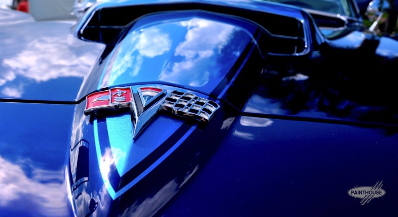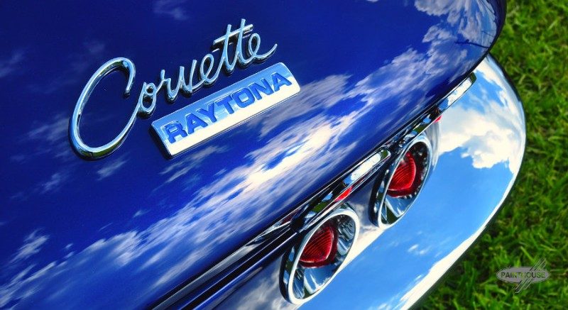 The car has a stock 1963 body and PAINTHOUSE-modified bumpers to better compliment the curves of the car. The refinish system is all PPG, from the first epoxy primer to the final clear coat. The color is a custom-mixed color (Raytona Blue Pearl) mixed by PAINTHOUSE and covered in copious amounts of PPG's 8152 Clear. Oh yeah, about 3,000 man hours of blocksanding and a custom rear belly pan were involved in getting her as straight as she is. Well, maybe not that many, but you get the idea.