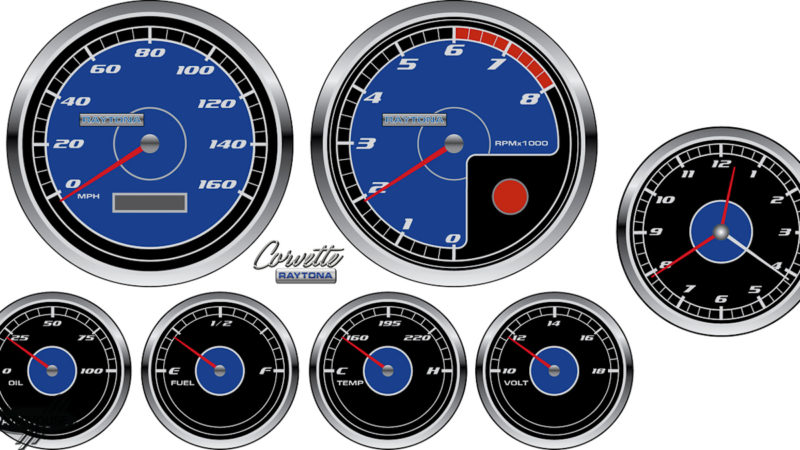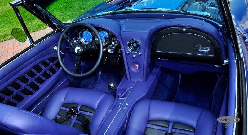 The two-tone interior is styled after the inimitable Daytona Ferrari. It was designed by Eric Brockmeyer and crafted by Paul Atkins. The leather was provided courtesy of several blue & black dead, Italian cows. Eric also designed the gauges and styled them after the newer Ferrari design, with an integrated shift light in the tachometer. The cool inside atmosphere that compliments the cool exterior styling is from Vintage Air. Classic Instruments perfectly replicated the gauges as drawn by Eric Brockmeyer. The car has its restored original hard top in addition to the expected soft top, also covered flawlessly by Paul Atkins and his crew. Custom LED illuminated step plates and “Raytona” badging was handled by Jesse Greening and his staff at Greening Auto Co. The sounds, should you choose to try and not listen to the magical tone of the sidepipes (why?), is supplied via a hidden system driven solely by either an iPhone or iPod. No radio here...