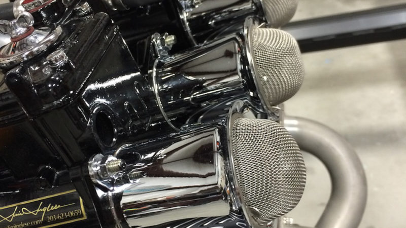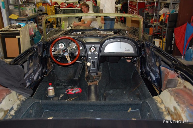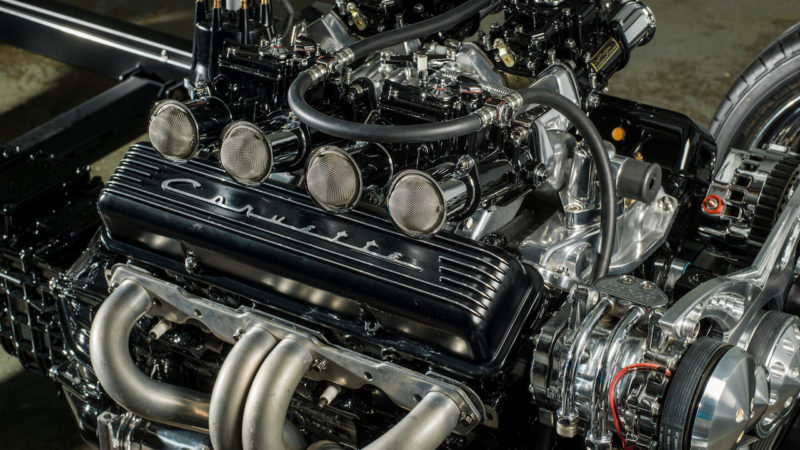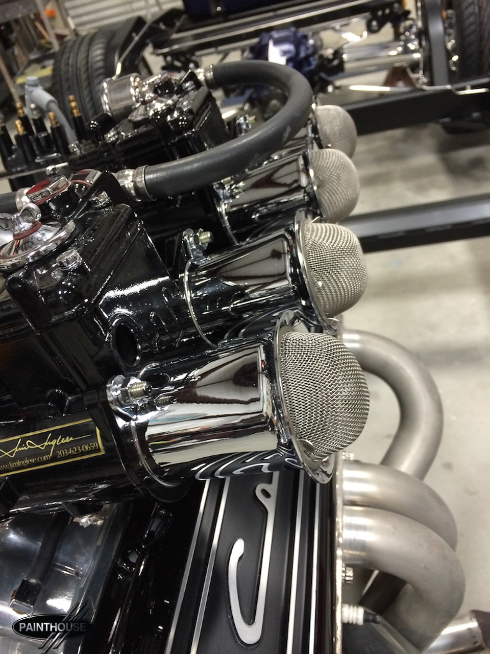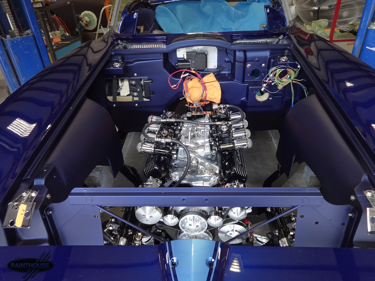 The engine is a 355 small-block Chevy engine with actual Weber 44’s on an Inglese cross ram. Despite my urging to do this system in a more modern fuel-injected style, Steve chose to hold true to the theme of the car and use real Webers. Thanks to Jim Inglese for my ‘over the phone’ education on how to tune the intake system - he was invaluable. The original ’63 Z06 Corvette racecar had a similar induction system when it raced round the tracks of the world and the legendary Ferrari racecars of that era also were inducted via Weber carburetors. It has a March pulley system, Vintage Air cooling and some custom parts made by us at PAINTHOUSE. Lastly, there is also a Tremec 5-speed transmission to connect the driver to the car.