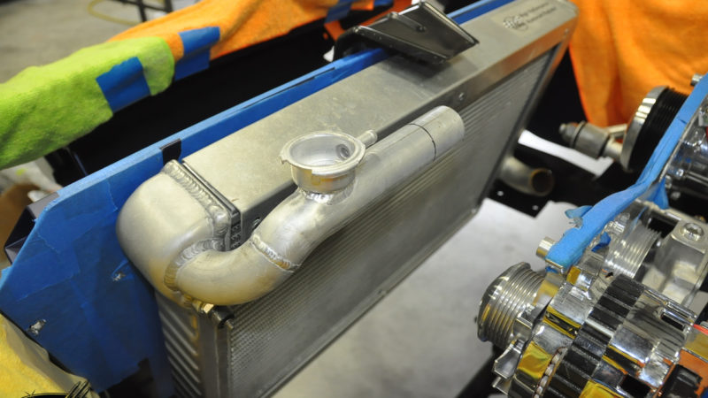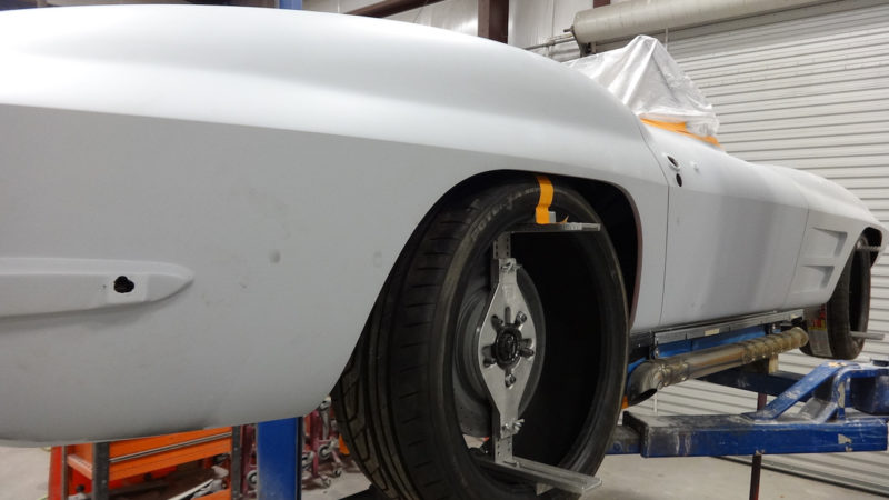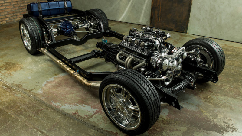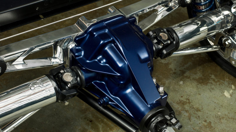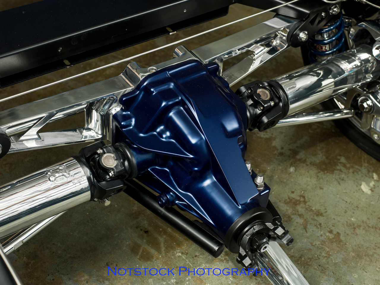 The chassis is a custom unit featuring C-4 suspension components, Coil-over shocks allowing for much greater suspension and ride tuning (instead of the usual mono-leaf Vette springs), C5-style Wilwood brakes 14” rotors, 6-piston calipers) and an electric parking brake. All of the suspension parts are polished aluminum. The gear ratio is 3.50:1, with a Track Lok posi-traction unit inside the Dana 44 Super Duty Differential. I’d rather not give the chassis builder any kudos; he was a pain in our ass.