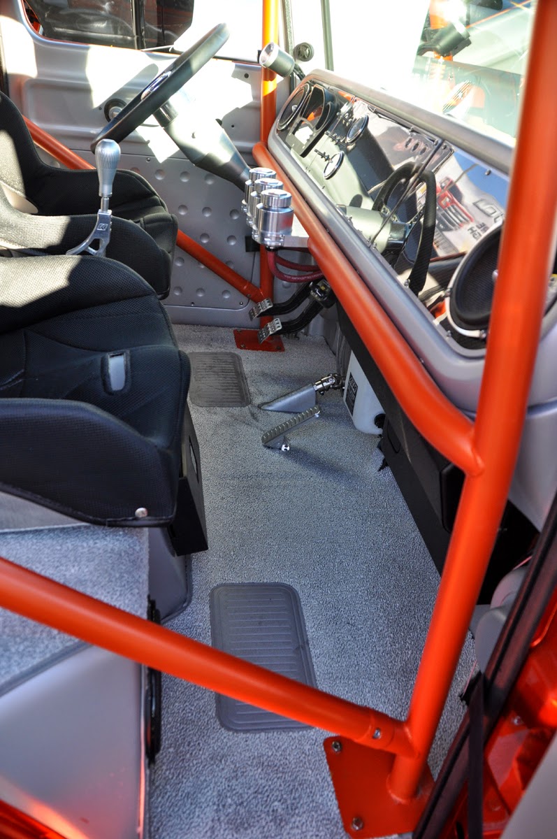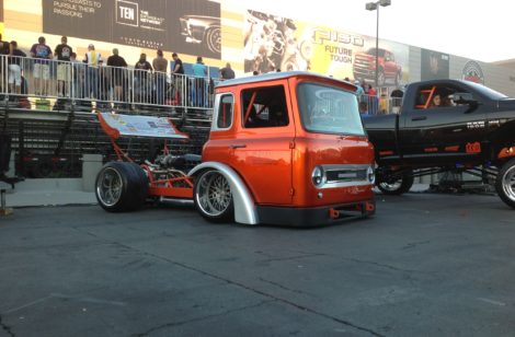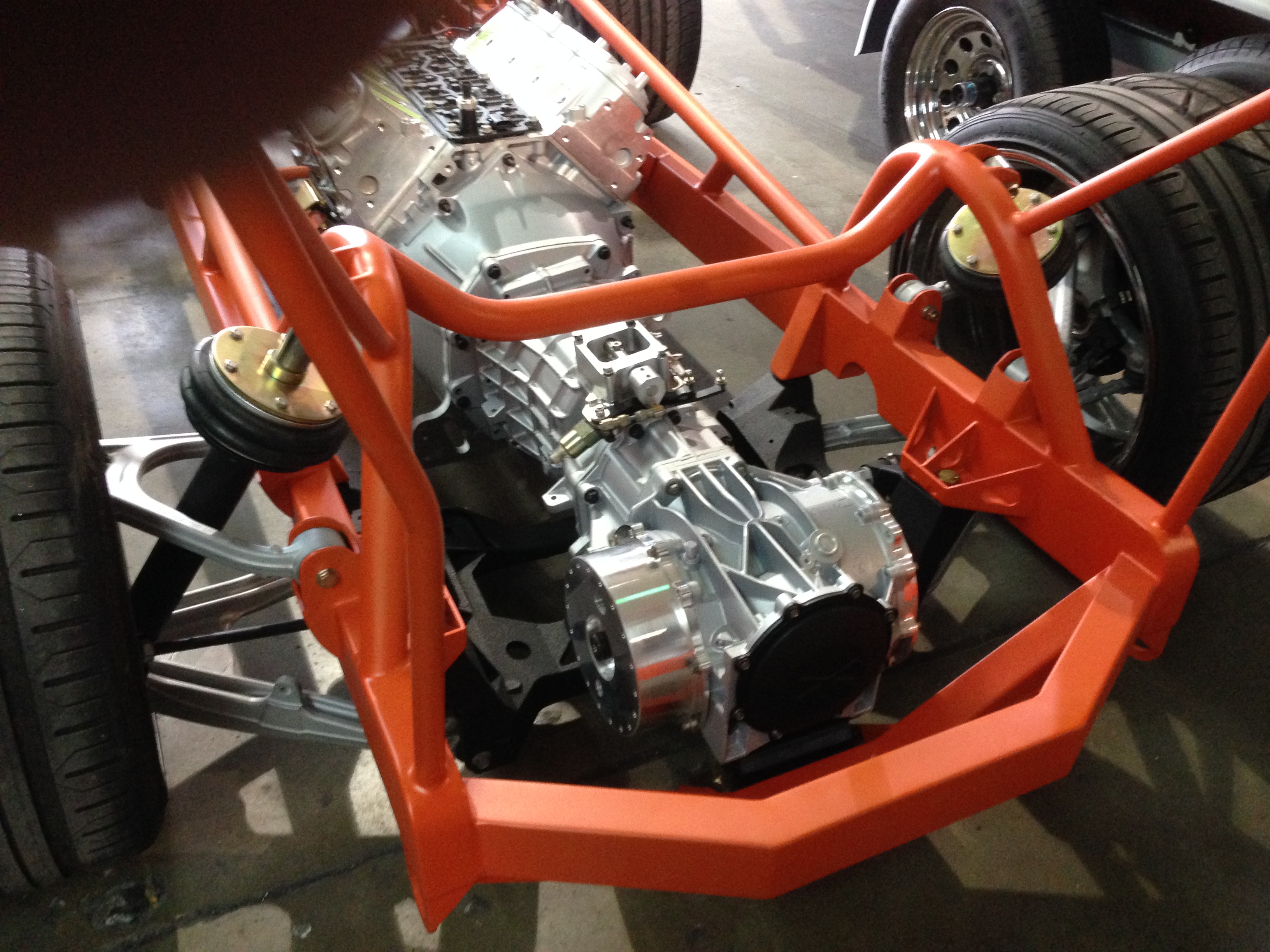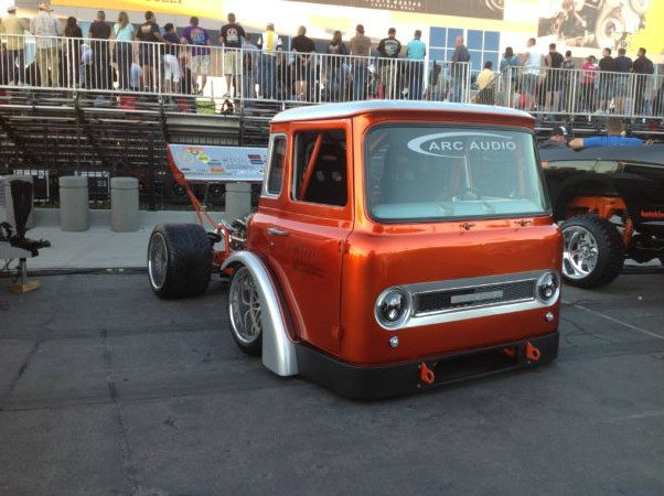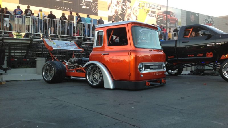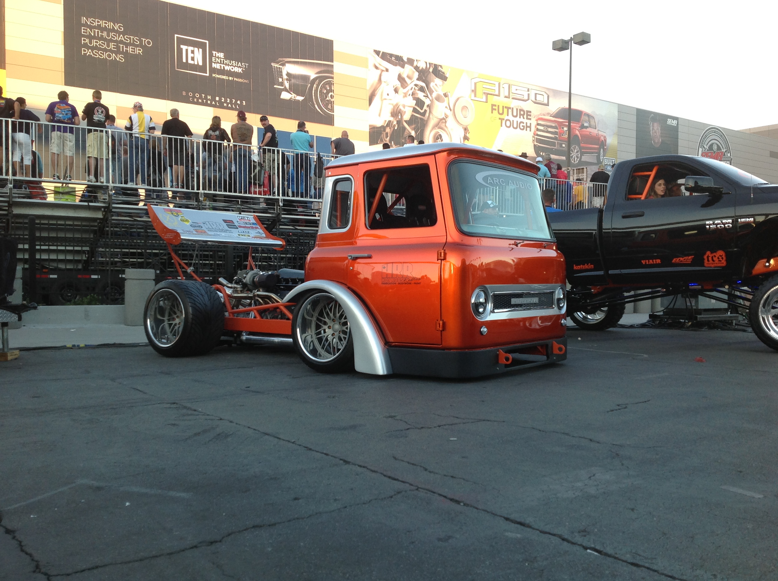 Had been searching for years for a quality cab to build this project. We found one 53 days before SEMA 2014 had the truck shipped and in 47 days built the truck from scratch and delivered it to SEMA. We had a lot of help from a lot of great companies to make this happen. It has C6 suspension front and rear on air ride. Massive Boyd wheels with Mickey Thompson tires. It has our offset drive modified C6 transaxle mated to the back of a 6.0 ltr Ls motor via our components.it is like nothing else out there and feels very odd to roll down the road in!