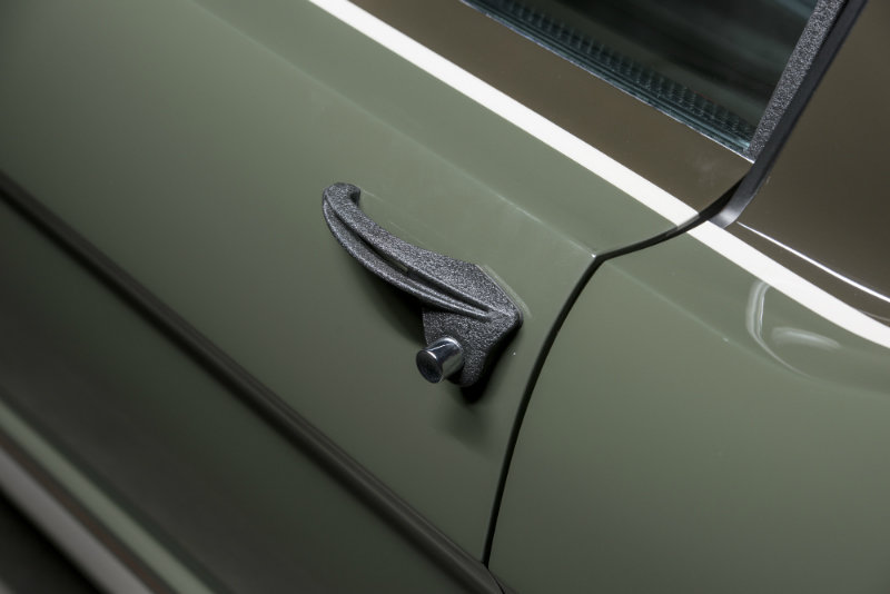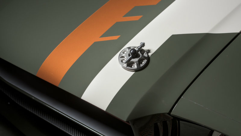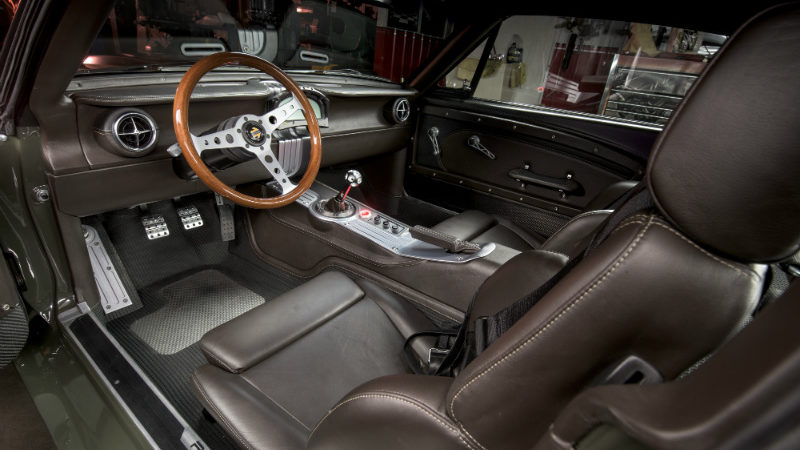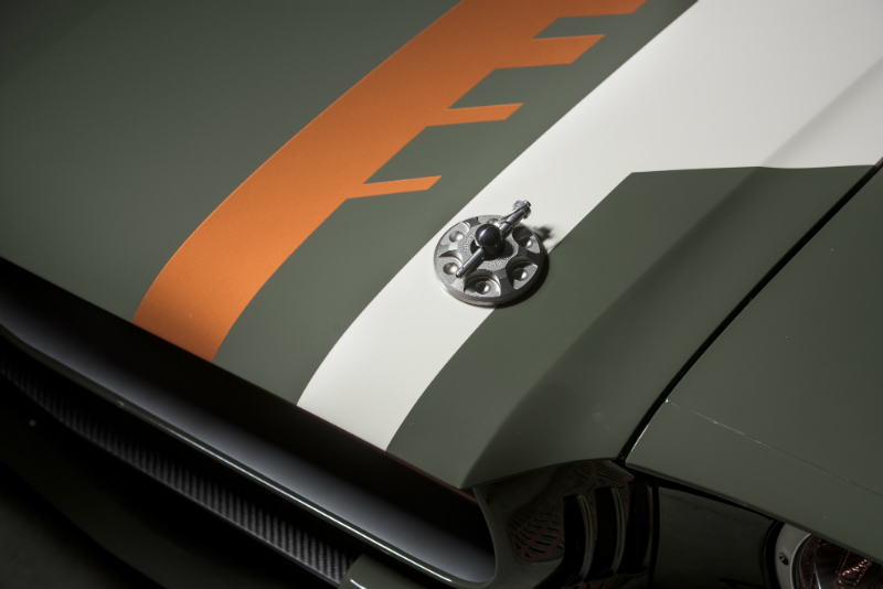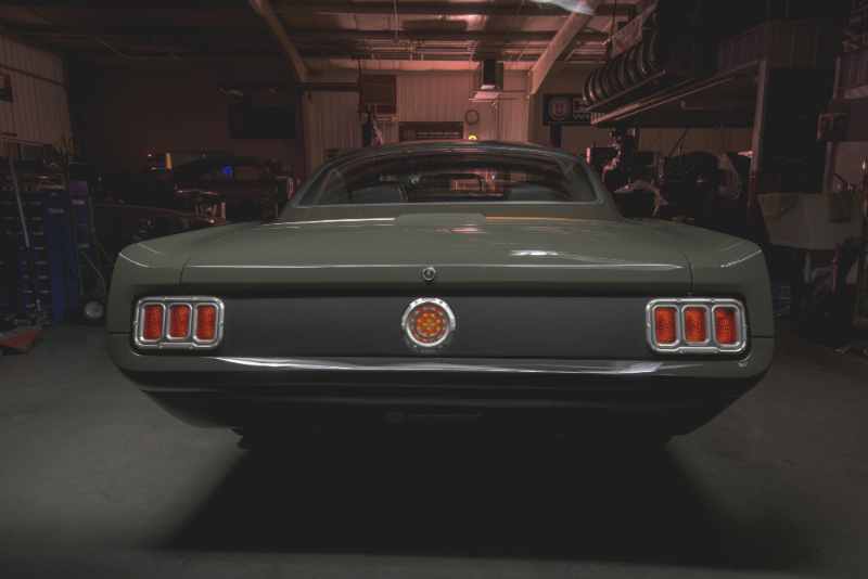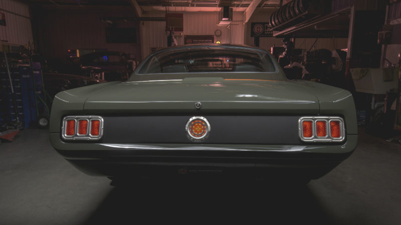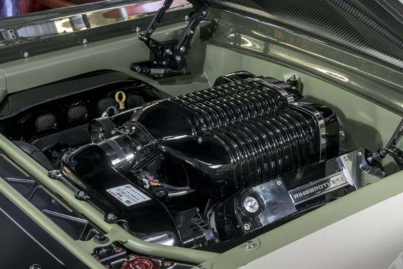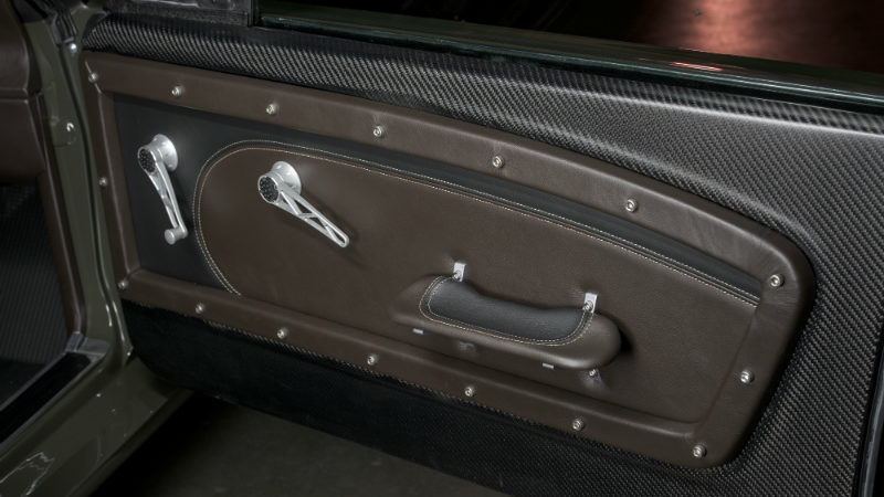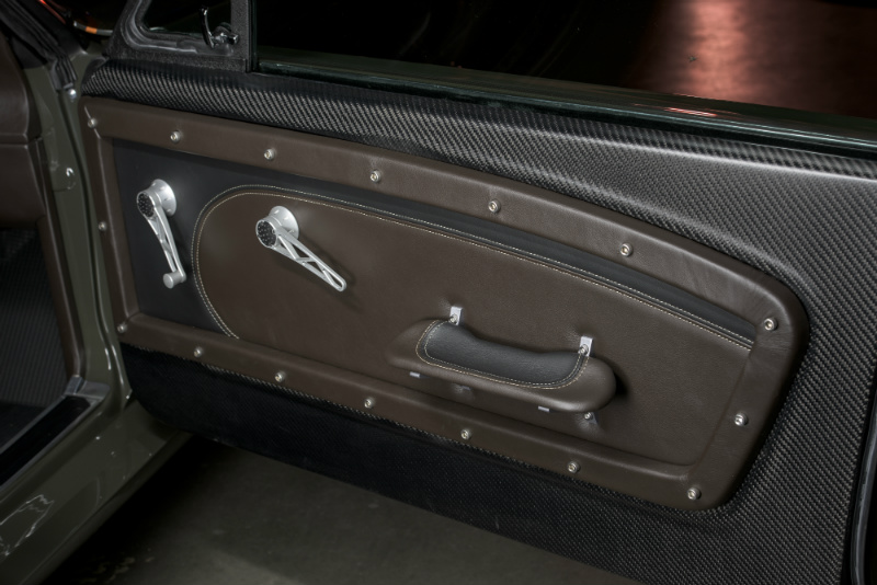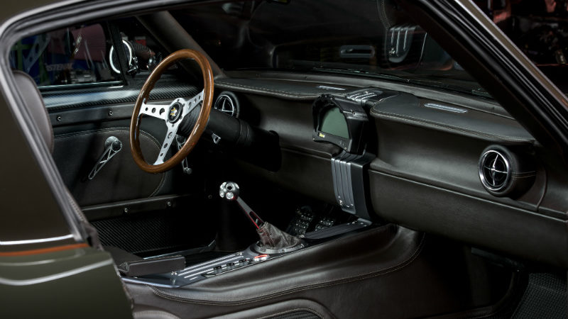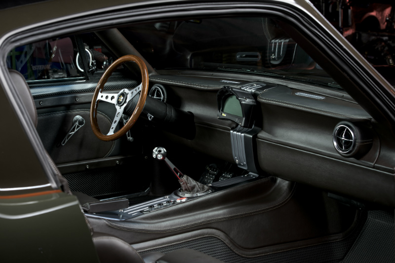 Mike and Jim Ring aren’t strangers when it comes to working with carbon fiber as many of their builds have incorporated it to some degree. Last year’s SEMA standout, the 1966 “Recoil” Chevelle, used it extensively both functionally and aesthetically. Ringbrothers’ familiarity with the exotic material proved to be just the beginning of what has become a master class on carbon. The Rings didn’t just make a “carbon copy” of a ‘65 Fastback though, they took the iconic shape and widened it two inches on each side and made countless other small tweaks to the car that makes it uniquely Ringbrothers. The carbon fiber body work is incognito as the car is finished with the custom BASF Glasurit 90-Line Waterborne paint color aptly named “Spy Green.”