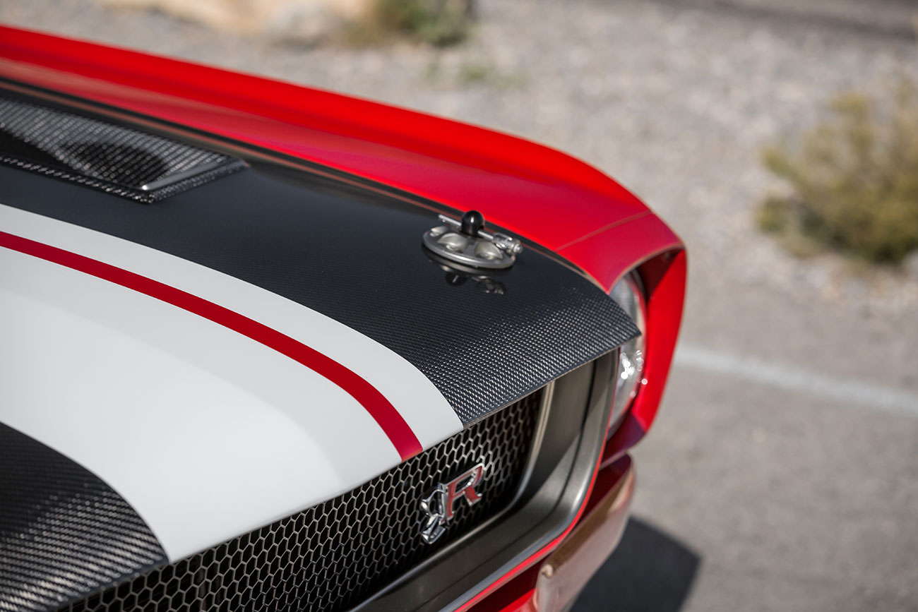 Under the carbon hood, Mike and Jim reworked the engine bay to smooth out the inner apron to make room for a massive 427 cubic inch engine from Ford Racing. The engine is fed its diet of air and fuel through an elaborate custom airbox of the Ring’s design. The airbox is crafted from a combination of aluminum and Lexan which allows viewers to look down the throat of the throttle body and see the MSD Atomic fuel injection system. Power from the engine is fed back into a Tremec T56 six speed manual transmission by Bowler and filled with Royal Purple Manual Transmission Fluid to keep the transmission working at peak efficiency. To ensure the best driving experience, a Centerforce DYAD Twin-Disc Clutch was chosen for its smooth engagement and light pedal effort. Exhaust is funneled out by way of custom Ringbrothers headers with 1.5” primaries and into a custom exhaust system with Flowmaster Super 44 Mufflers.
