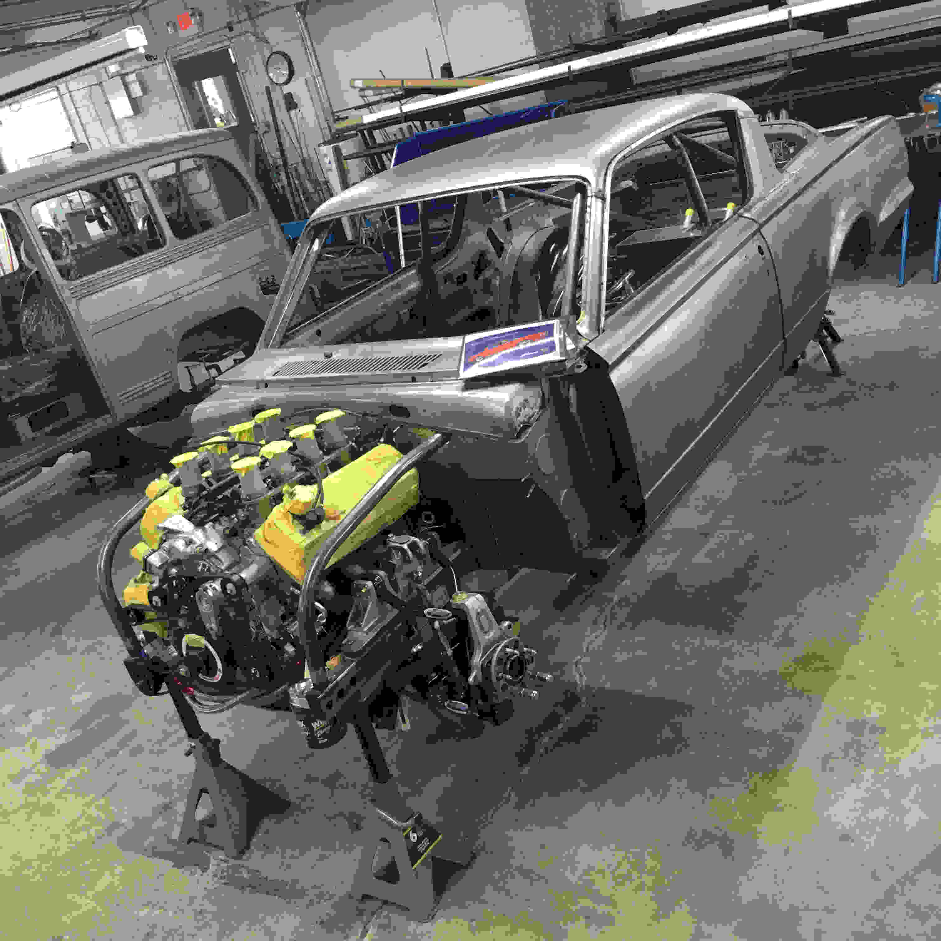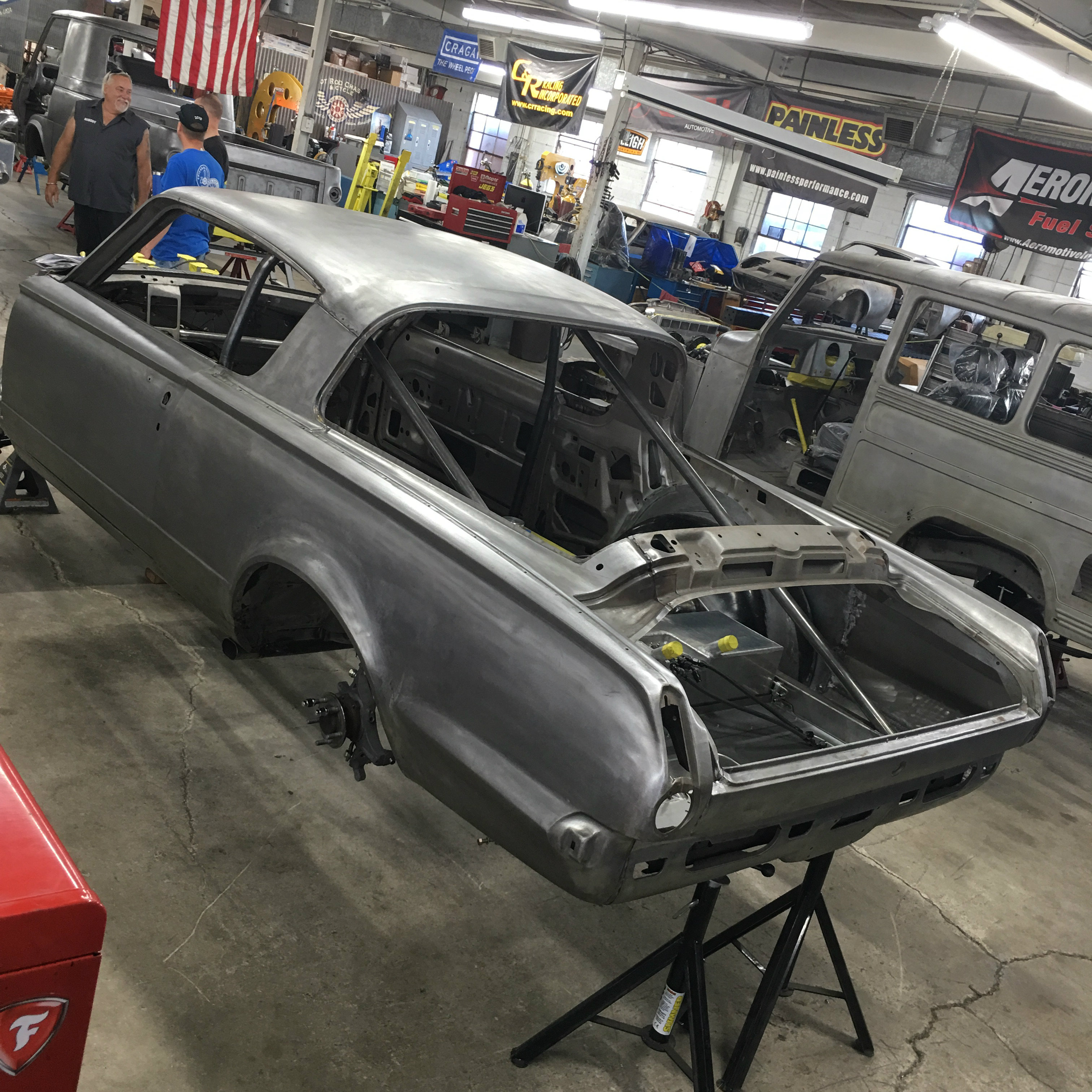 Full Hot Rod Chassis & Cycle Chassis road racing based, 1965 Barracuda features Detroit Speed "Alumaframe" front suspension, custom wheel openings, a complete rectangular steel tubing chassis designed and built by Hot Rod Chassis & Cycle. Hot Rod Chassis & Cycle integrated the Alumaframe system into the chassis, and designed and built the wheel openings and dashboard with Stewart Warner gauges. C&R Racing custom cooling package, Hot Rod Chassis & Cycle Interceptor IRS with Hammerhead differential and cooling system, including heat exchanger, pump, piping, and controls that were desgined and built by hot Rod Chassis & Cycle. Recaro Seats, Valspar Paint, Halteck ECU, Viking Berserker, Tremec 6-speed transmission with a Pfitner Performance gearbox sequential conversion, ASM computer controlled shocks, Forgeline wheels, Alcon Touring car brake package, Indy Cylinder Head twin plug 433 Gen III Hemi with a Hilborn EFI Injection, the dry sump, oil system, including 4-stage scavenging pump, remote reseroir, venting system, and supply and return lines from engine to reservoir integrated into the frame rails, was designed and built by Hot Rod Chassis and Cycle.
