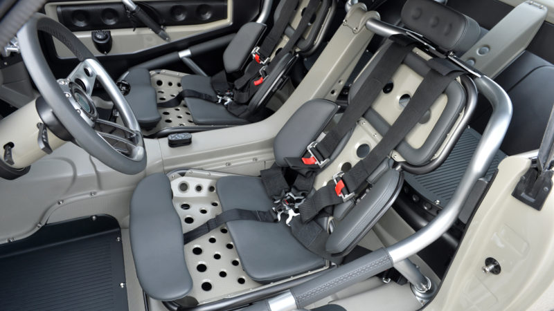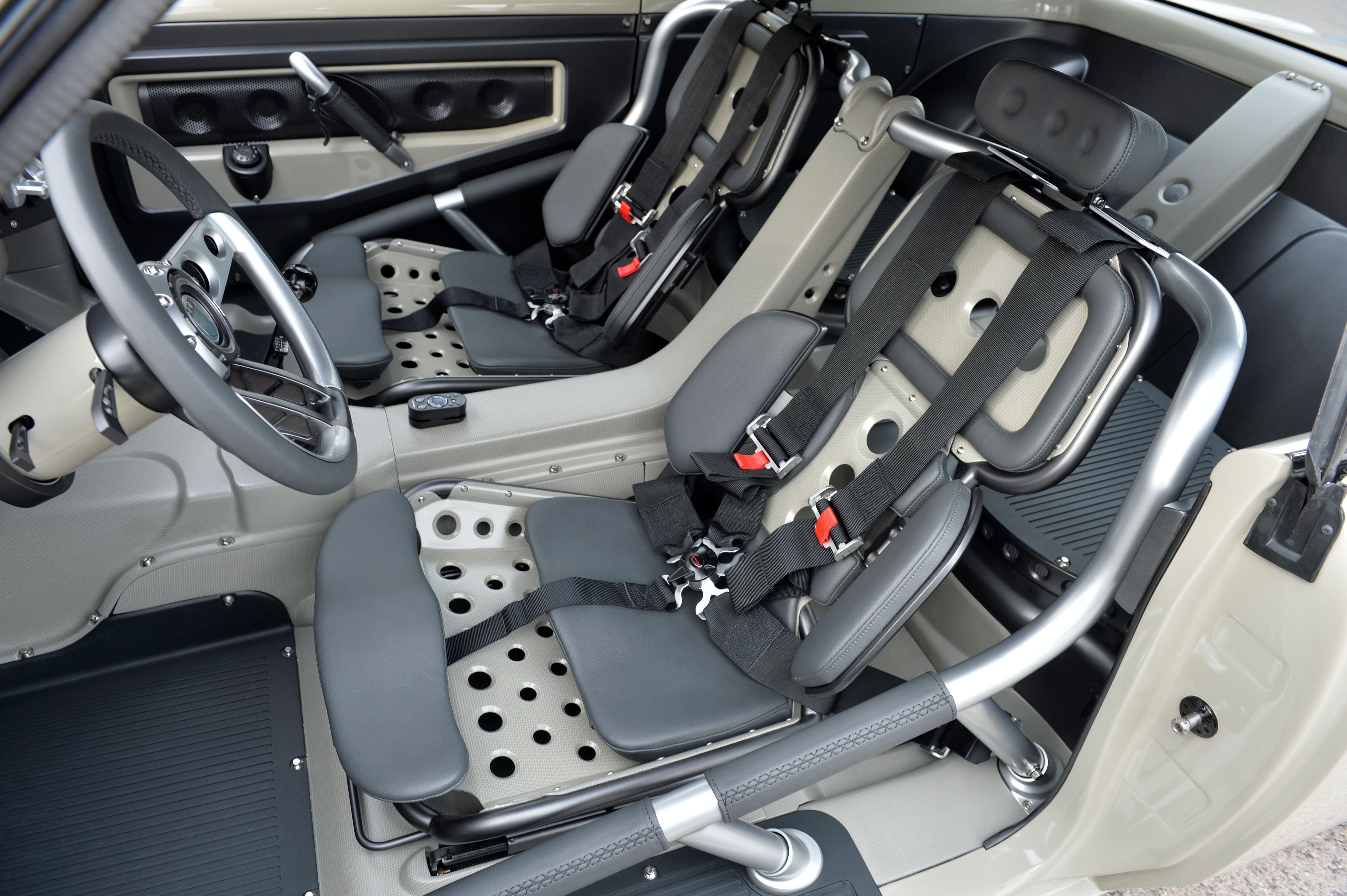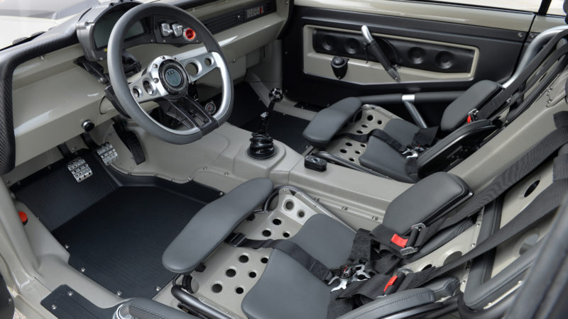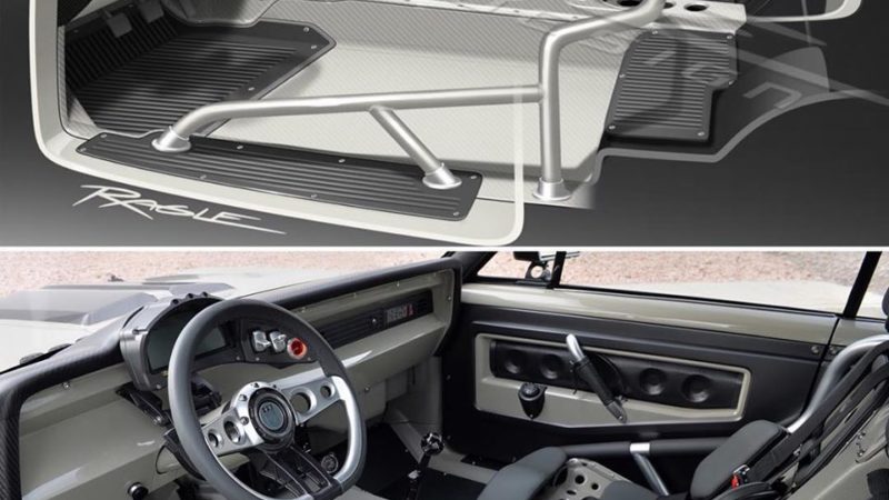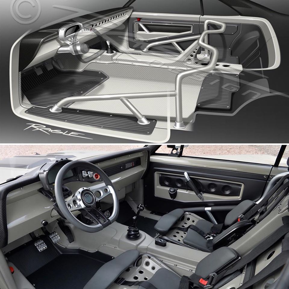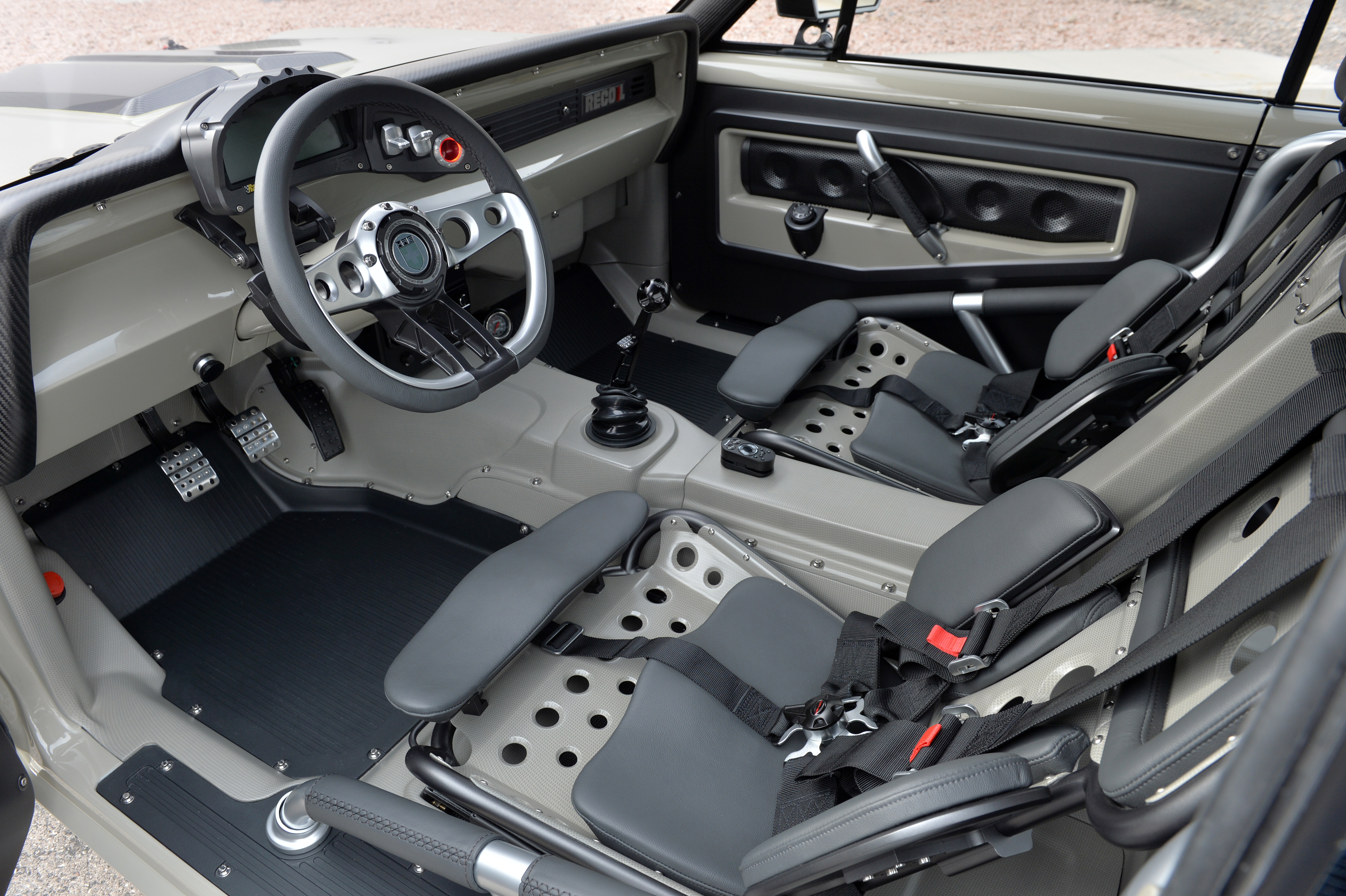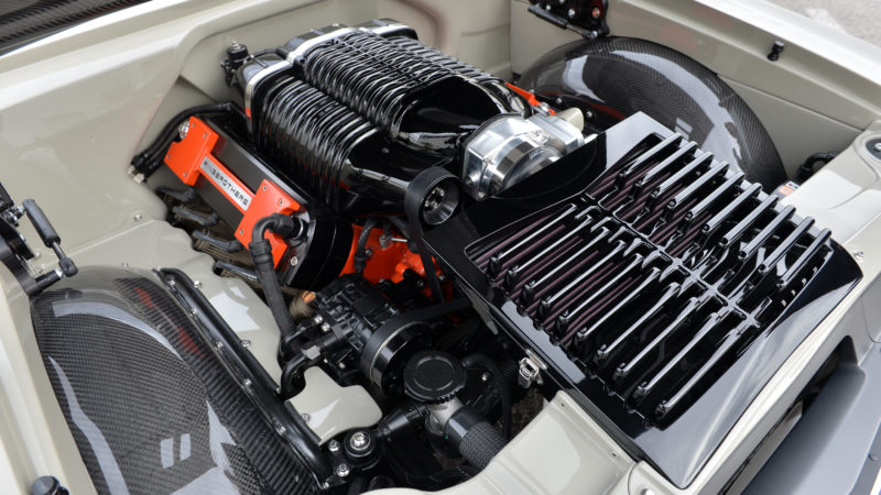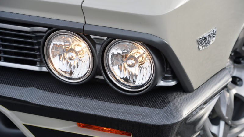 “Recoil” is finished in a custom BASF Glasurit 90-Line Waterborne paint color named “Sand Storm,” and is adorned with custom, hand-laid carbon fiber panels and trim pieces that show off the highly detailed fit and finish Ringbrothers is known for. The carbon fiber cloth used on the parts for “Recoil” is from the Mirage® line of materials that are custom designed by Composite Envisions. This material is a hybrid of high strength, aerospace grade carbon fiber and a beautiful pure silver plated copper wire.