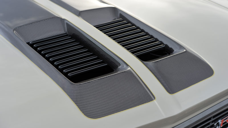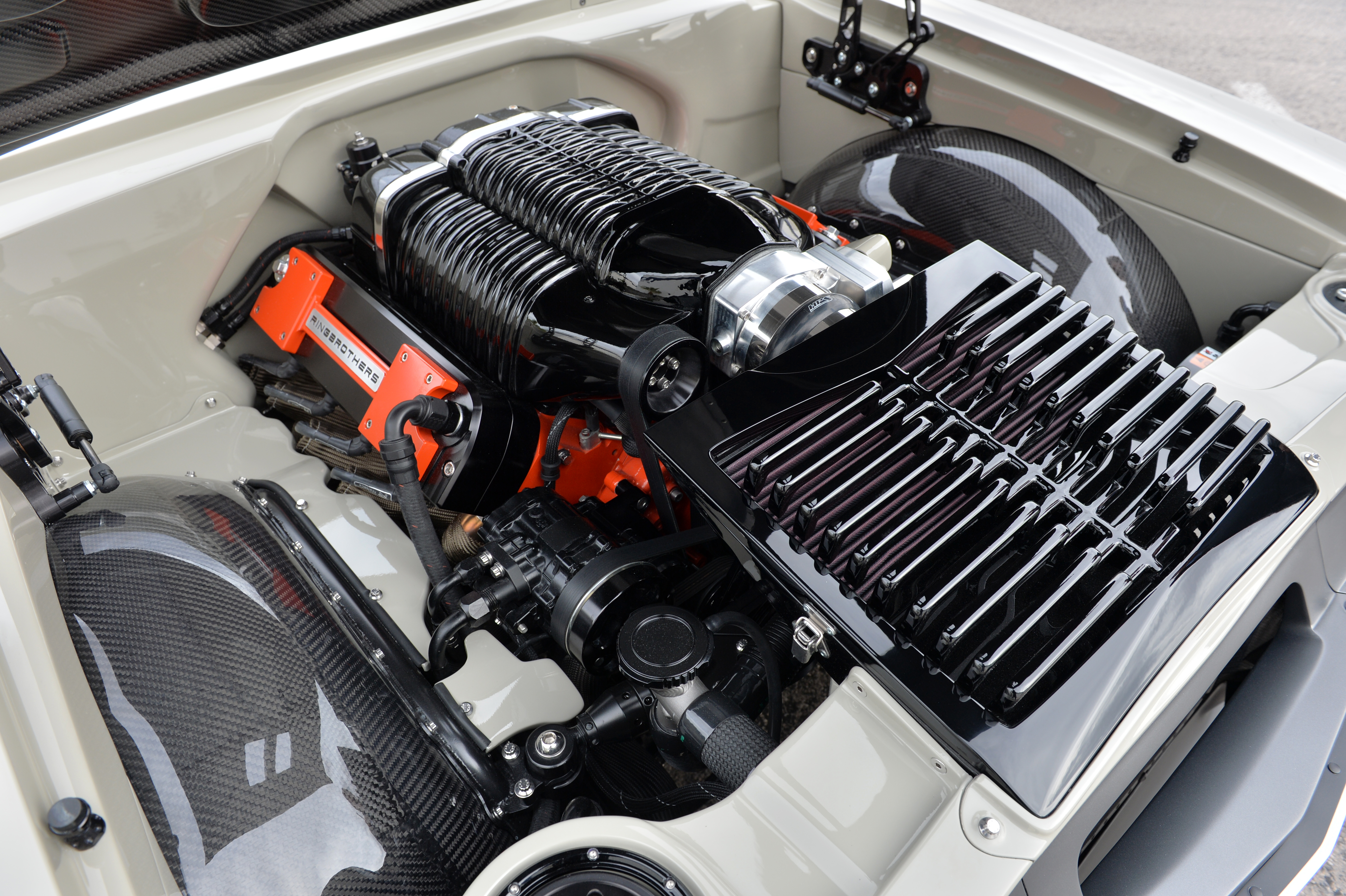 The interior of the Chevelle is completely race-ready and is designed with form over function in mind. The entire interior was fabricated by hand from sheet metal and several interior pieces were meticulously hydro-dipped to match the carbon fiber found throughout the car. Five point racing harnesses keep you firmly planted in the custom crafted seats while a Racepak gauge cluster in a custom Ringbrothers billet housing displays all of the information the driver needs to go fast while keeping tabs on the car’s vital signs.