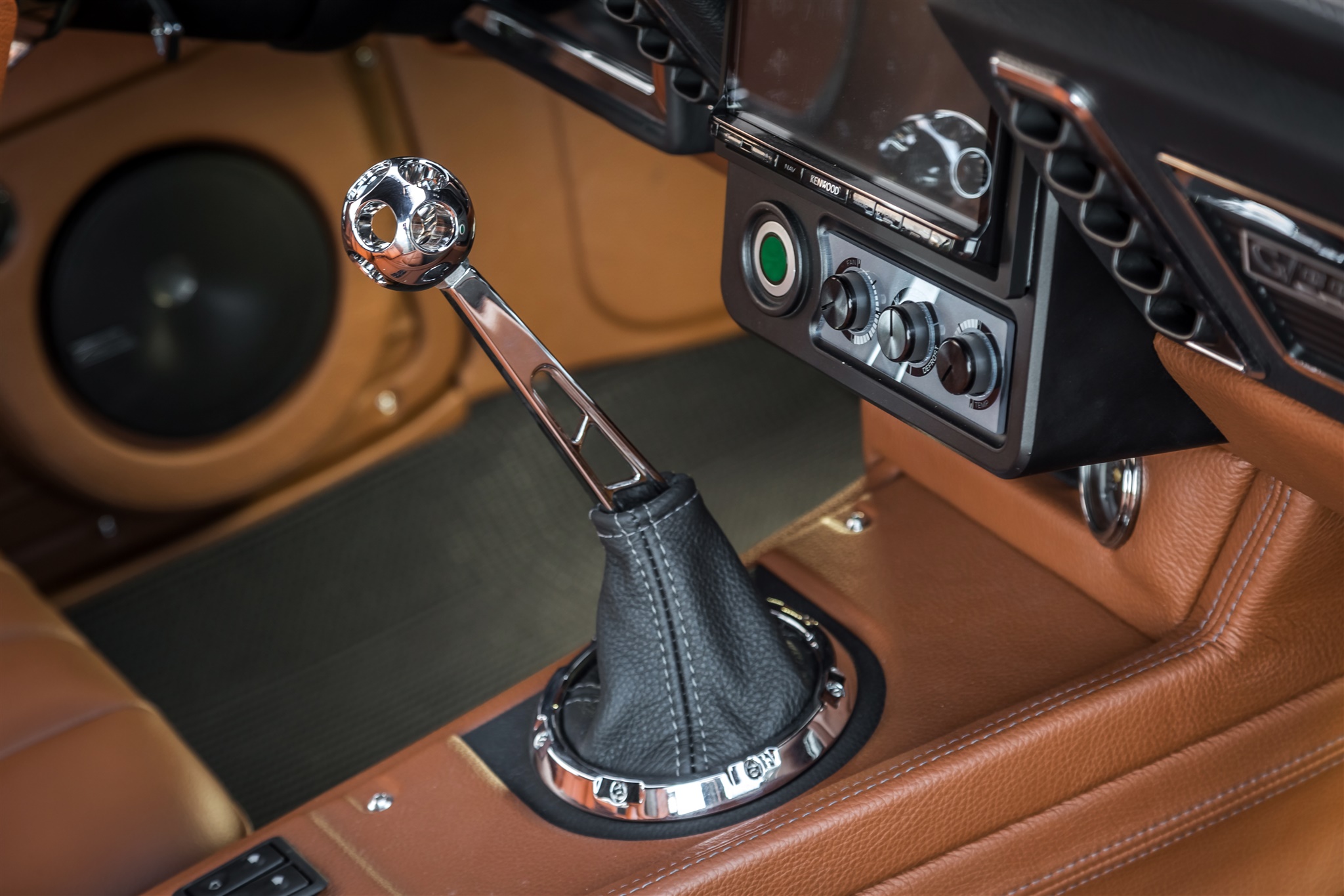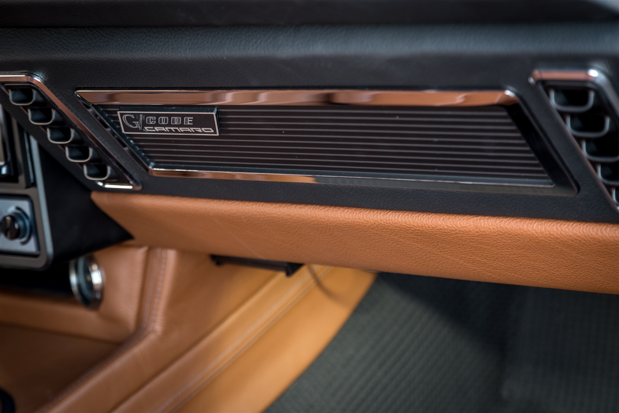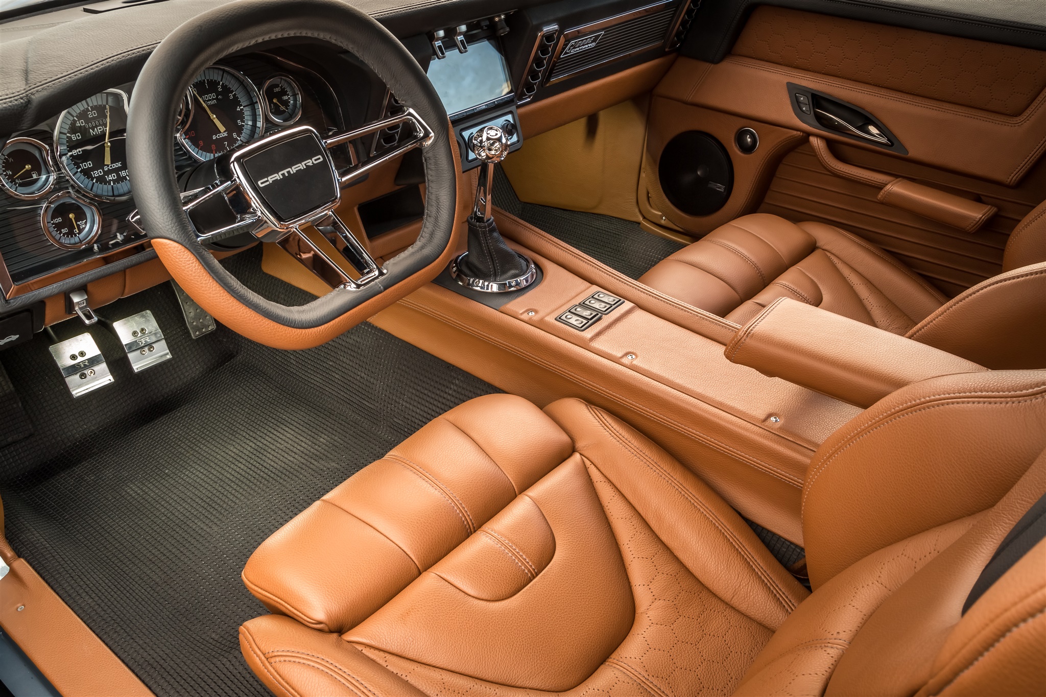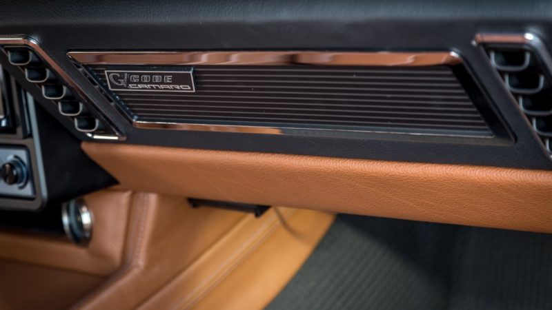 The cabin of the first generation Camaro was carefully designed with driver comfort in mind. The interior upholstery was custom crafted by Upholstery Unlimited and is kept at the perfect temperature with a Vintage Air climate control system.