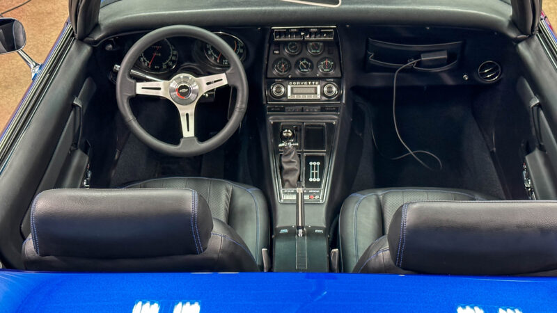 - Show-Stopping Paint: The original paint job was replaced with a stunning custom blue chosen by the owner. A red-outlined metallic charcoal stripe enhances the deep blue body. The flawless finish and meticulous application make this Corvette a real head-turner.